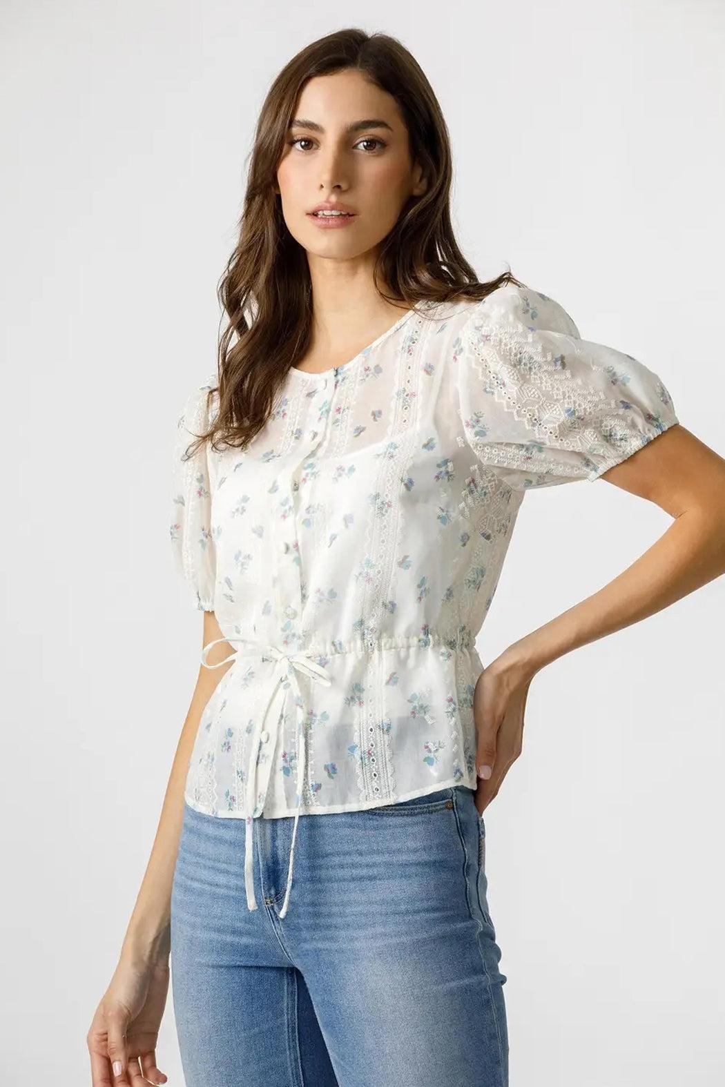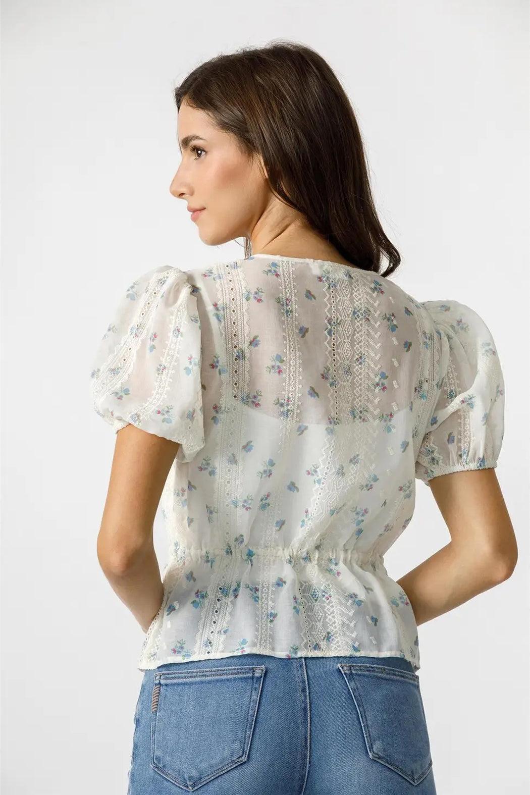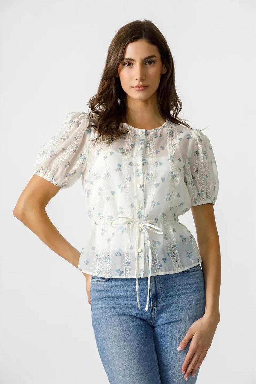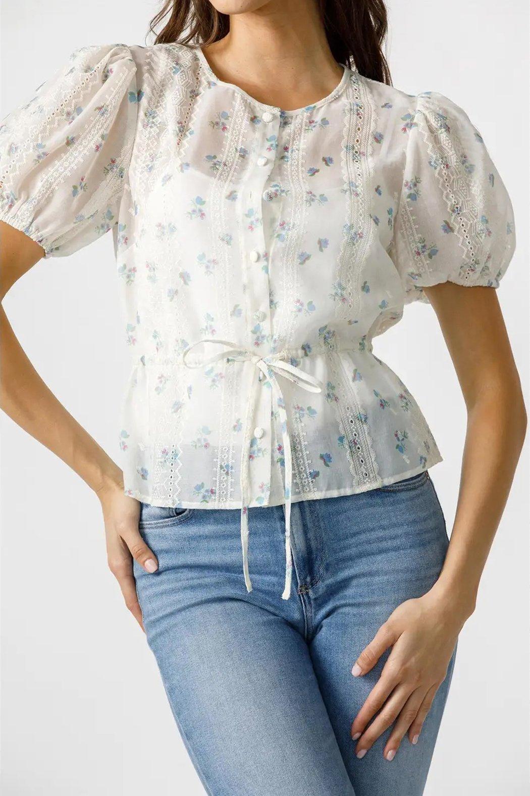 This delicate floral blouse is crafted from a sheer fabric adorned with petite floral prints, features include intricate lace details along the bodice, puff sleeves, a button-down front, and a cinched waist with a dainty adjustable tie, this top offers a flattering silhouette and is lined with a white tank.