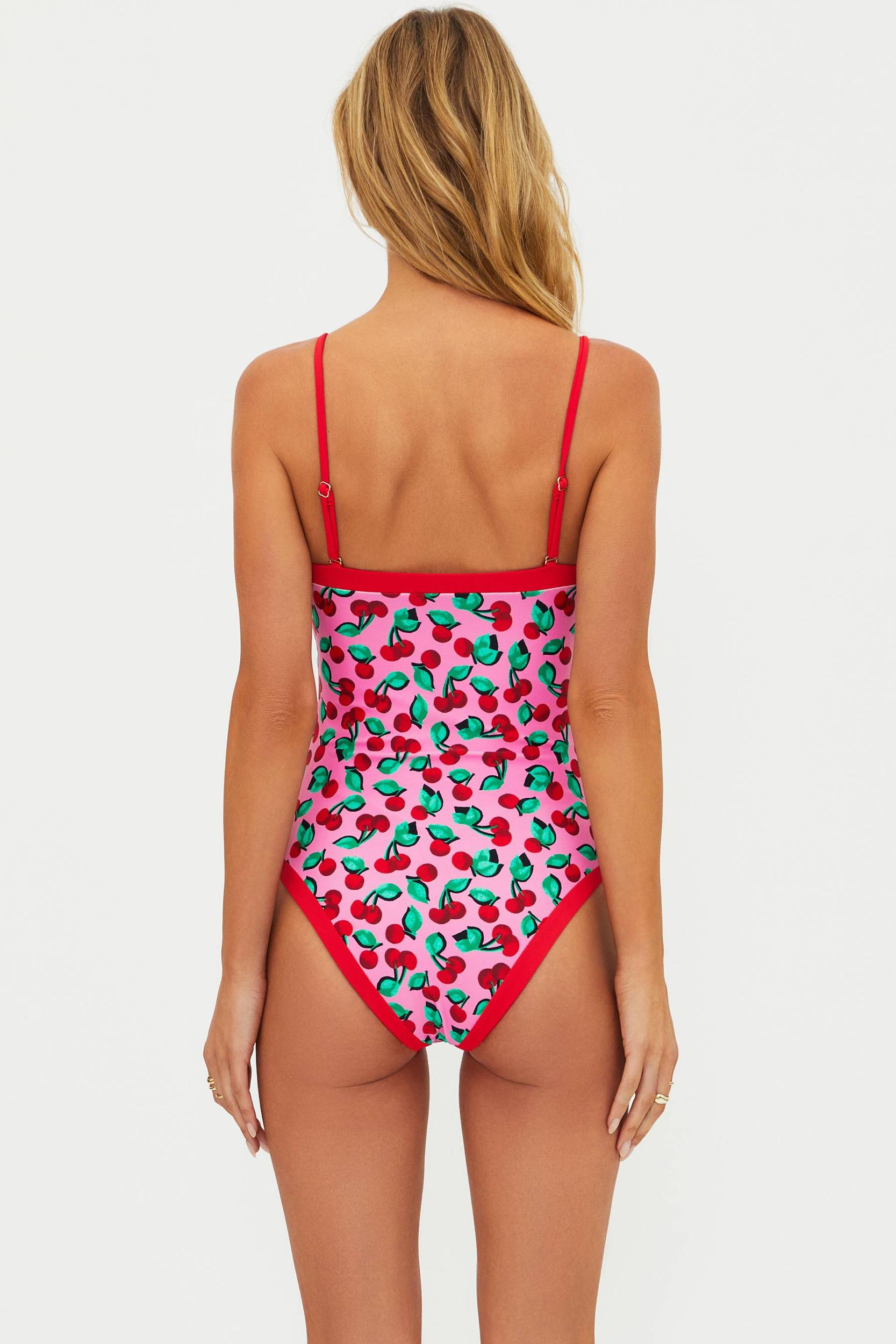 Flattering straight neckline for a clean, modern silhouette Adjustable, removable spaghetti straps for a customizable fit Removable soft cups Pink fabric with allover cherry print Moderate coverage Style Tip: Wear it strapless for a sleek, sun-kissed look, or add the straps and throw on high-waisted denim shorts for an easy beach-to-boardwalk moment. Model is wearing size small