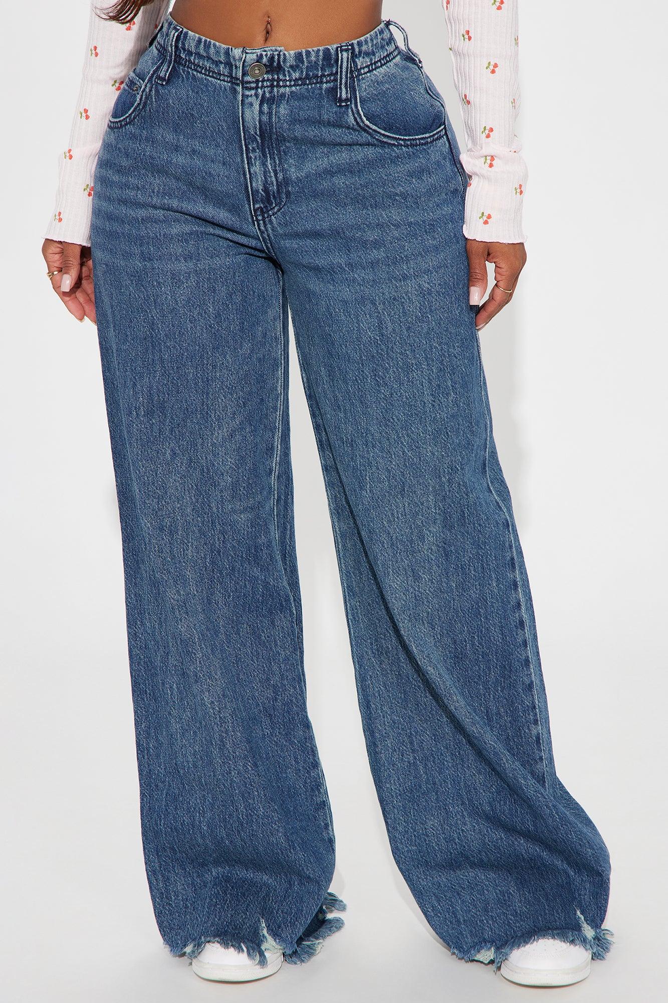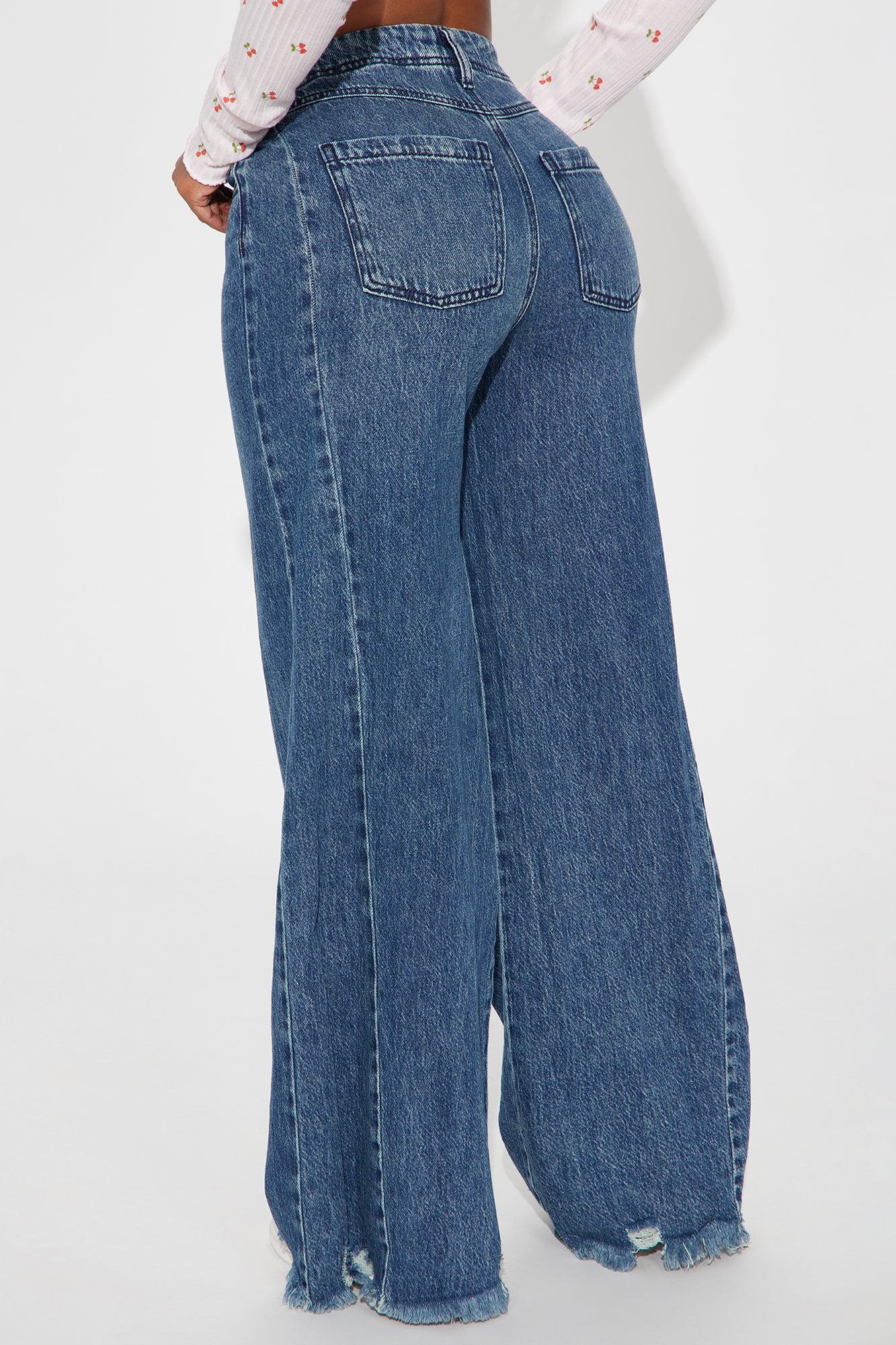 Available In Dark Wash. Wide Leg Jean 5 Pocket Relaxed Fit Raw Hem 10.5" High Rise 32" Inseam Non Stretch Disclaimer: Due To The Specialized Wash & Distressing Process, Each Garment Is Unique 85% Cotton 15% Lyocell Imported California Proposition 65 WARNING: Cancer and Reproductive Harm - www.P65Warnings.ca.gov.