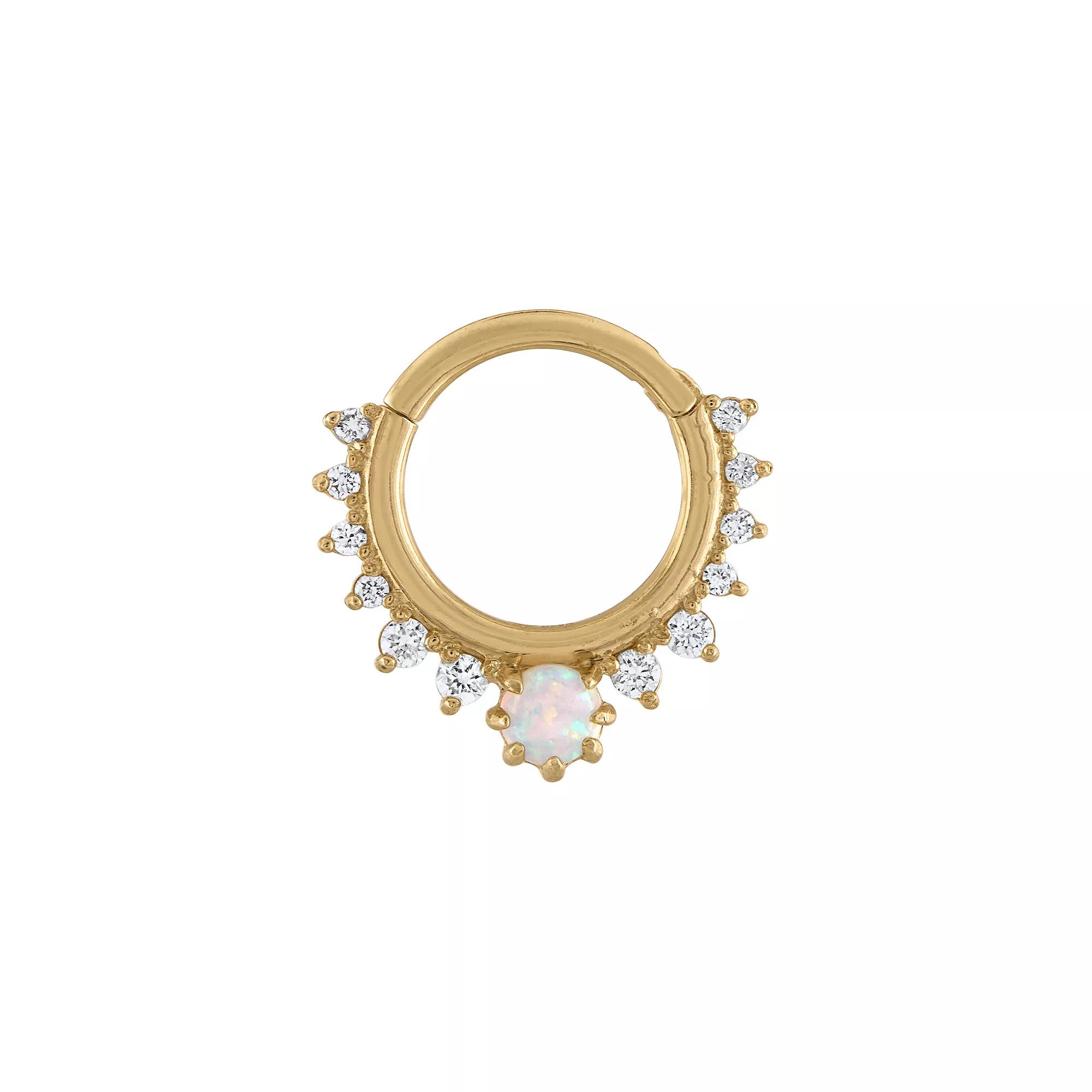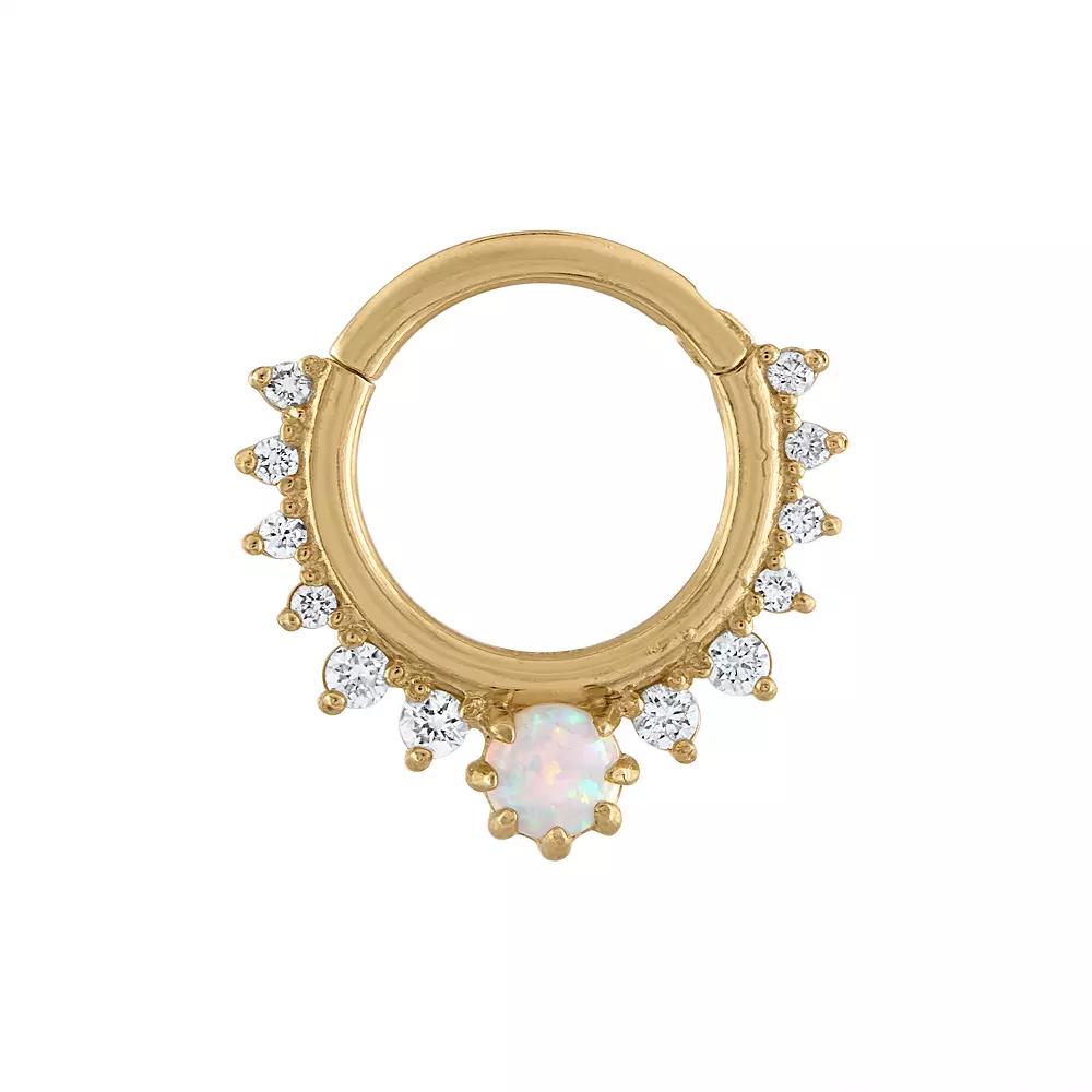 Refresh your favorite piercing with this Amella Jewels 14k Gold White Opal & Diamond Accent Septum Ring. Click on this JEWELRY & WATCHES GUIDE to learn about fit, styles, materials and more! Refresh your favorite piercing with this Amella Jewels 14k Gold White Opal & Diamond Accent Septum Ring. Click on this JEWELRY & WATCHES GUIDE to learn about fit, styles, materials and more! FEATURES Gauge: 16g Inner Diameter: 8 mm Nickel free Metal: 14k gold Finish: polished Packaging: velvety pouchSTONE DETAILS Stone type: white opal Stone size: 3 mm Shape: roundDIAMOND DETAILS Total weight: less than 1/10 ct. Color grade: H-I Clarity: SI1 Shape: round Setting: prong Color: Yellow. Gender: female. Age Group: adult.