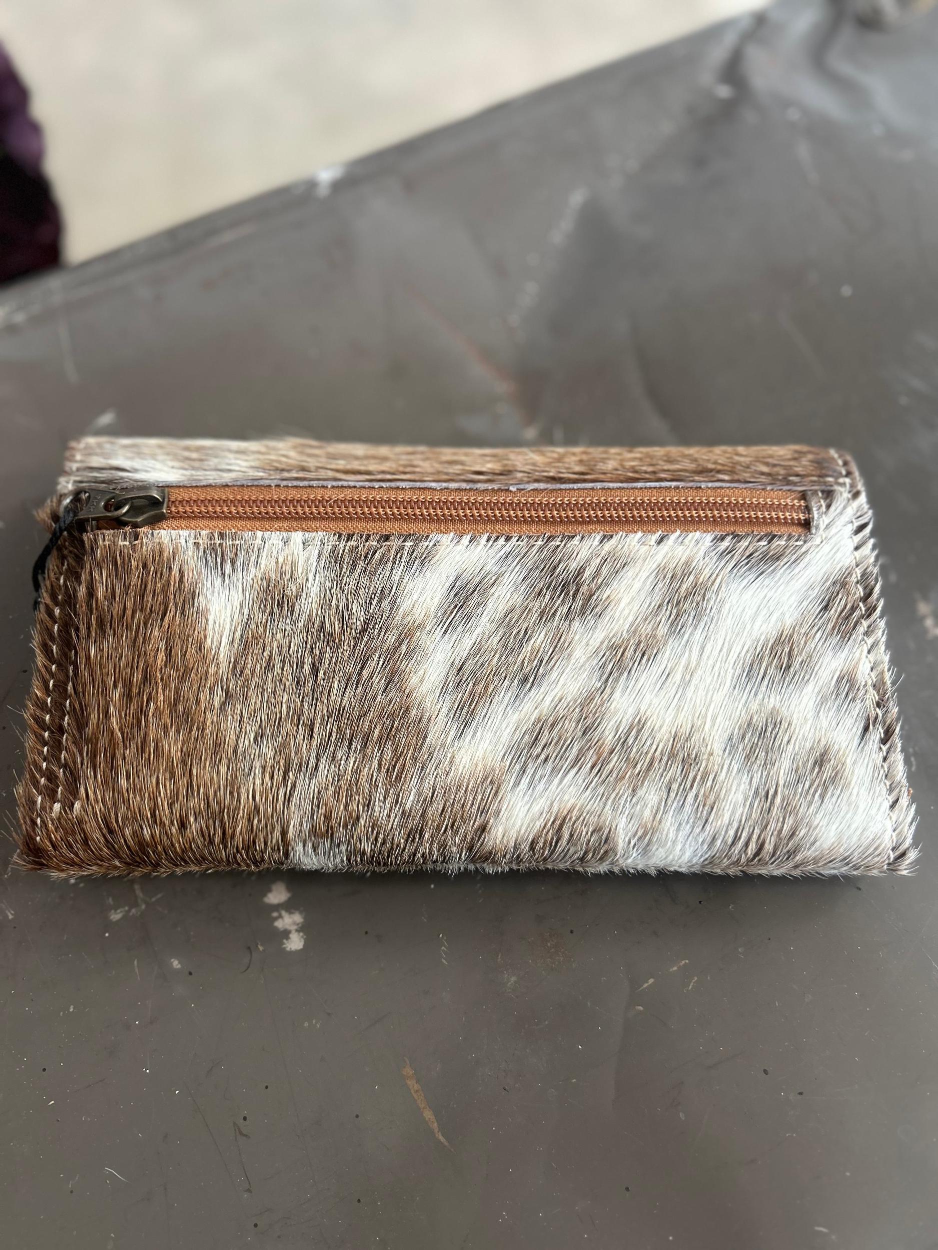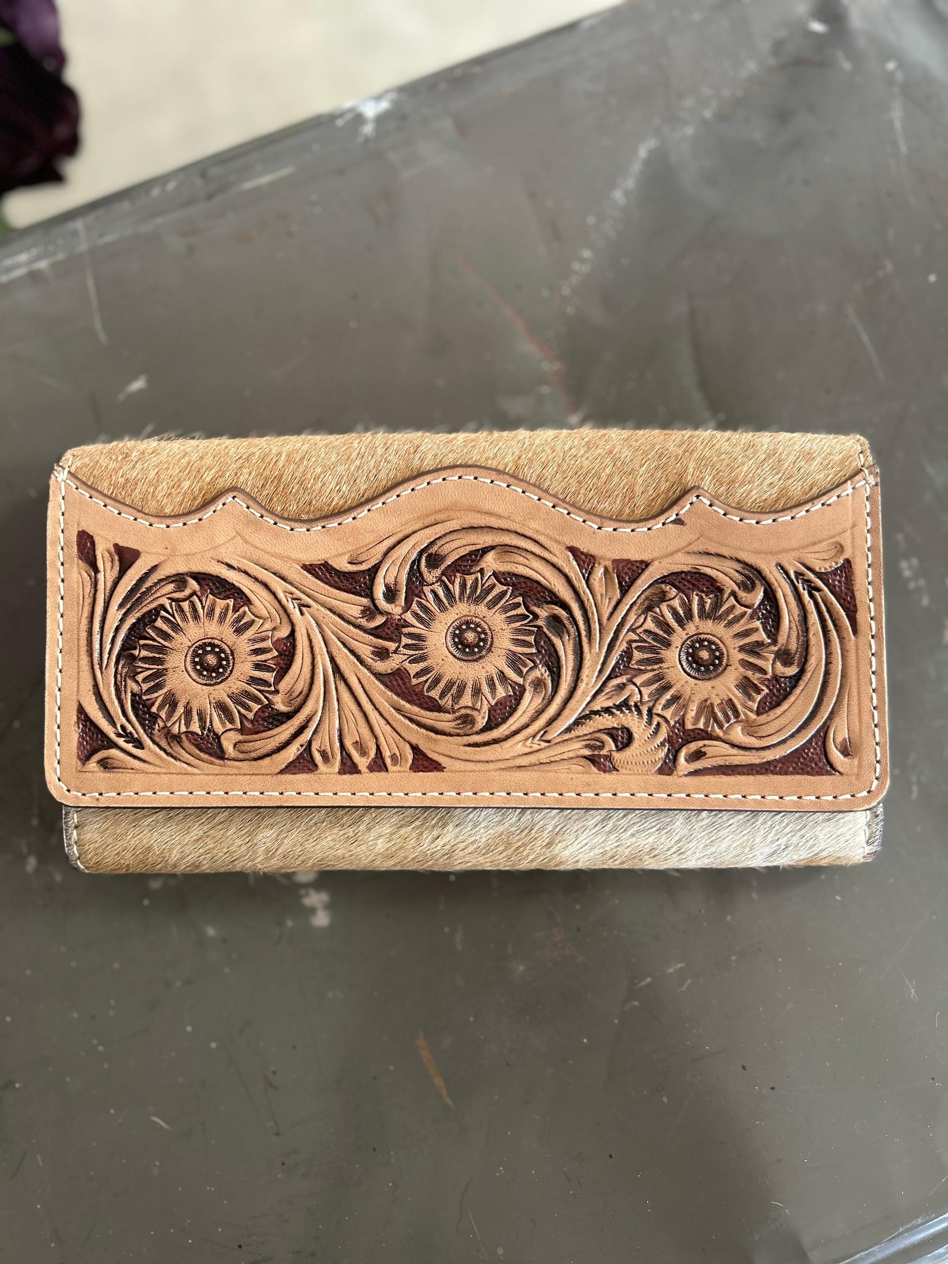 American Darling Hair on Hide Tooled Leather Wallet | Gussied Up Online Boutique Indulge in a touch of luxury with our American Darling Hair on Hide Tooled Leather Wallet. Crafted from genuine cow hide and tooled leather, this exquisite wallet features a secure button closure and multiple interior slots and pockets. Choose from three unique hide patterns to make a statement of elegant sophistication.