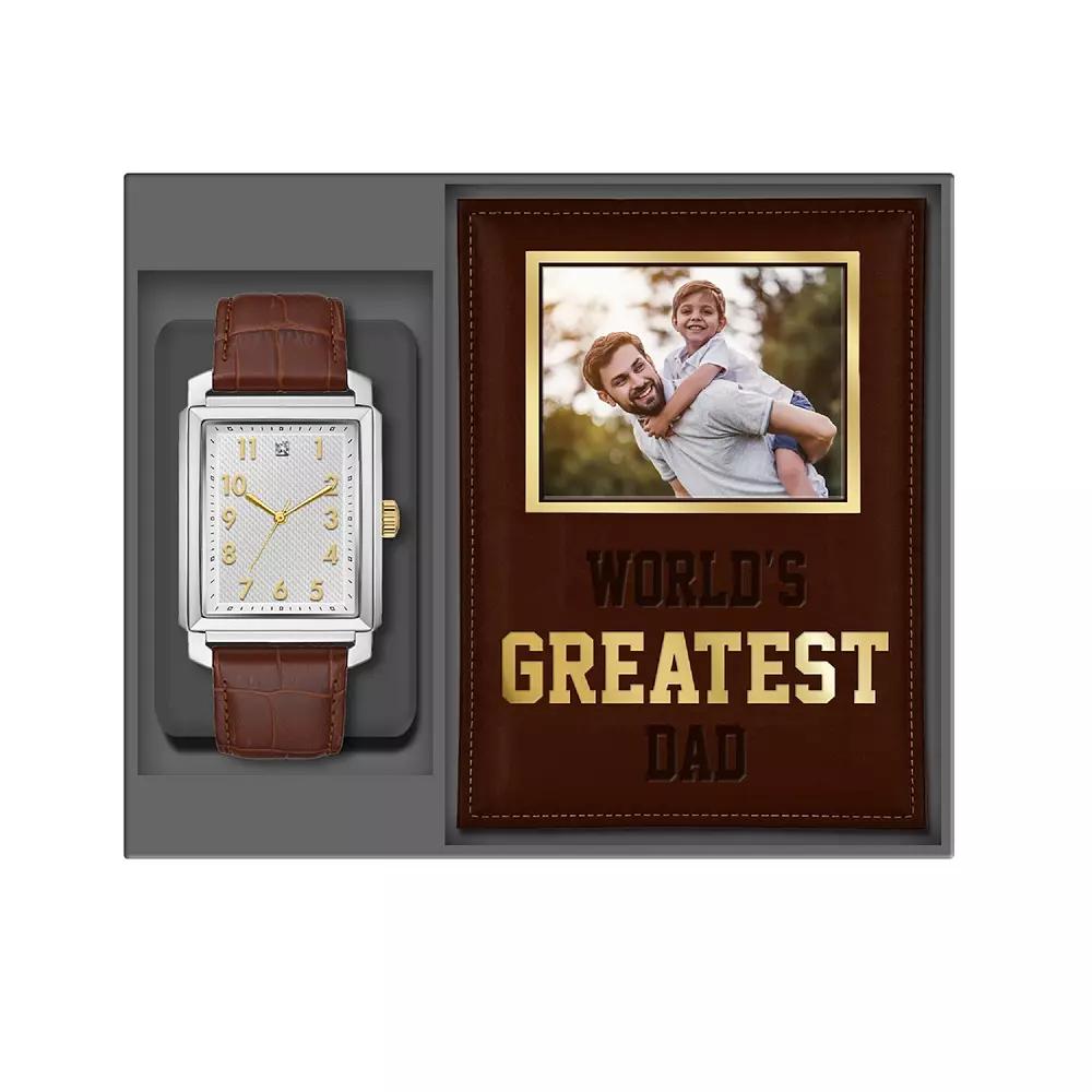 Elegantly blending classic sophistication with modern charm, this American Exchange mens analog watch with a leather strap is paired with a picture frame imprinted with WORLDS GREATEST DAD, crafting a distinguished gift that combines enduring style with heartfelt sentiment. Click on this JEWELRY & WATCHES GUIDE to learn about fit, styles, materials and more!Elegantly blending classic sophistication with modern charm, this American Exchange mens analog watch with a leather strap is paired with a picture frame imprinted with WORLDS GREATEST DAD, crafting a distinguished gift that combines enduring style with heartfelt sentiment. Click on this JEWELRY & WATCHES GUIDE to learn about fit, styles, materials and more!DISPLAY Dial type: sunrayCASE Material: metal alloy Caseback material: metal alloy Diameter: 33 mmBAND Band type: strap Material: leather Clasp: buckle Band length: 245 mmDETAILS Includes: analog watch & photo frame Photo frame: 82.5 mm x 110.5 mm x 20 mm Movement: quartz Power: battery Packaging: boxed Manufacturers 1-year limited warranty: For warranty information please click here Color: Brown. Gender: male. Age Group: adult.