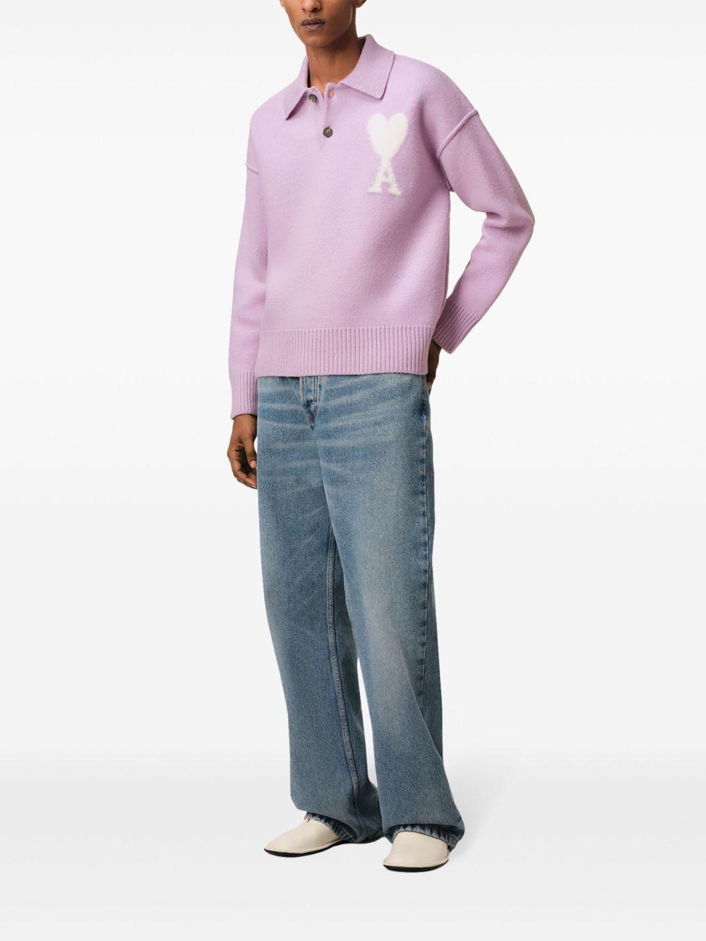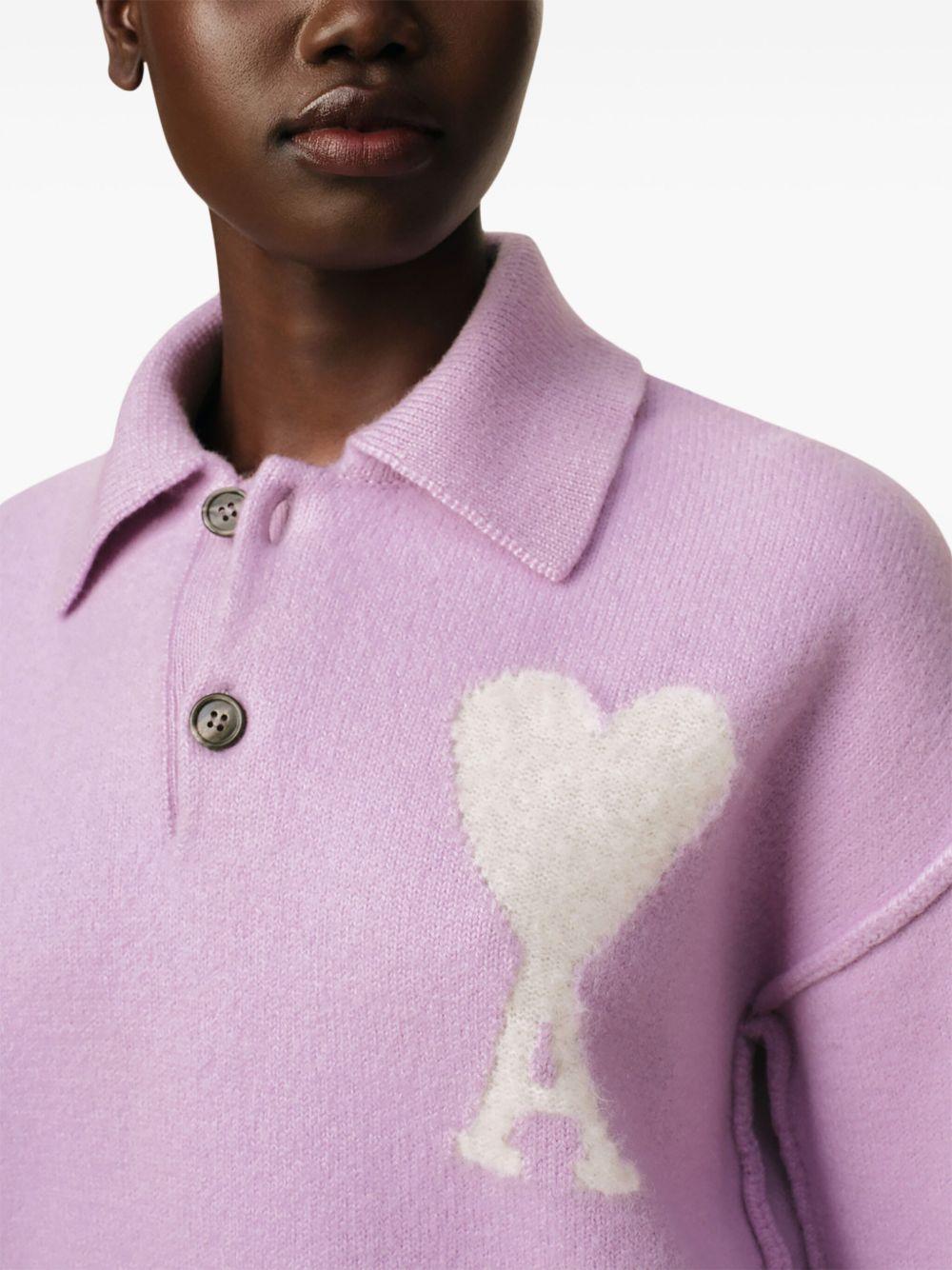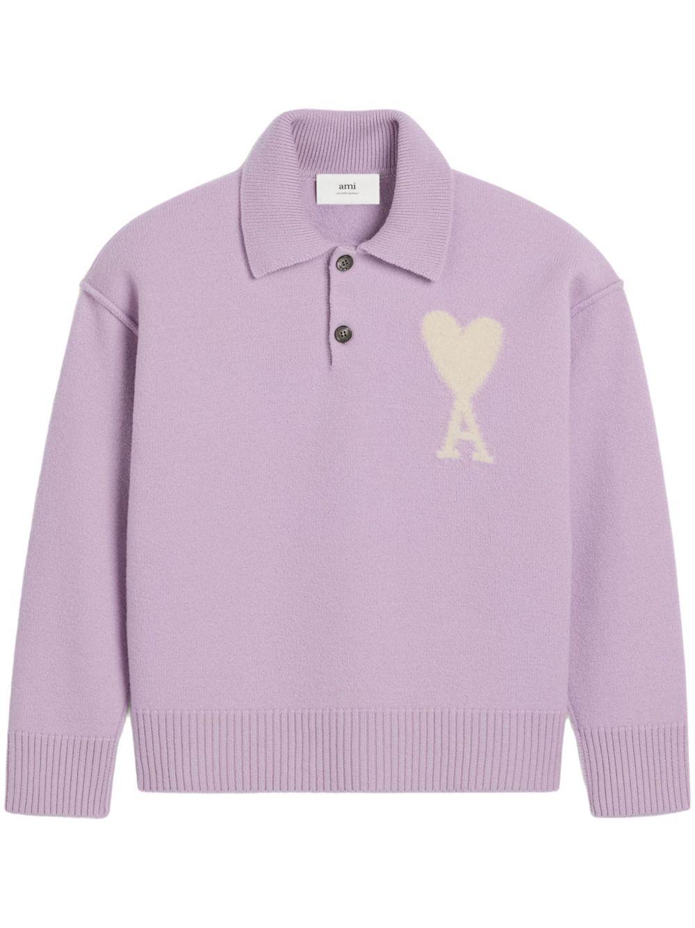 AMI Paris Ami de Coeur polo shirt | Pink | lilac purple | short front button fastening | long sleeves | ribbed cuffs and hem | When buying this unisex item, keep in mind that it is graded in standard men's sizing. | Wool | Polo Tops | Tops | Clothing | Women | Polo Shirts | Clothing | Men