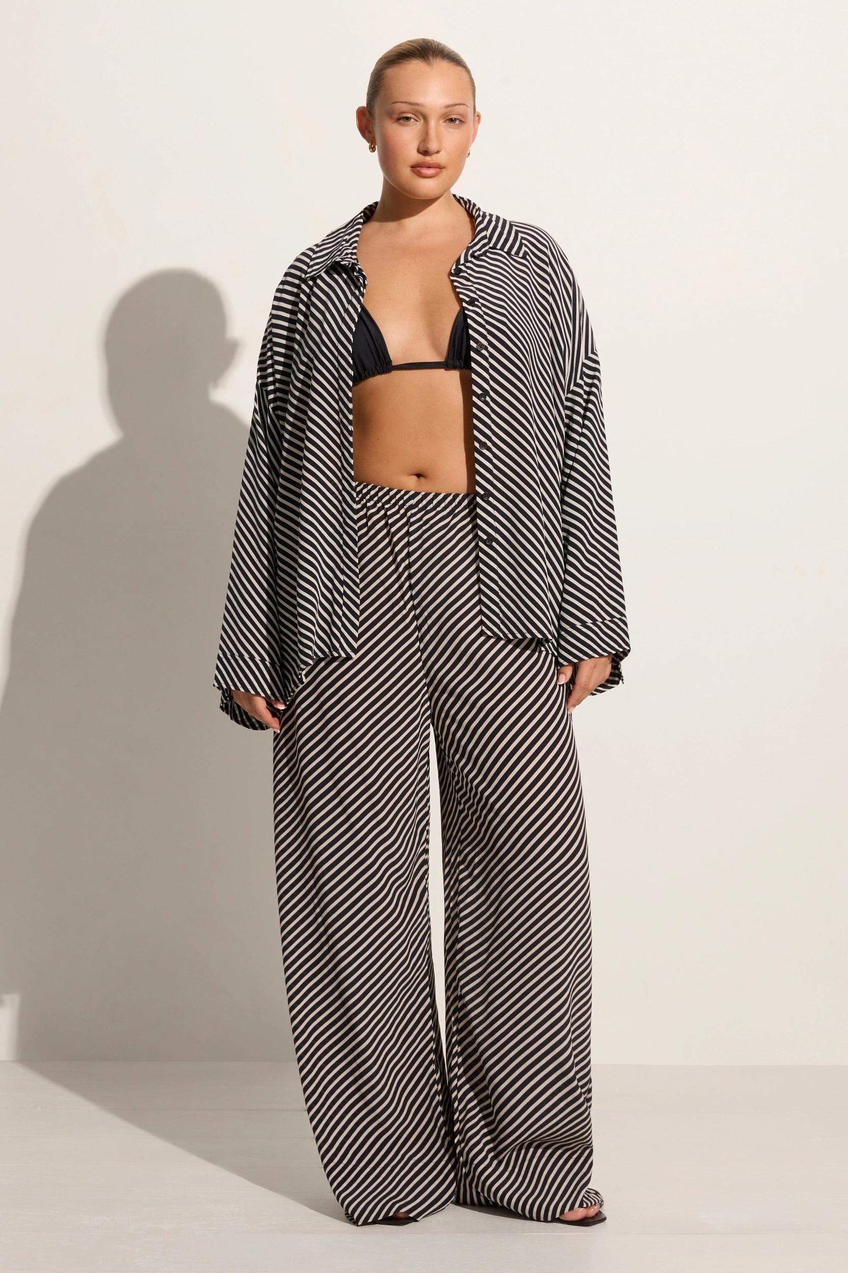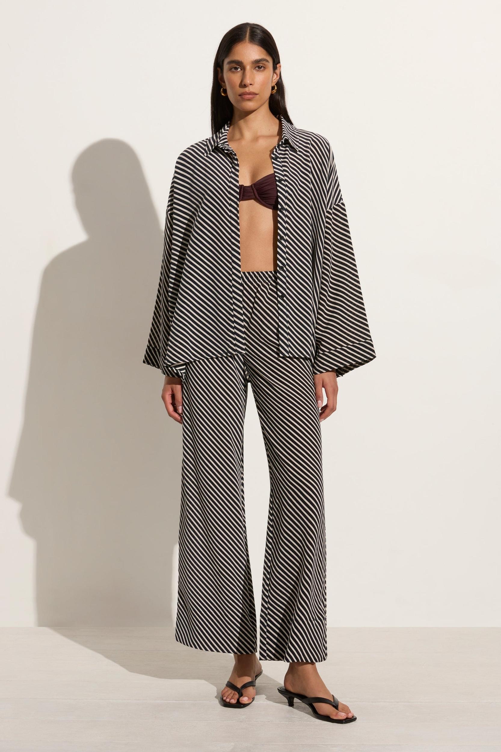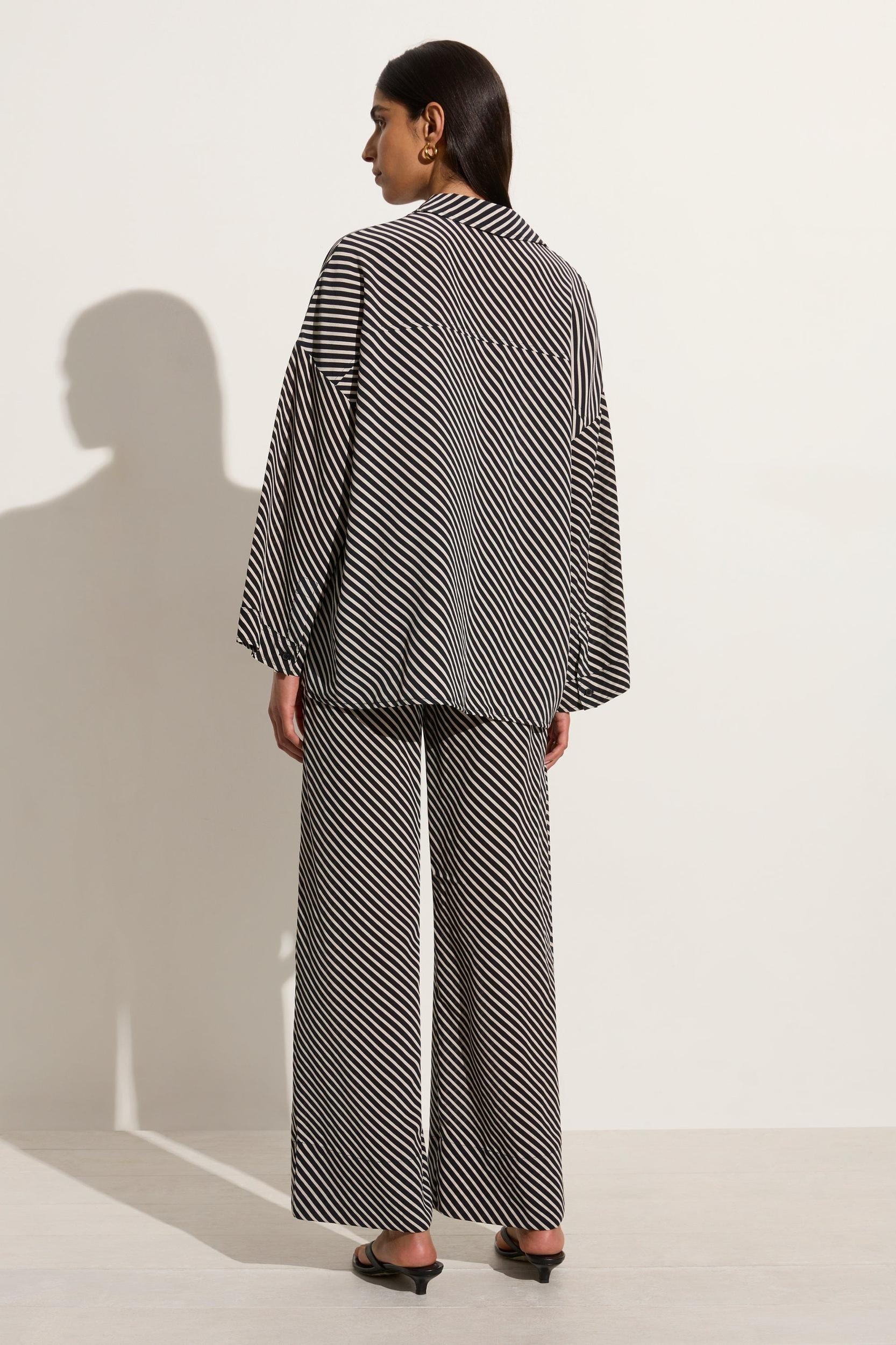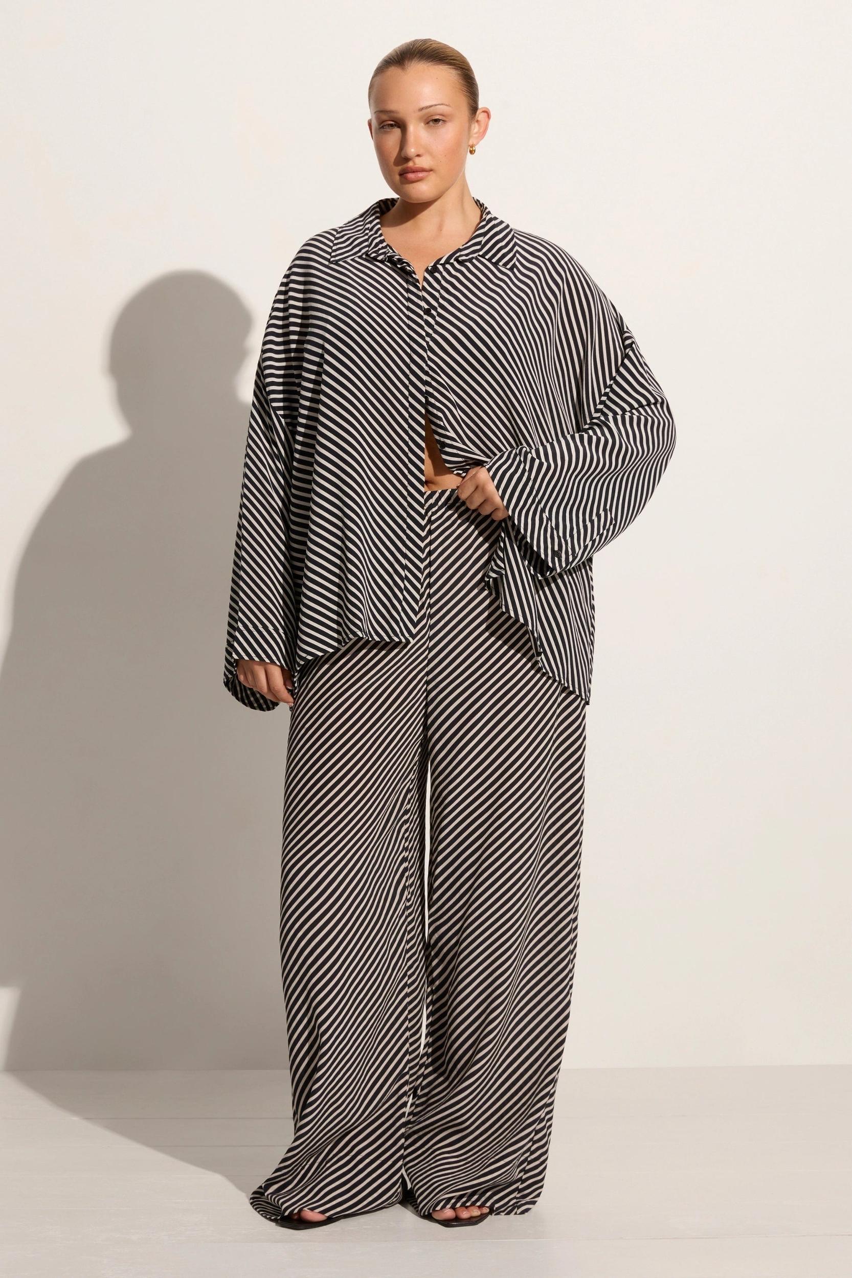The Amici Shirt in Toscana Stripe Black is a summer shirting essential featuring a relaxed, oversized silhouette with a collared neck, concealed button front and wide long sleeves. Crafted from luxe silk crepe and striped throughout for a statement finish. Pair it with the Monforte Pant for a matching set.
