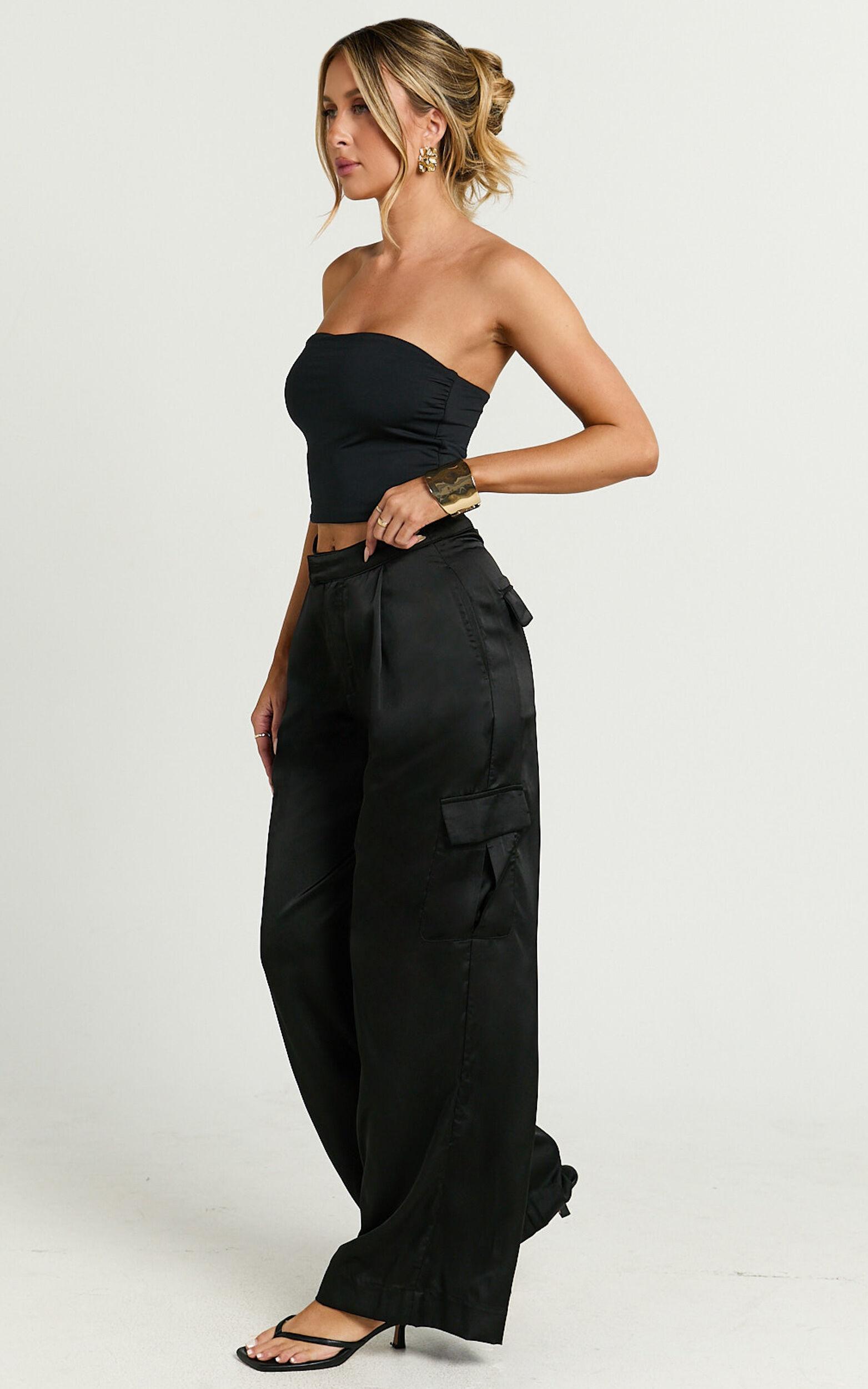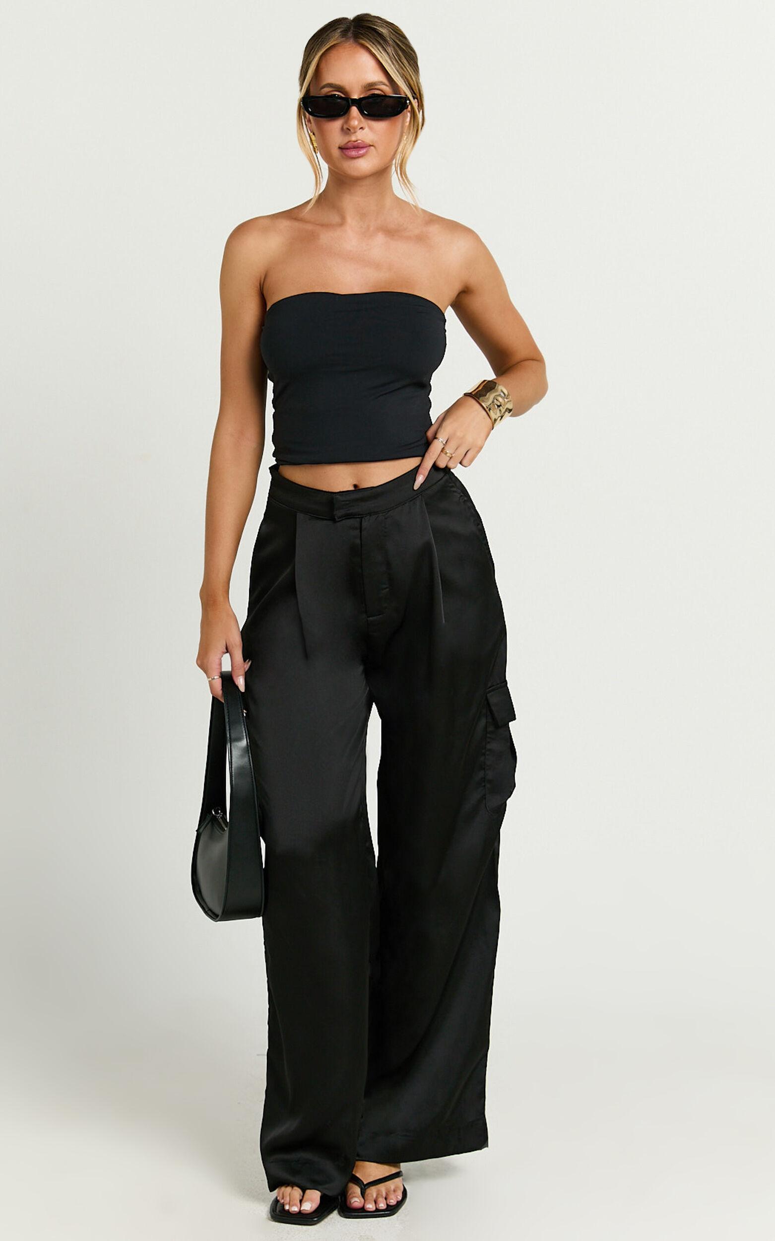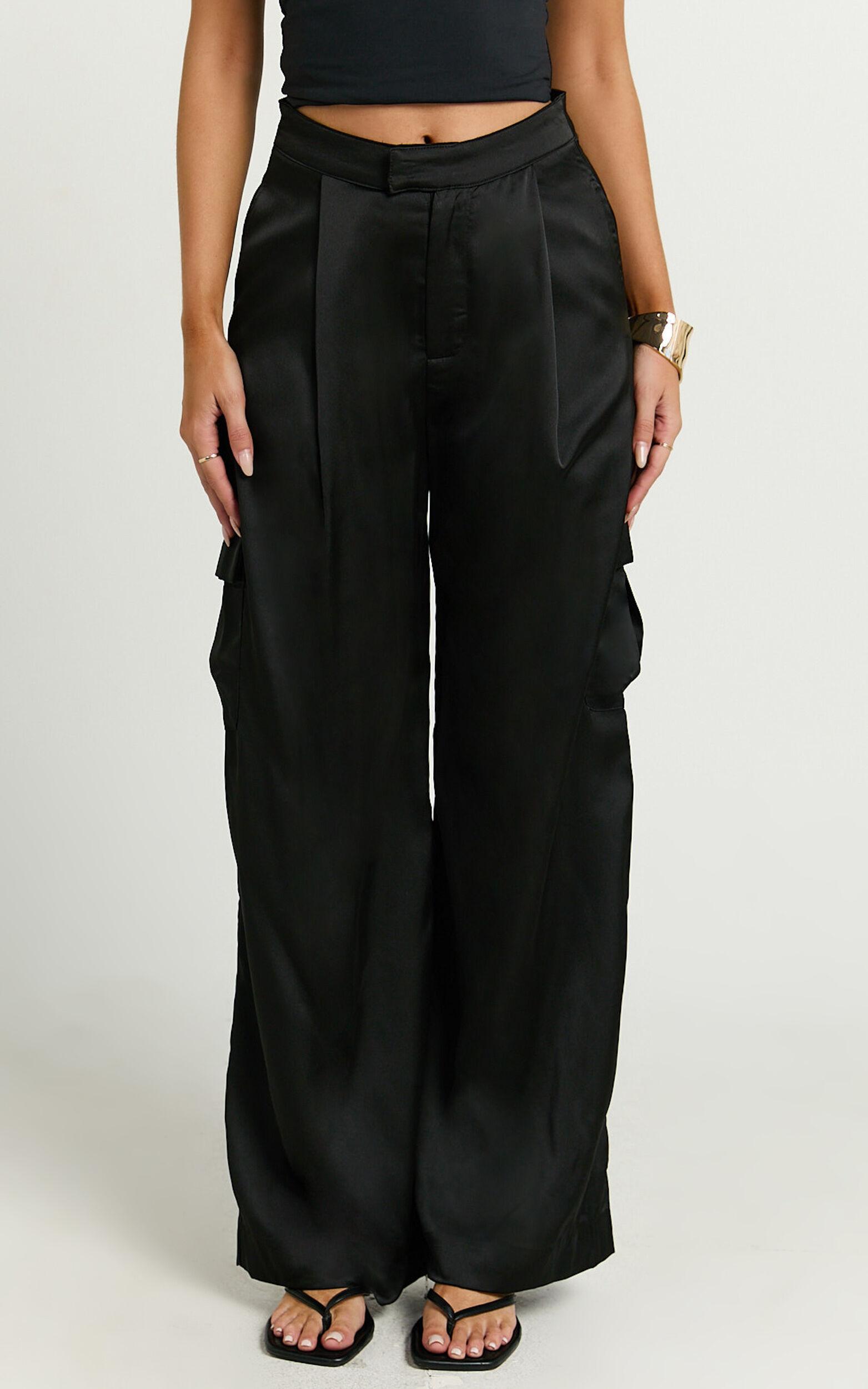 Make a bold statement and amp up your wardrobe with our Amie Pants - your new go-to for an effortlessly chic vibe. Crafted with sleek black satin and precision tailoring, these high waist cargo pants embody elegance with an edge. Whether it's a casual hangout or the pulse of a party day, these full-length trousers are a perfect choice for any event on your calendar.Product Details:Tailored PantsSatin FabricParty DayFull LengthMid WaistPolyester MaterialSize and FitSize S / 8 length: 108.5cm / 42.72inMaterial and Care100% PolyesterLow / No stretch