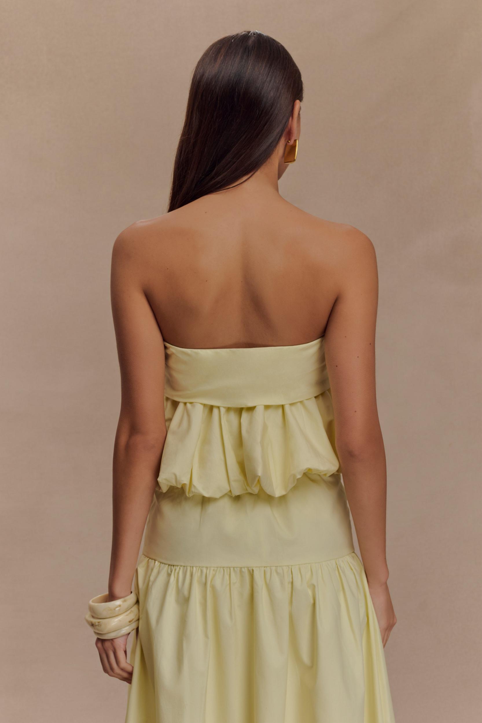 A bubble of beauty. The AMIRAH Strapless Bubble Crop Top combines bold design with effortless elegance. Featuring a flattering strapless fit and a structured bust overlay, this top creates a sleek, feminine silhouette. The playful bubble hem shape adds volume and movement, while the cropped length offers a modern, flattering look. Fully lined for comfort and structure, it’s the perfect piece to elevate any outfit. For a chic and coordinated look, pair it with the Amirah Midi Skirt, creating a refined yet playful ensemble that’s perfect for both casual outings and special occasions.