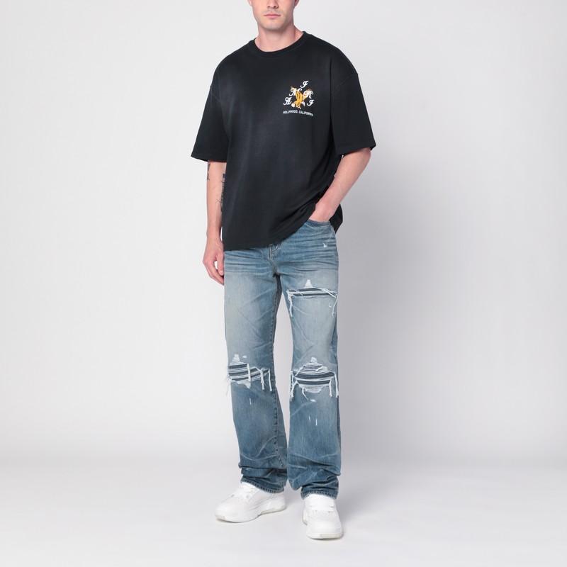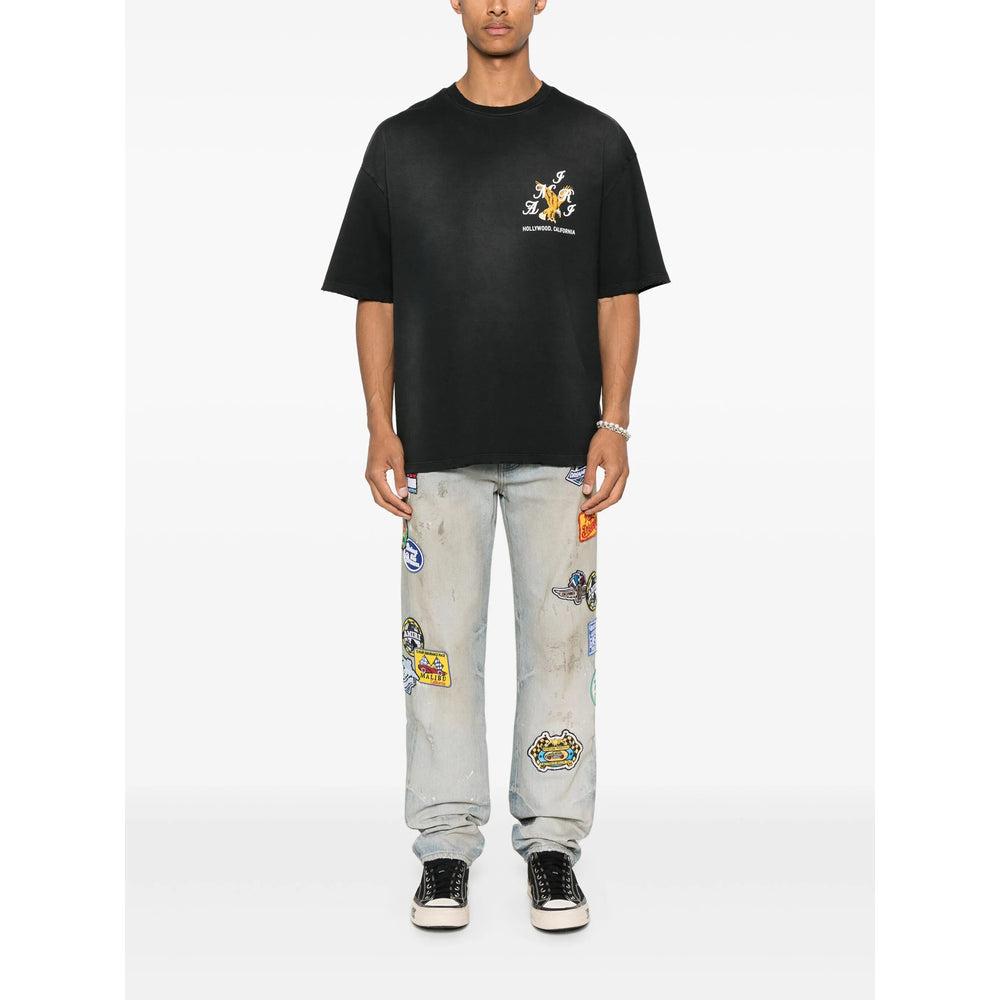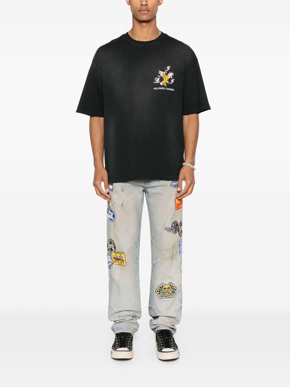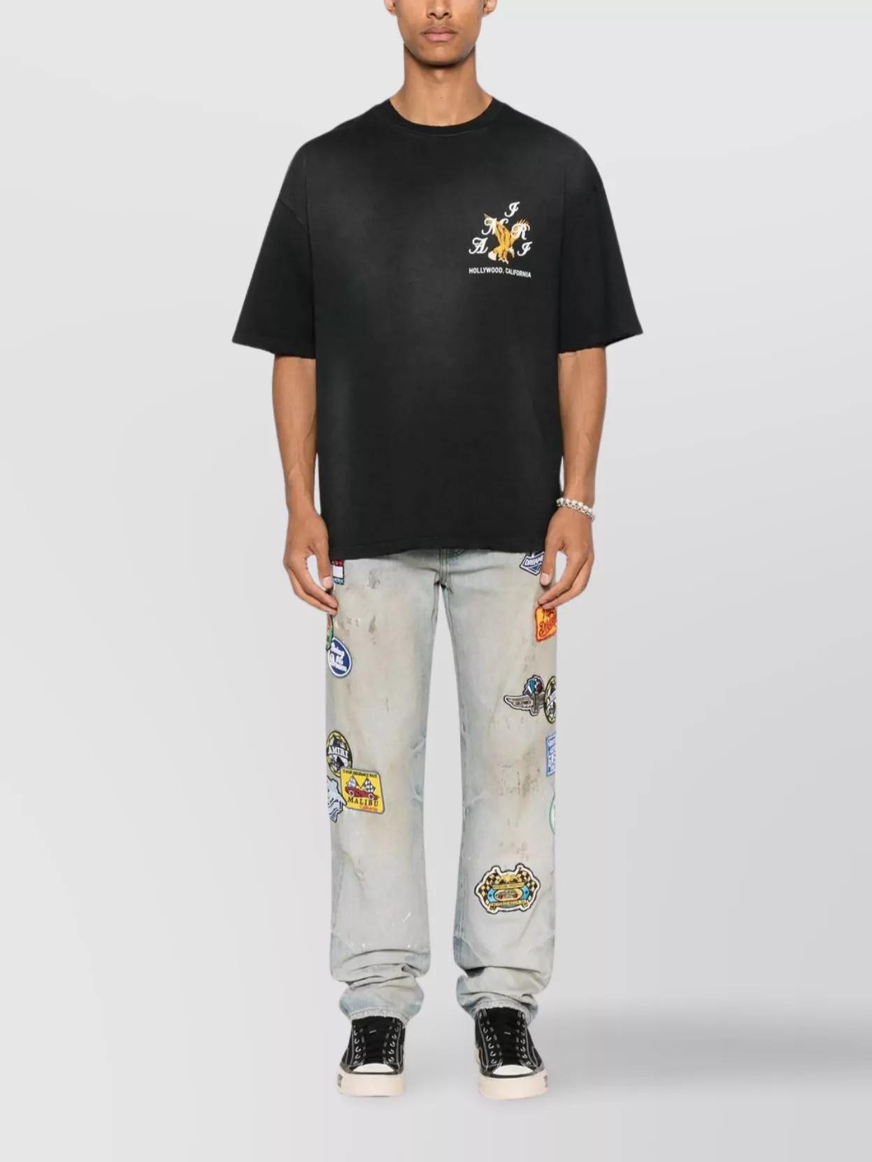 Shop Amiri Eagle Crystal Embellished Oversize Graphic T-shirt In Blue from 800+ stores, starting at $471. Amiri's vintage wash cotton crew neck t-shirt embodies a bold expression of style and luxury. This relaxed-fit piece features a prominent embossed eagle design on the front, complemented by unique graphics on the back. Crafted in Italy from 100% soft cotton, it offers an incomparable comfort, ideal for the modern man's casual wardrobe. The vintage wash effect adds an exclusive touch, making it a statement piece for streetwear enthusiasts. Specifications:- Material: 100% cotton - Fit: Relaxed - Origin: Italy
