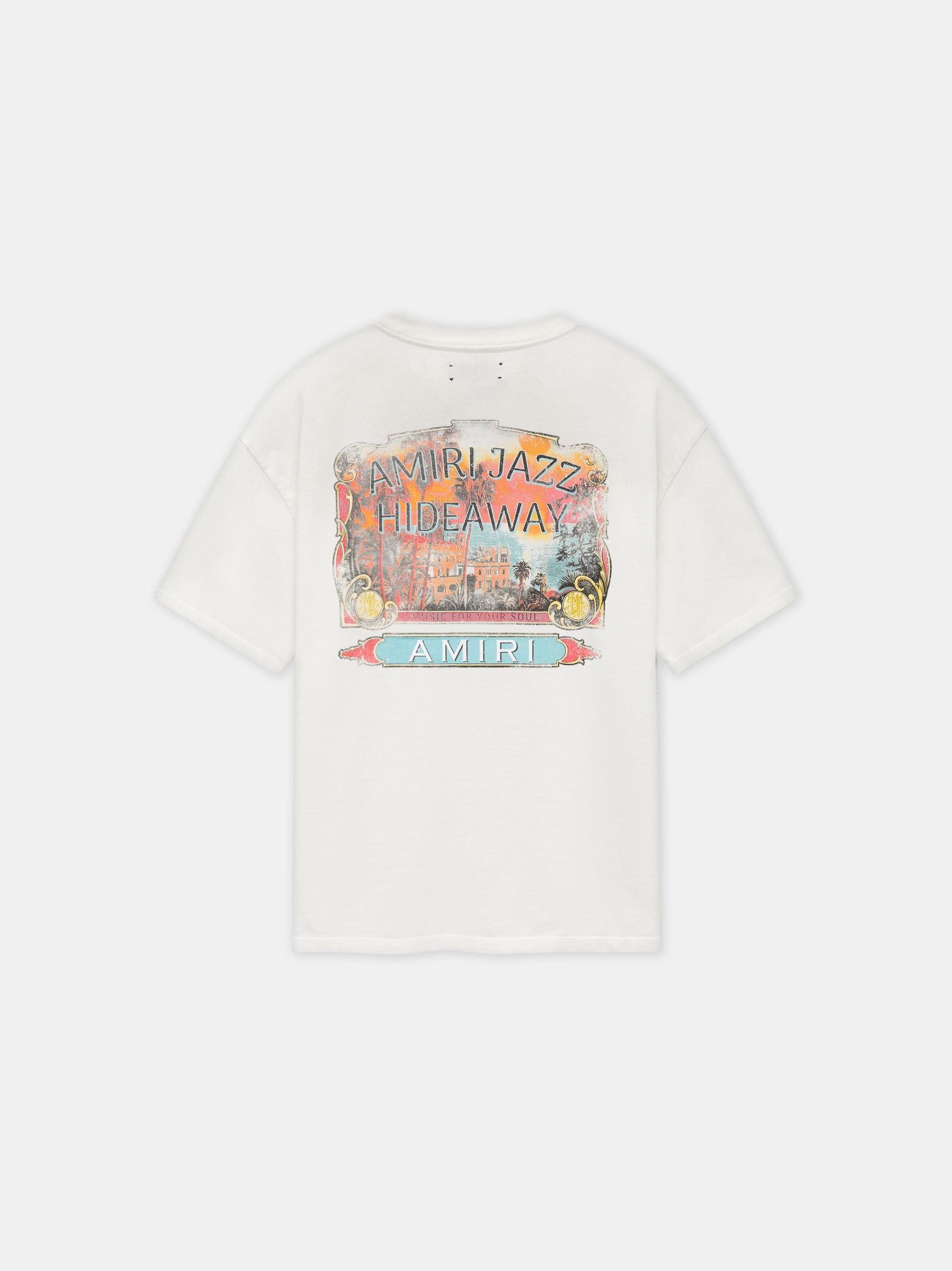 For Spring-Summer 2025, music remains at the heart of AMIRI with graphics that envision a mid-century jazz venue. The AMIRI Jazz Hideaway Tee in cotton is illustrated with the season's venue logo graphic on front and back. SPRING-SUMMER 2025 COLLECTION MADE IN ITALY 100% COTTON