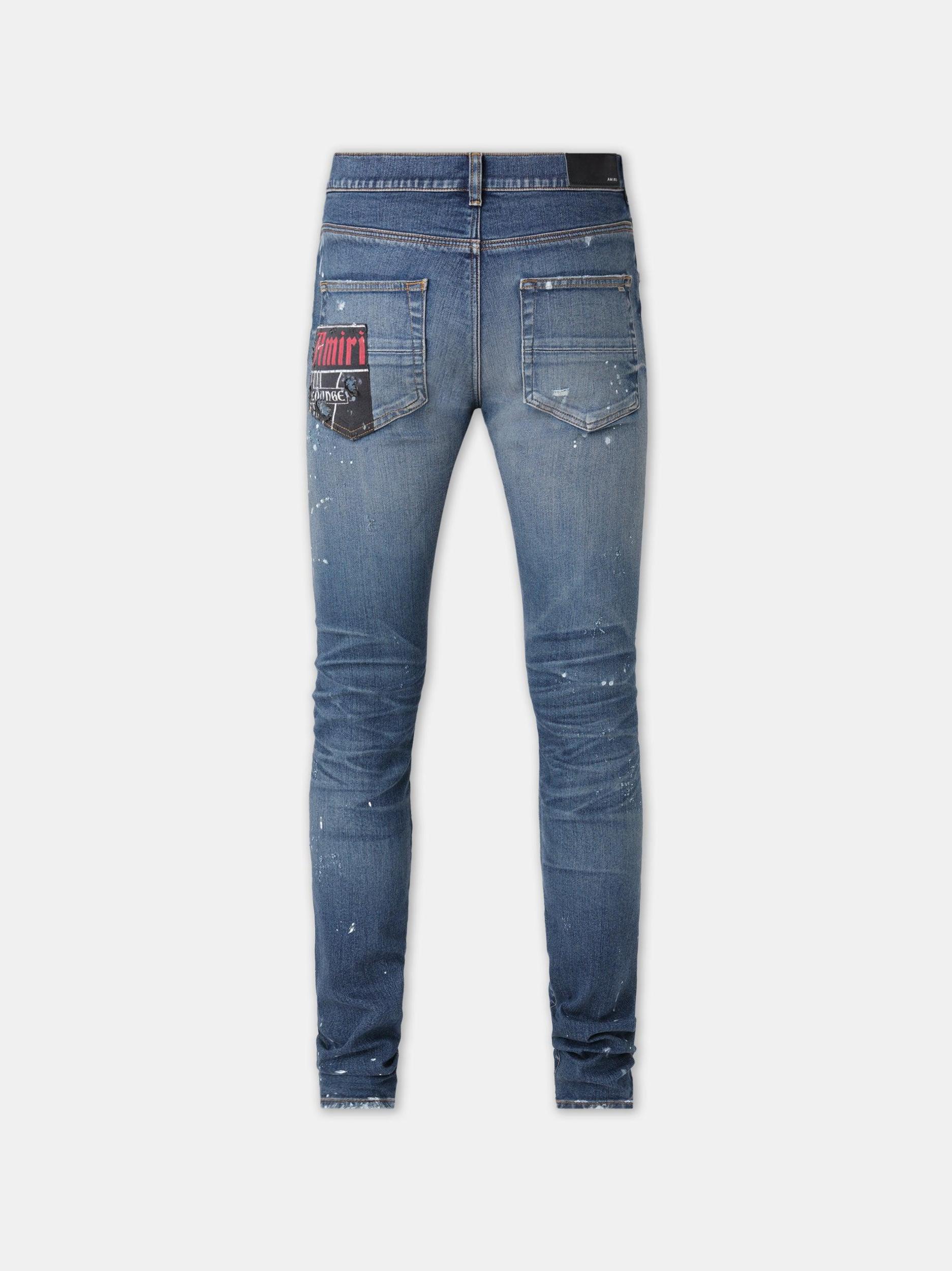 Pre-Spring 2025 hybridizes denim with repurposed materials in a nod to artisanal craft and DIY sensibilities. The AMIRI Lounge Skinny Jean in Italian stretch denim is hand-distressed and repaired with crystal-embellished fabric patches repurposed from the season's vintage-inspired tees. PRE-SPRING 2025 COLLECTION MADE IN USA SELF: 92% COTTON 6% ELASTOMULTIESTER 2% ELASTANE CONTRAST: 100% COTTON