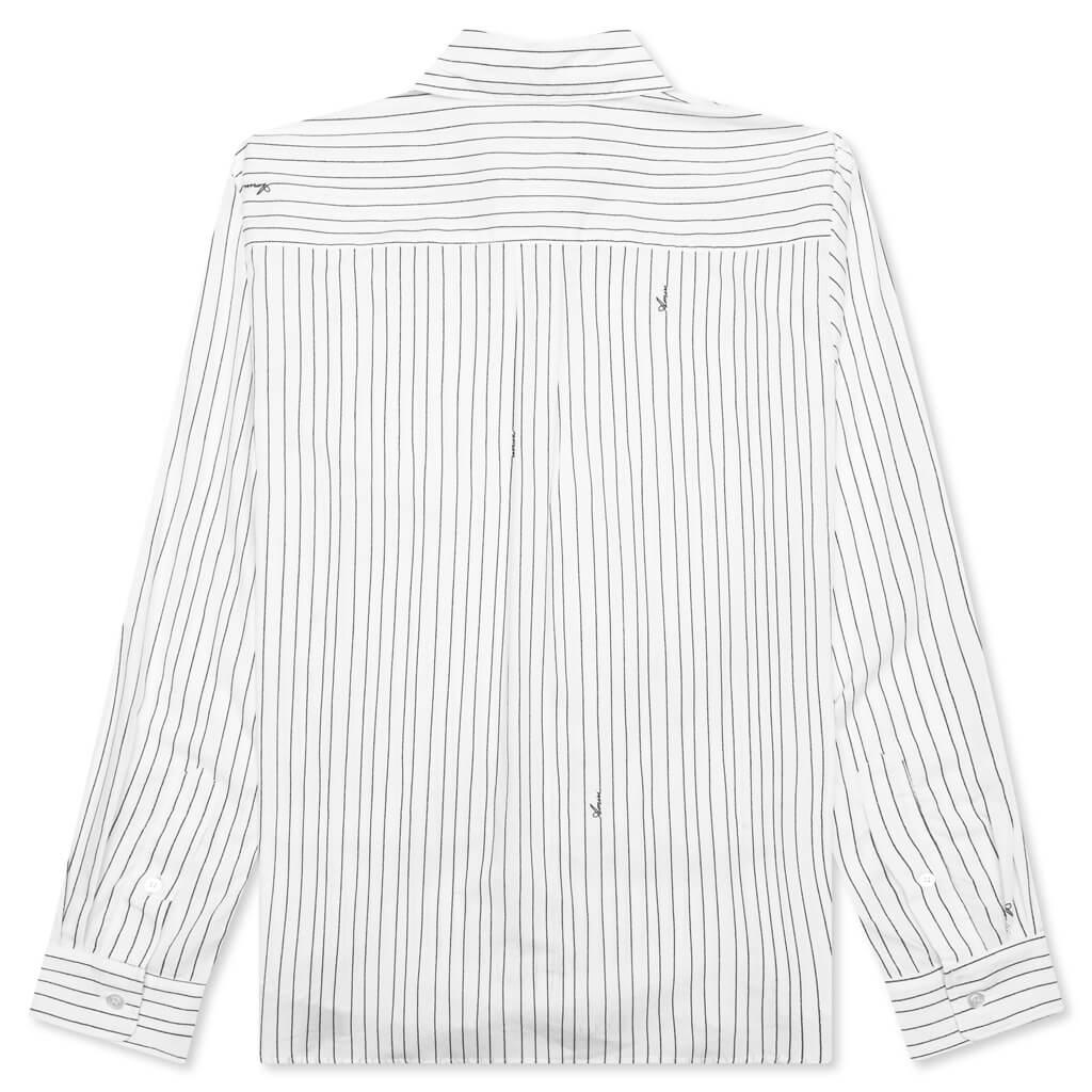 Luxury apparel brand Amiri introduces the Script Poplin Shirt in their AW '23 collection. Cut from 100% cotton, the fashion house retains their eye for detail as the garment features hand-drawn striping, a concealed button closure + Amiri script branding seamlessly incorporated into the pattern. Finishes include the classic pointed collar, button cuffs + a curved hem. 100% cotton Hand-drawn striping Made in Italy Concealed button front closure Amiri branding Button cuffs Curved hem Style No: AW23MSL030-100