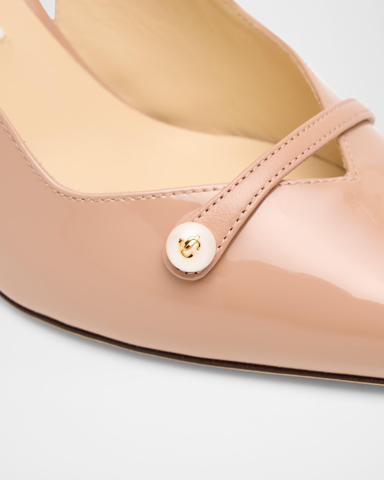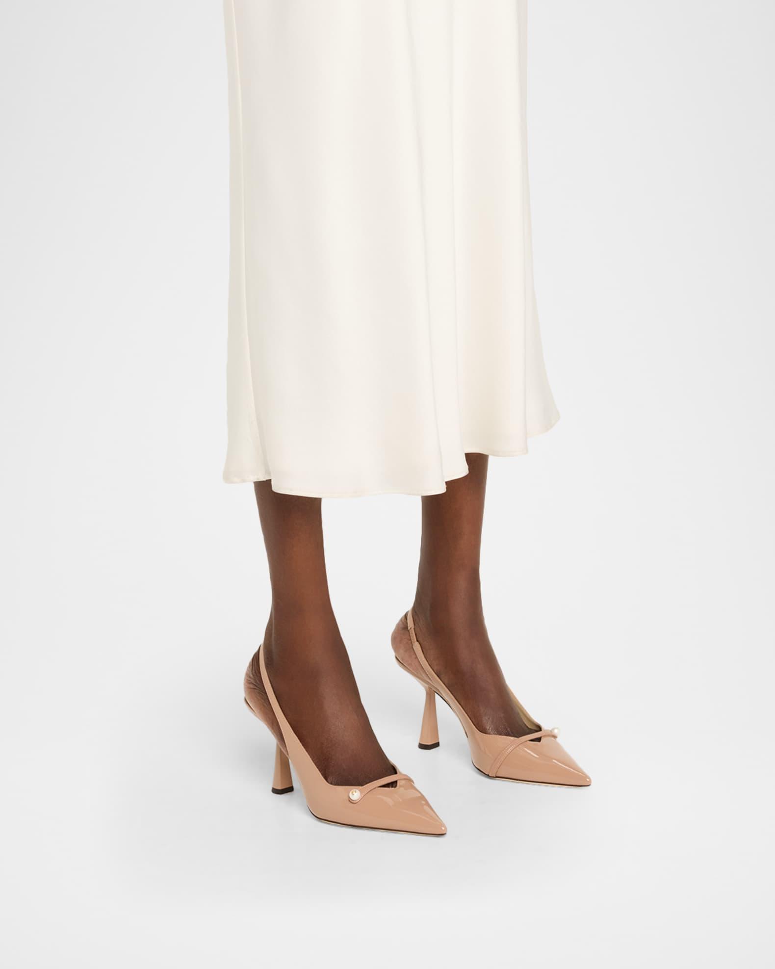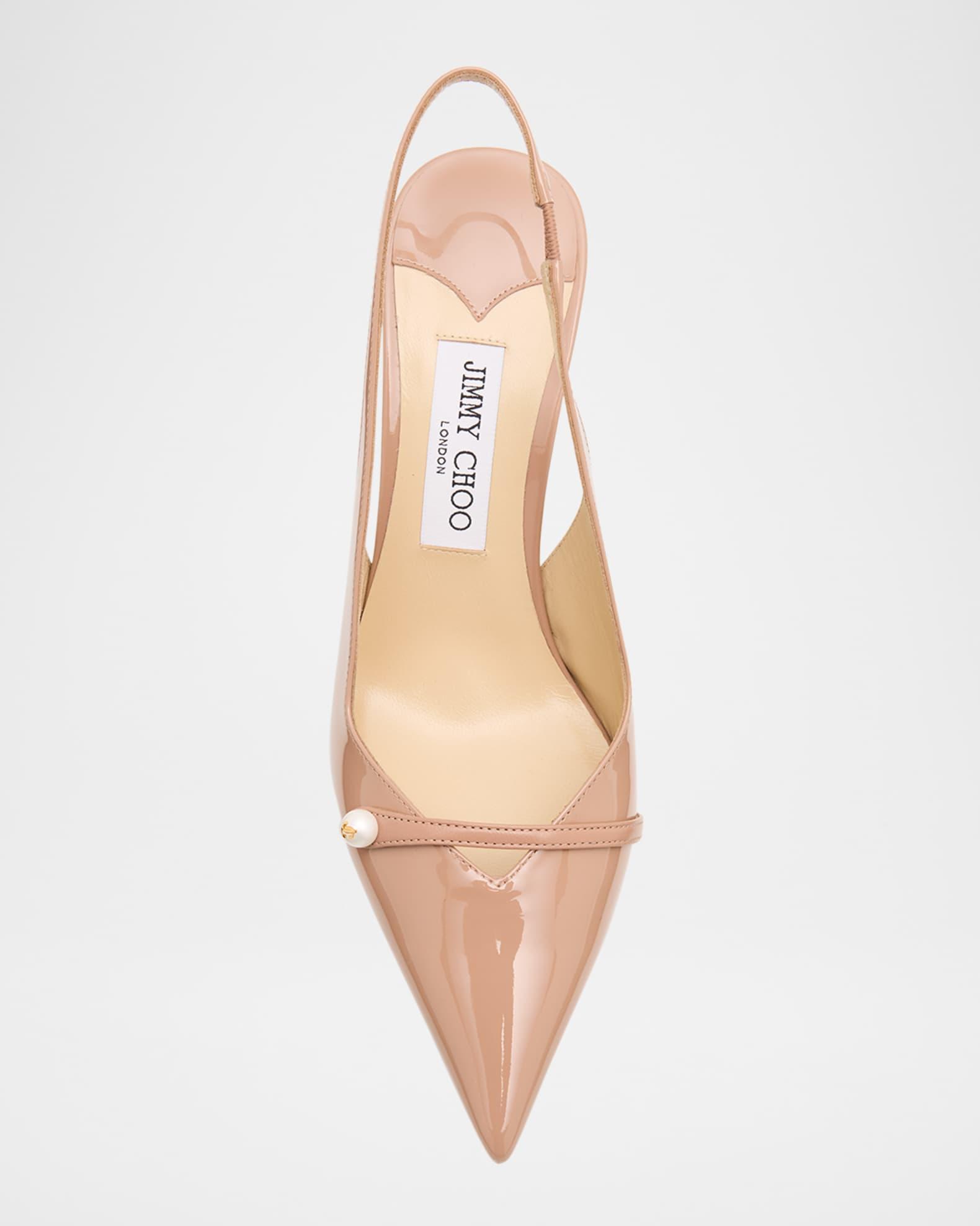 Jimmy Choo "Amita" pumps in patent leather with pearly stud strap 3.25 in / 85 mm stiletto heel Pointed toe Stretch slingback strap Leather lining and outsole Made in Italy Size Note: Jimmy Choo runs small. We suggest that you order a half size larger than you typically wear.