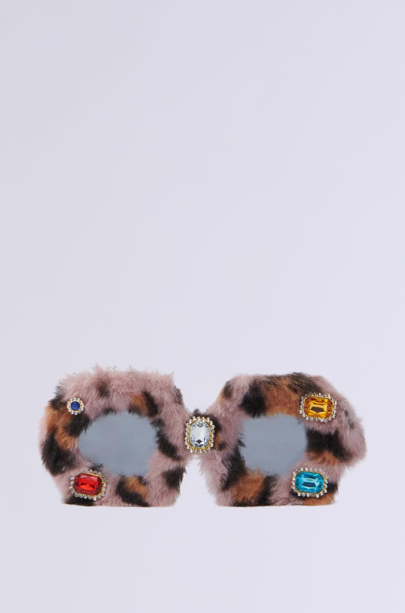 Love is all around in The AKIRA Label Amore Fur Glasses. This statement accessory features a lightweight, plastic frame, geometric tinted lenses, a leopard print faux fur trim detailing that continues halfway on the slim, curved temple arms, and a smooth nose bridge. Complete with colorful gemstone accents adorned with a rhinestone trim scattered across the front. - 100% Man-Made Materials (all measurements approximate from size O/S)- 6” Frame Length x 2.5” Height- 6” Arm Length- Imported Product ID: 468030