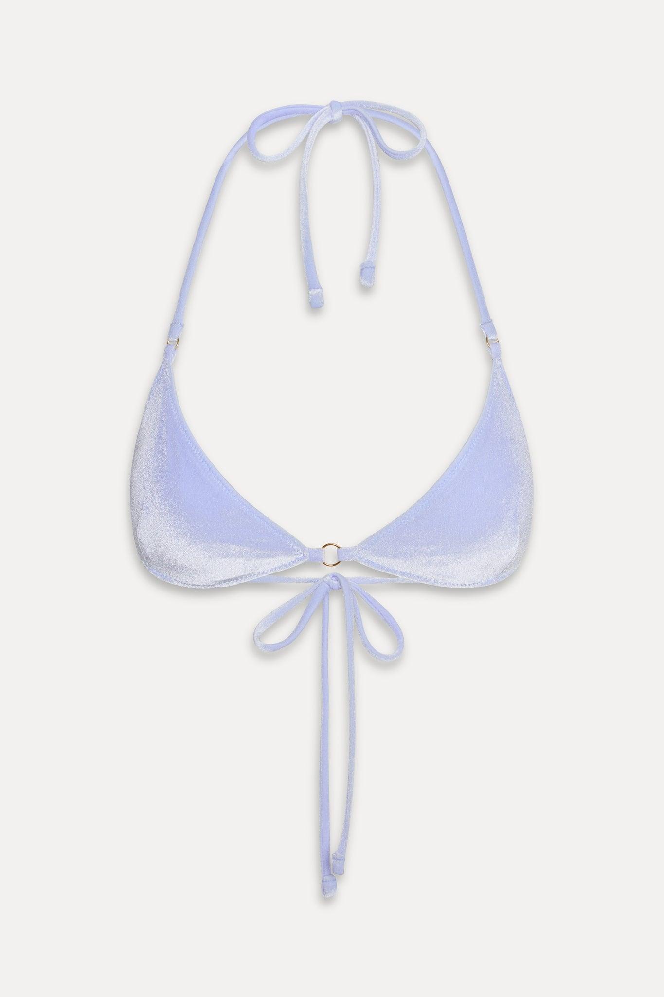 Fall head over heels for the Amore bikini top, a skimpy bikini with double the charm. This triangle top ties at the neck and back for a fully adjustable fit. Details Special velvet swim fabric Moderate support Skimpy coverage O-ring details at center front and straps