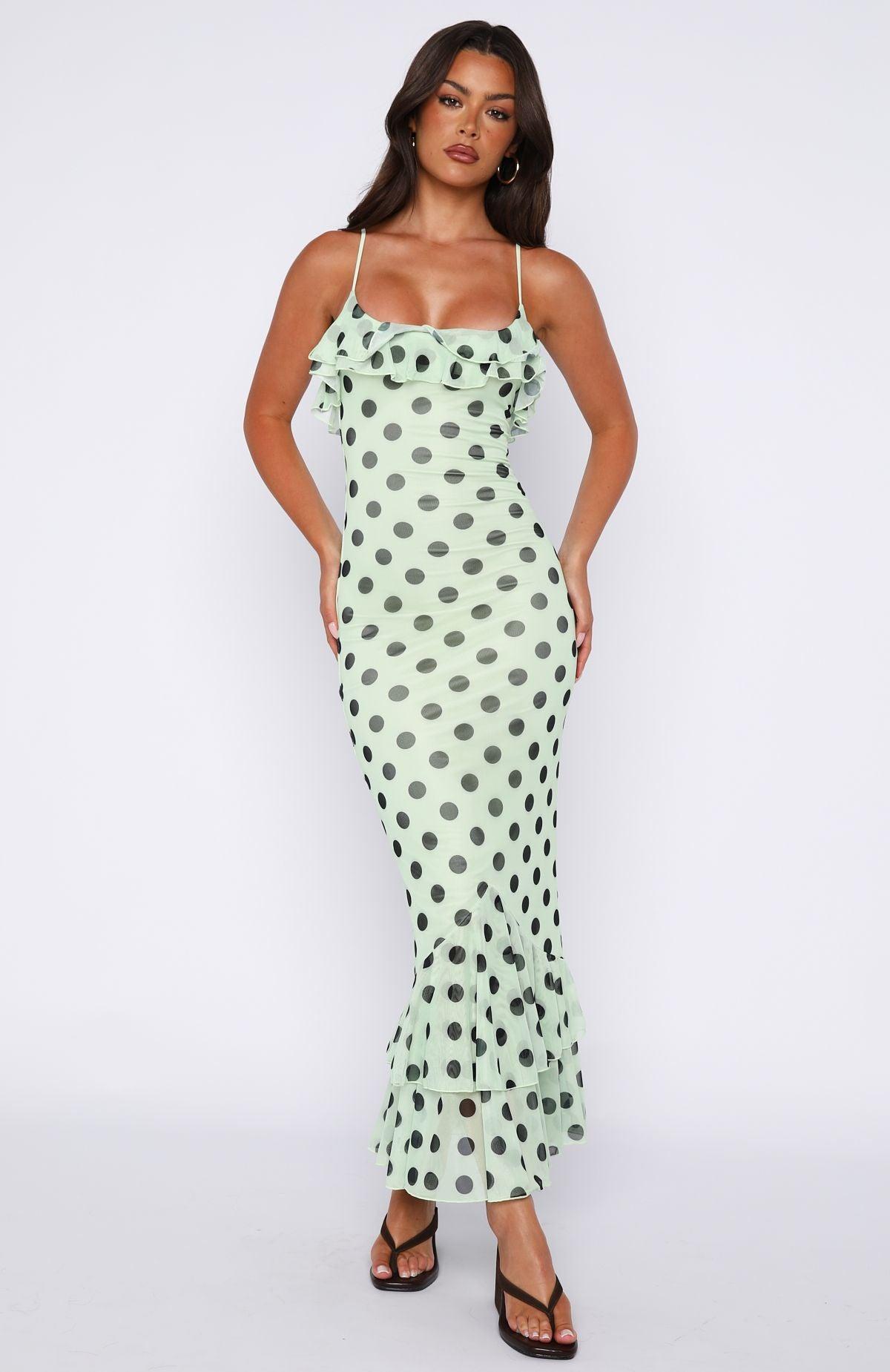 Find me under the palms in the Amped Up Midi Dress in Melon/Black Polka Dot. This effortless warm-weather style features thin adjustable shoulder straps, a scoop neckline with soft ruffle detailing, and a figure-skimming silhouette that flatters every curve. Finished with a layered hem, high-stretch fabrication , and full lining. Style with kitten heels and layered gold jewellery for sunny days and breezy sunsets.