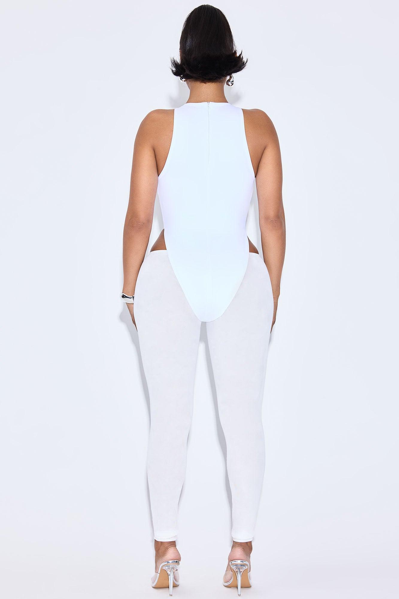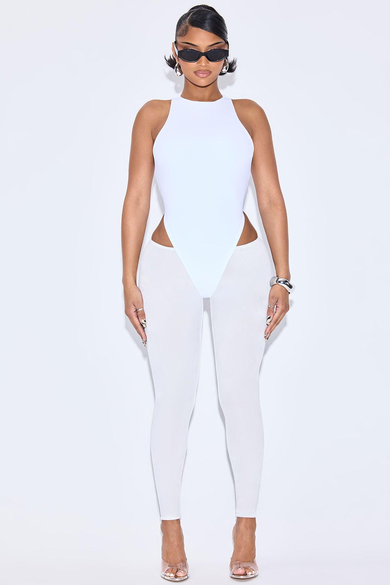 Available In Off White. Pant Set Bodysuit High Neck High Cut Snap Button Closure Low Rise Leggings Mesh Stretch Final Sale Top: 82% Nylon 18% Spandex Bottom: 95% Polyester 5% Spandex Imported California Proposition 65WARNING: Cancer and Reproductive Harm - www.P65Warnings.ca.gov.