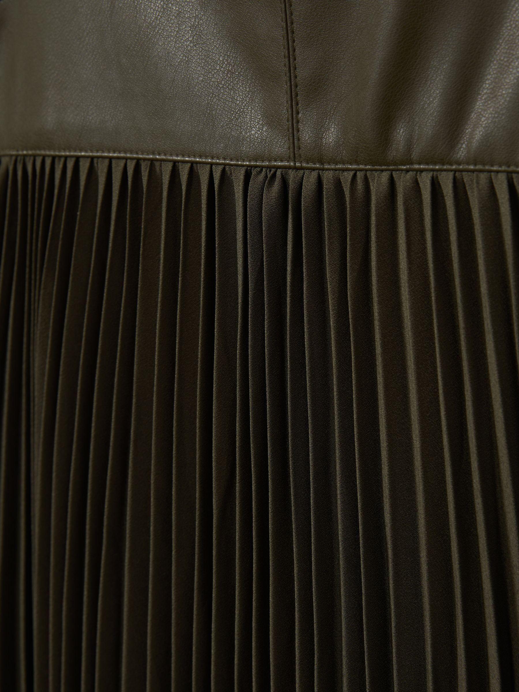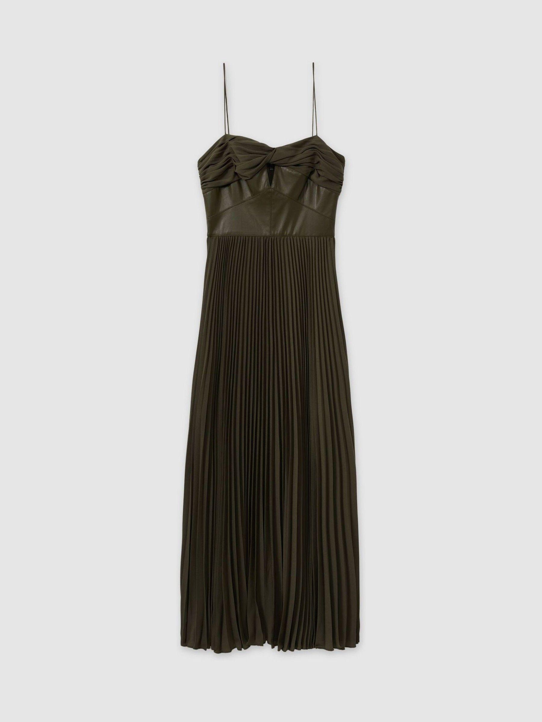 The Linda dress is fitted through the bodice with faux leather panelling. A cut-out and twist detail accentuate the neckline and the silhouette flares through the hem, thanks to its lightweight pleated fabric. Cut-out and twist detail to neckline Pleated skirt Zip-closure to reverse Maxi length