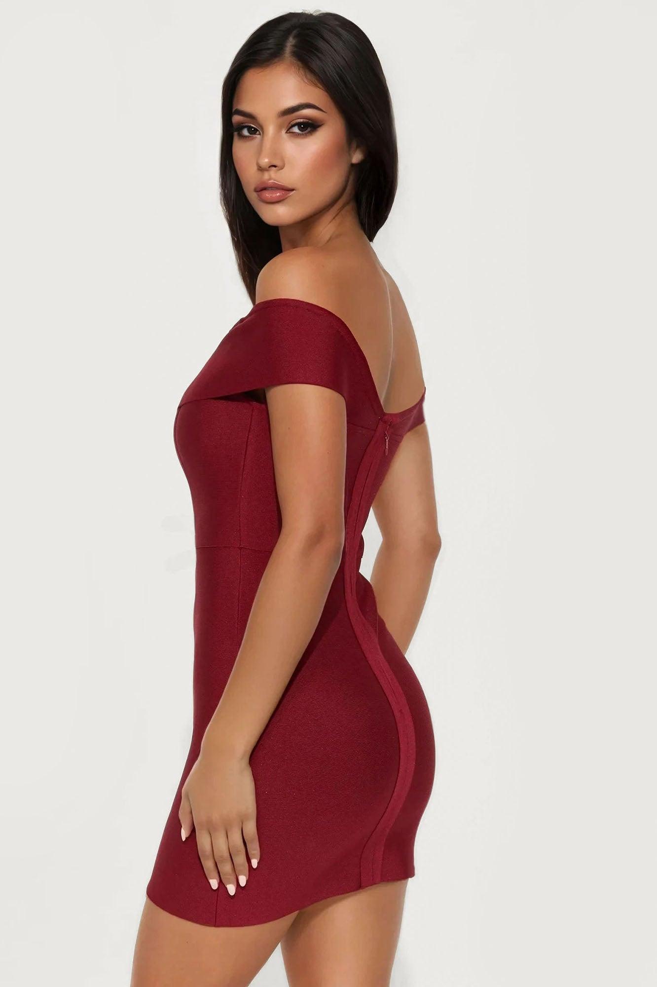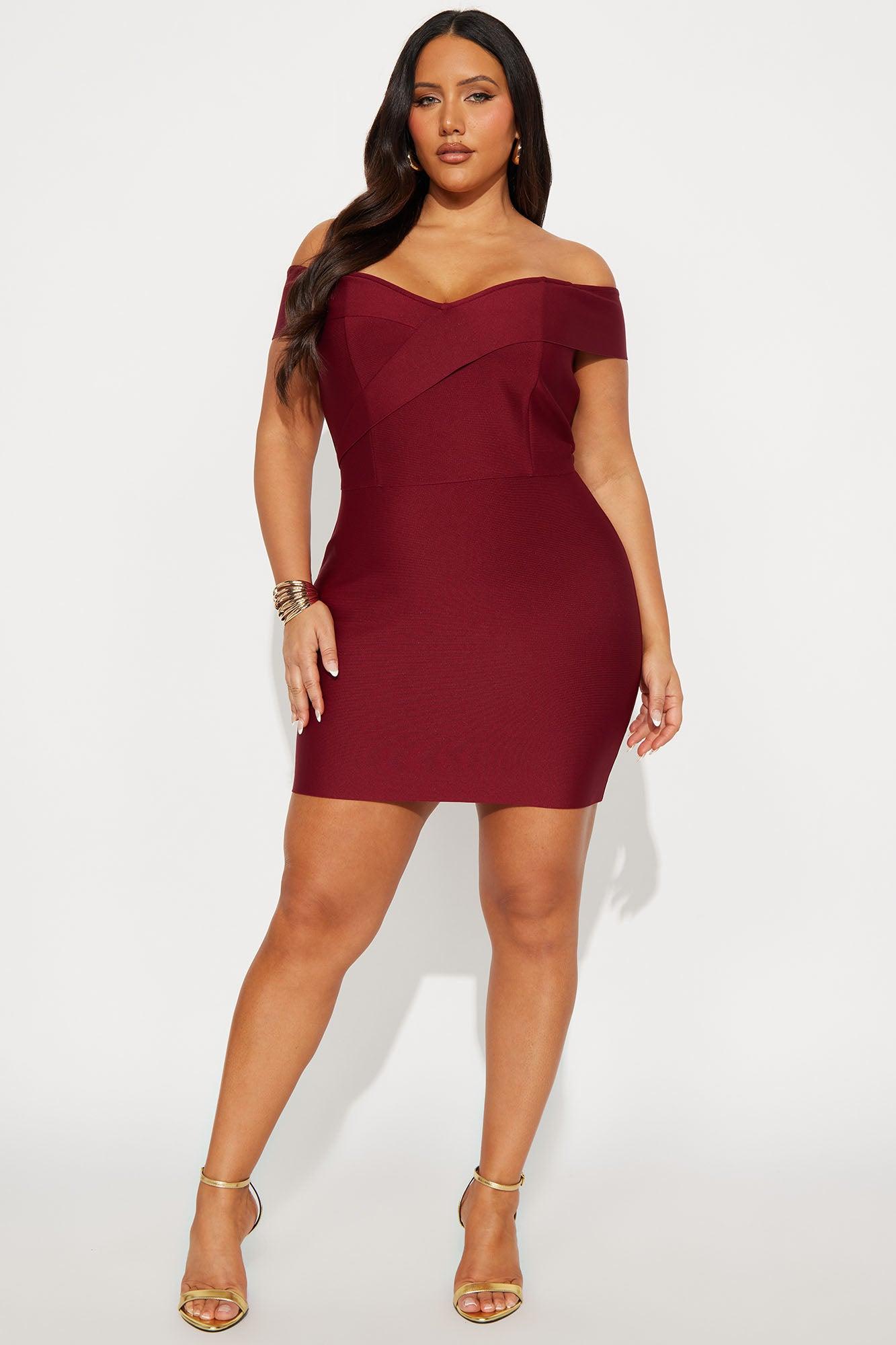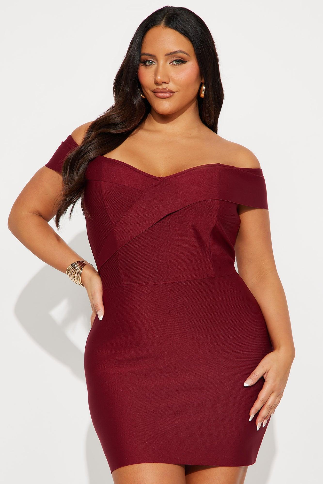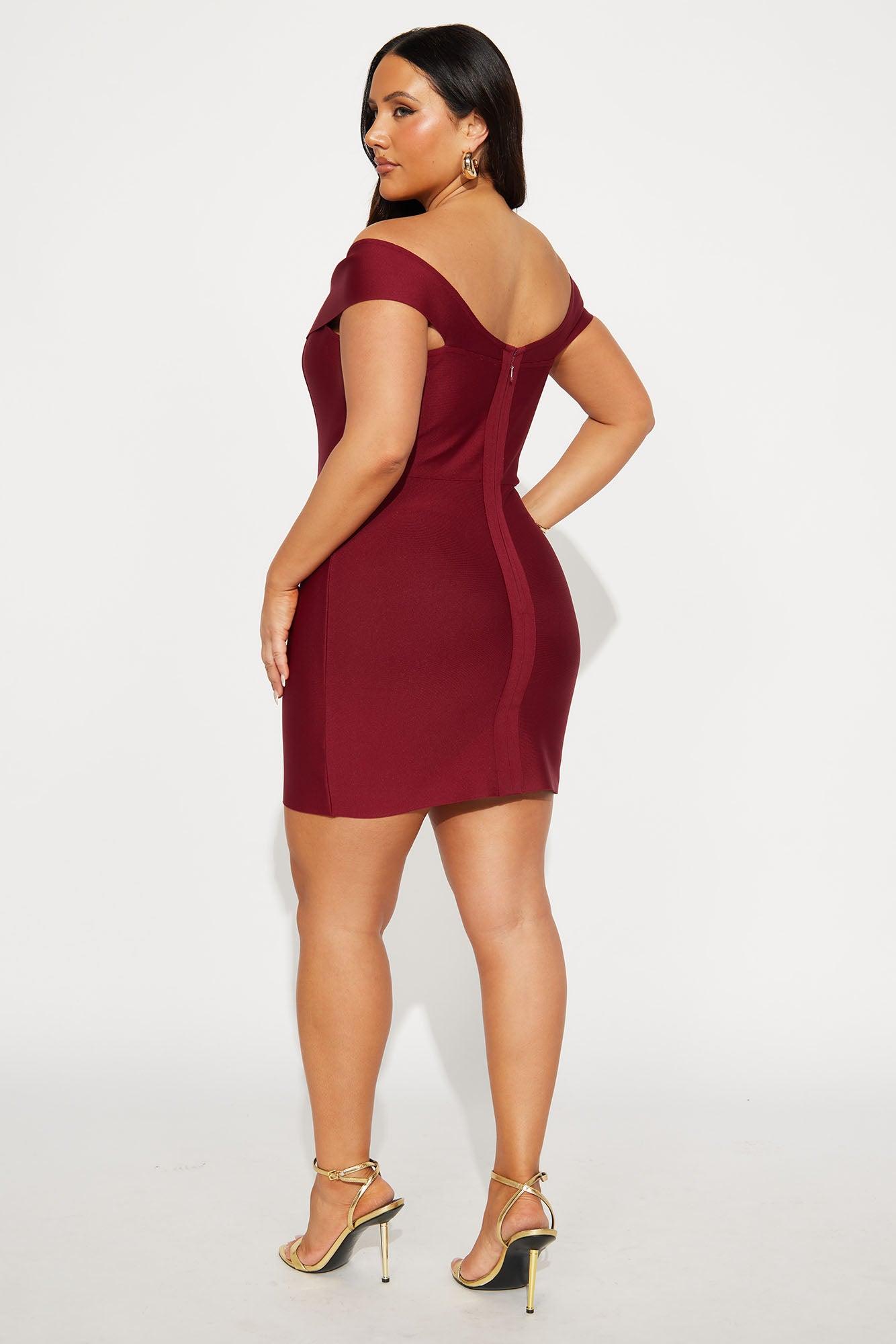Available In White And Wine. Bandage Midi Dress Off Shoulder Hidden Back Zipper Stretch Length Measured Flat = 32" Shell: 95%Polyester 5%Spandex Imported