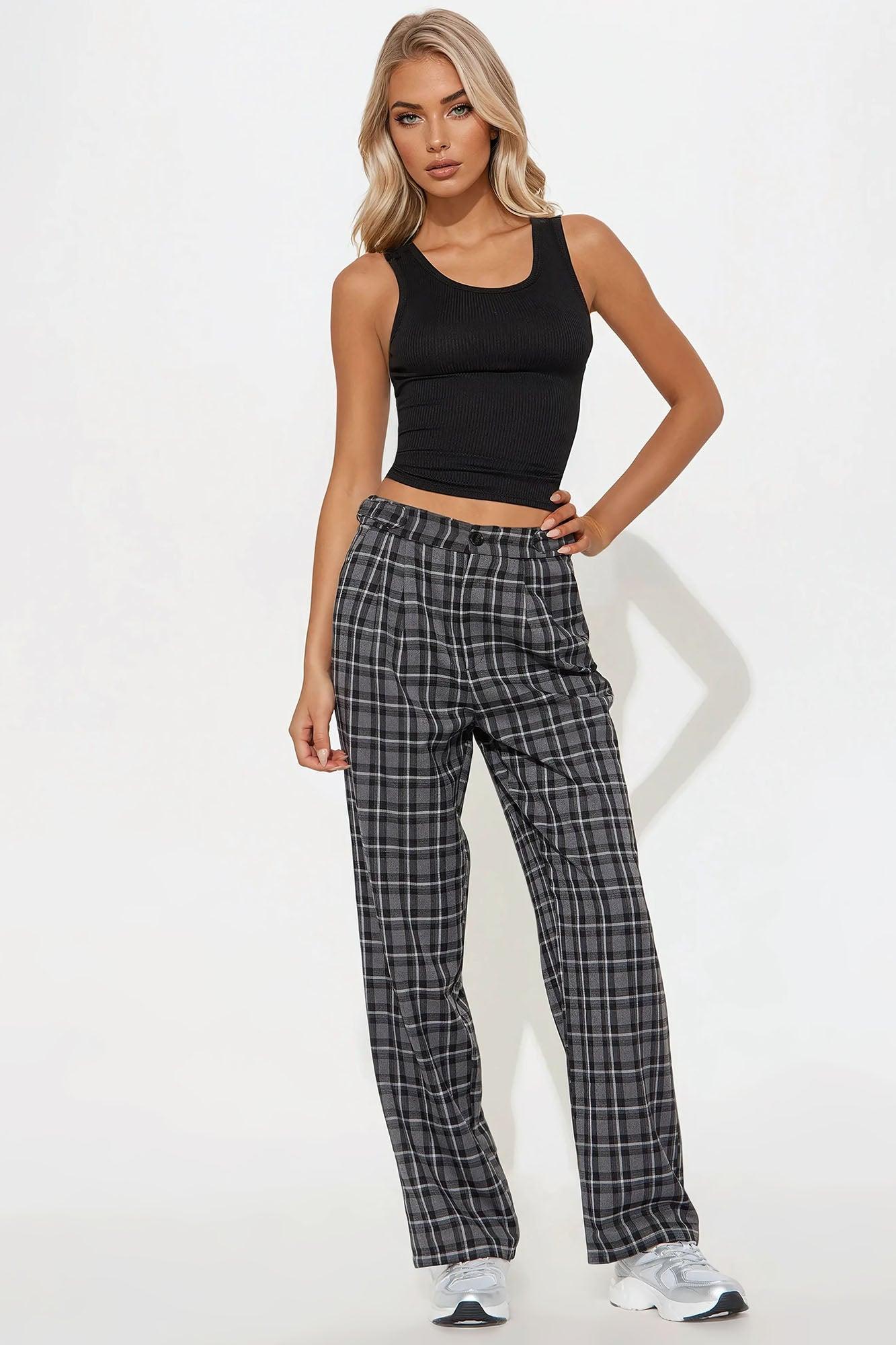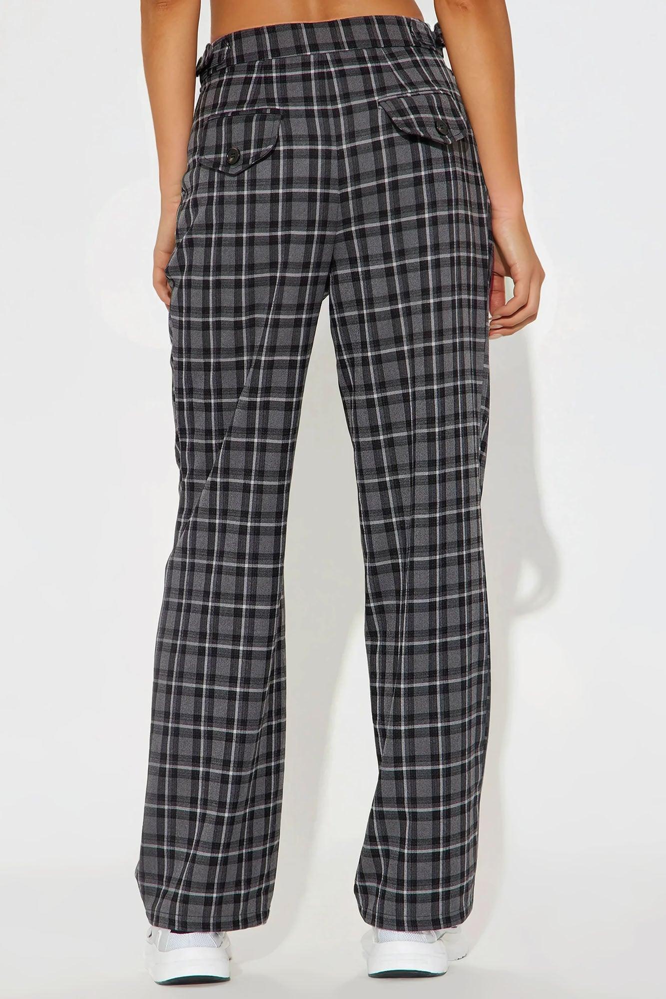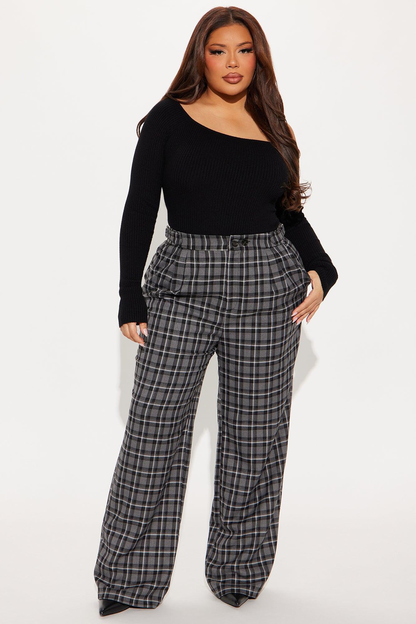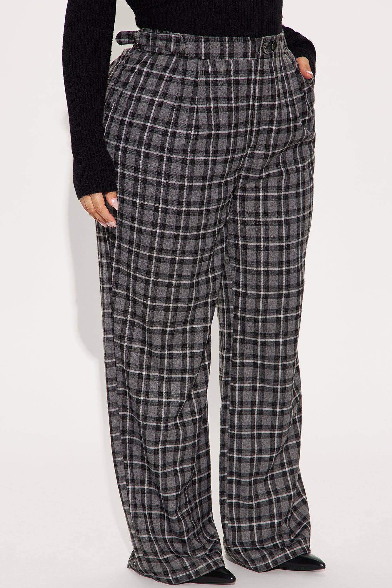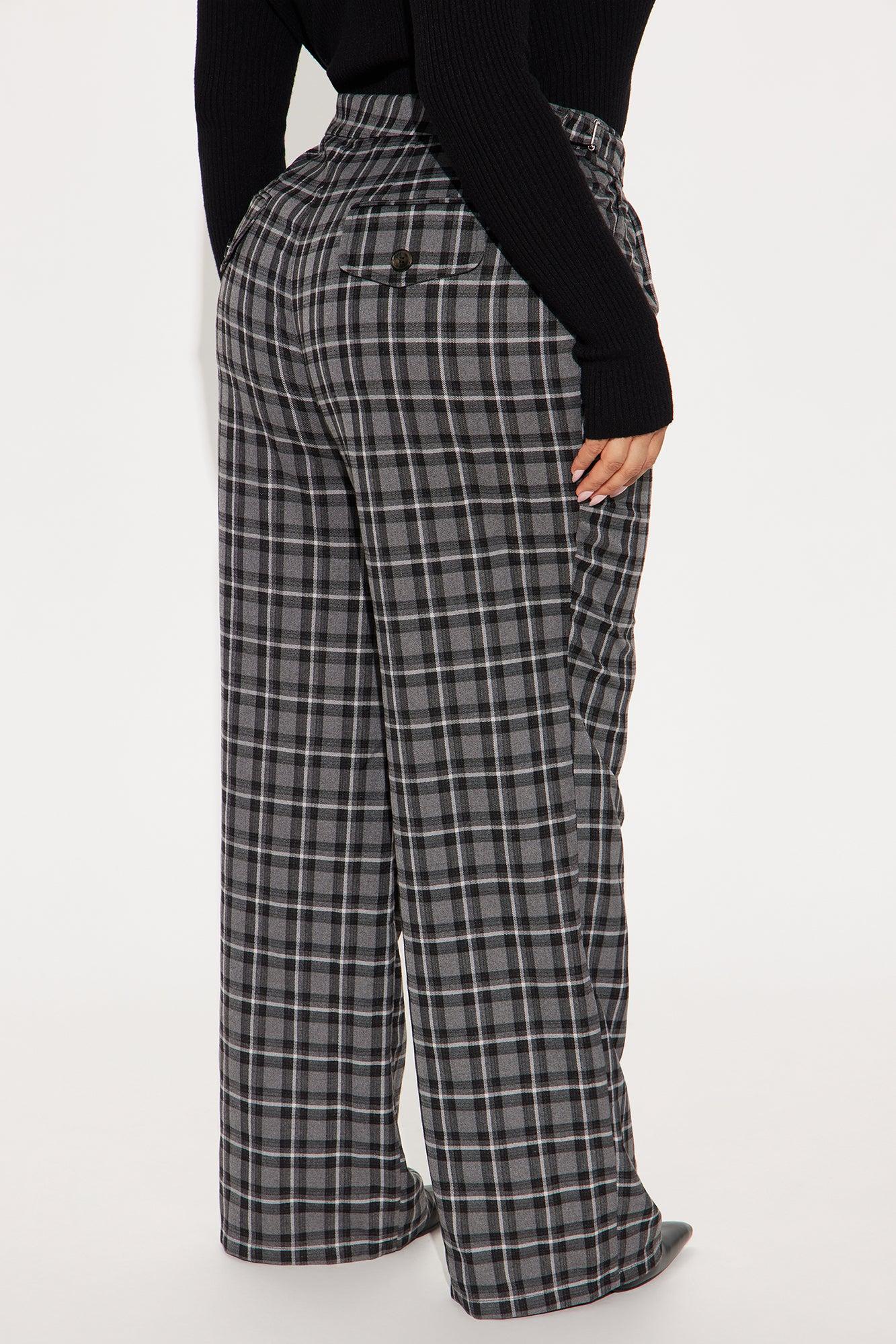 Available In Black/combo, Brown/combo And Green/combo. Trouser Pant High Rise Button & Zip Closure Adjustable Side Tab Detail Hand Pockets Nonfunctional Back Pockets Wide Leg Plaid Non Stretch 32" Inseam 78% Polyester 20% Viscose 2% Spandex Imported