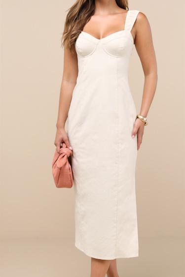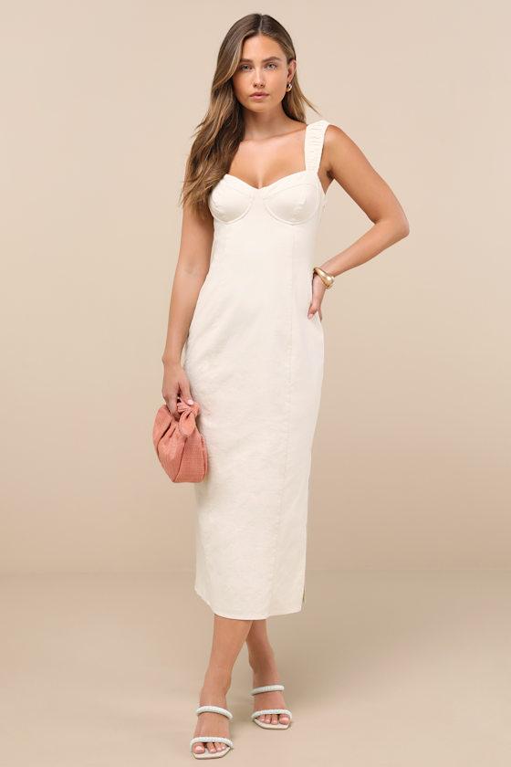 Effortlessly feminine and divine for date nights, this linen-like midi dress knows how to secure a second date (and maybe even a third). Ruched, elasticized cap-style sleeves frame the bustier bodice with underwire cups, all atop a figure-skimming column skirt with an alluring side slit for graceful movement. Smocked panel at back and a hidden side zipper/clasp.