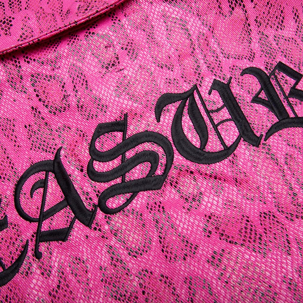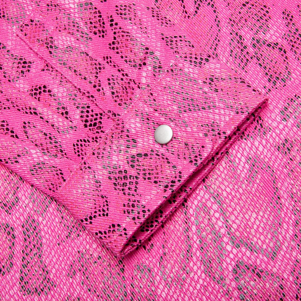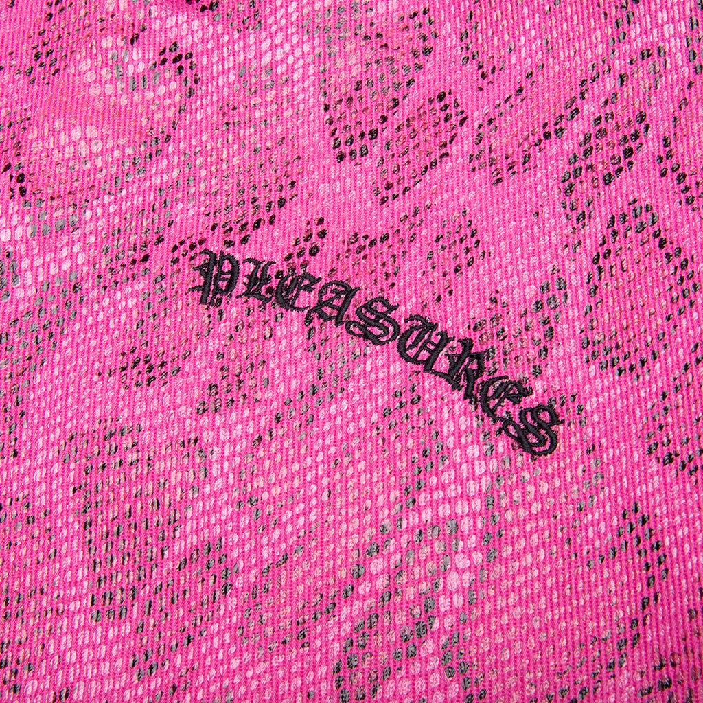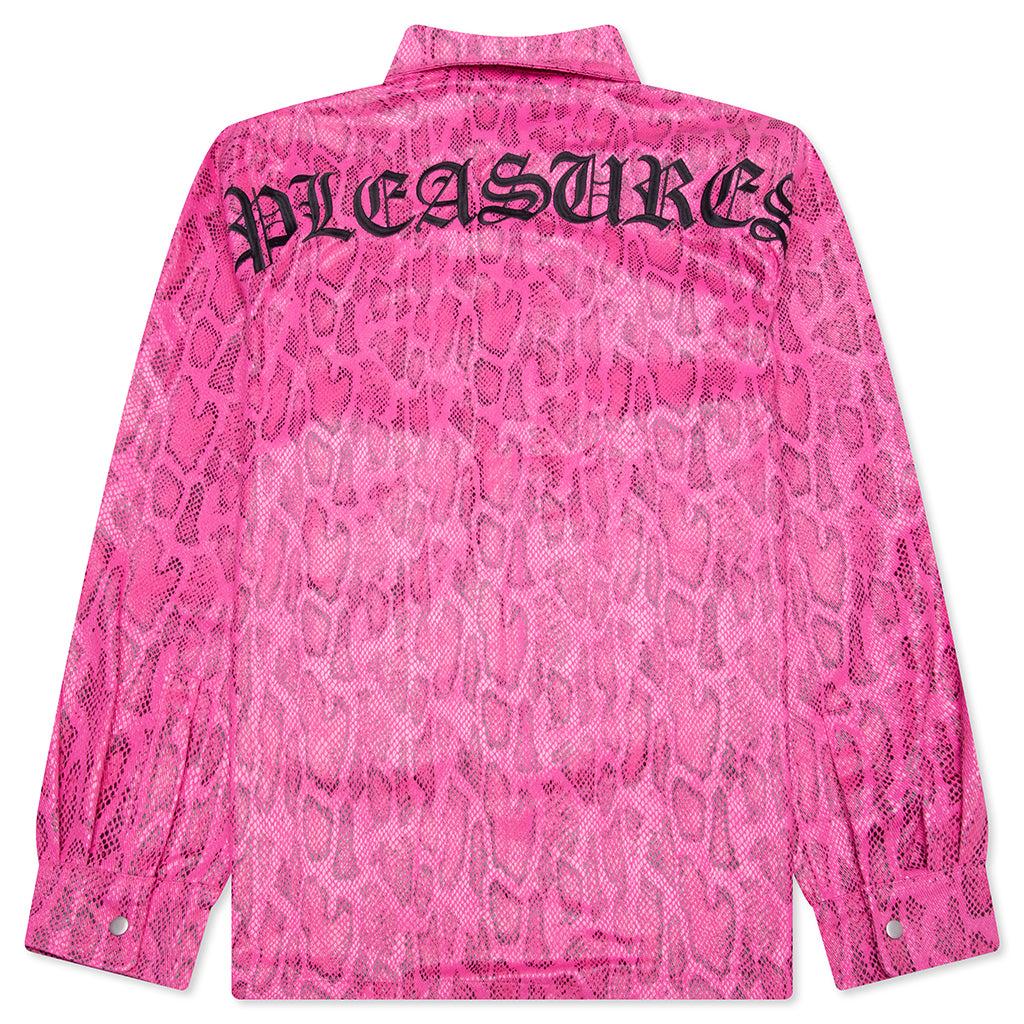 The Anaconda Overshirt from Pleasures is composed of 100% cotton with an all-over snake pattern gel print, creating a shiny texture. This garment has a classic collar with a full snap button closure down the front beneath the hidden placket. SOme finishing touches include the buttoned cuffs and the embroidered logo branding at the chest. 100% Cotton All-over gel print Snap button closure Hidden placket Button cuffs Embroidered branding Classic collar Style No: P25SP004-FUCHSIA