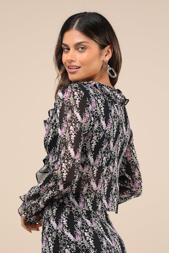 An OOTD styled with the En Saison Anai Black Floral Print Ruffled Tie-Front Long Sleeve Top will make everyone swoon! Lightly textured, flat woven fabric (with a purple and green floral print) shapes a ruffle-trimmed V-neckline that continues down to functional twin ties that secure the front. Long sleeves with ruffled cuffs frame the blousy silhouette that finishes at a slightly cropped hem. Pair with the matching skirt for a complete look!