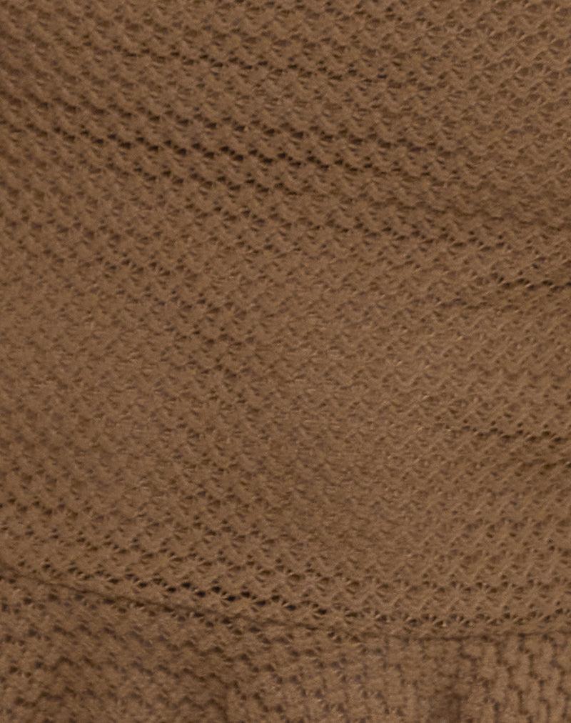 The Analu top in brown open knit features a peplum hemline, cami straps with bead detailing, and a mesh-lined front. The back is unlined. Pair with our low rise Roomy jorts. MODEL WEARS SIZE: SMALL - MODEL HEIGHT:5'9