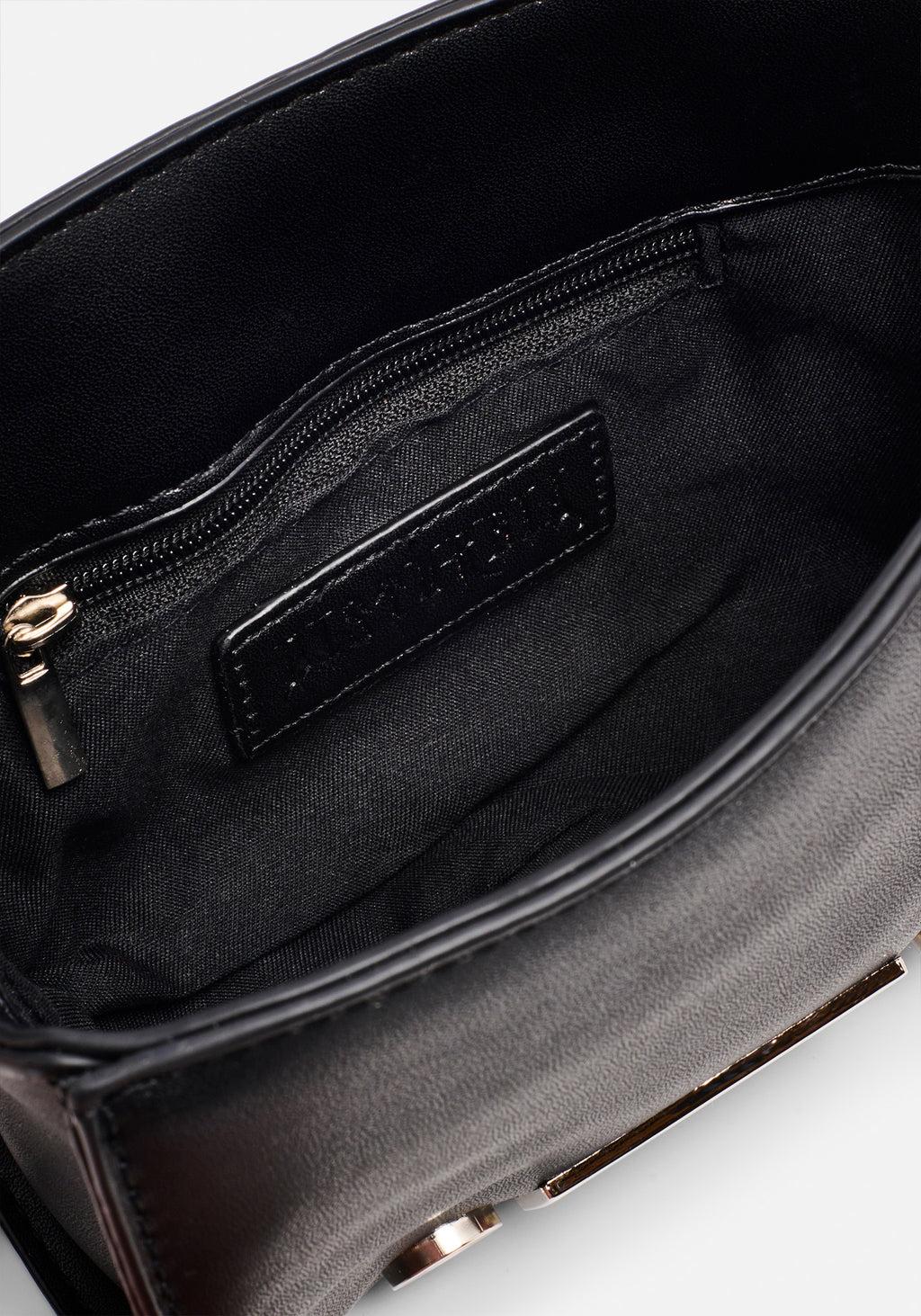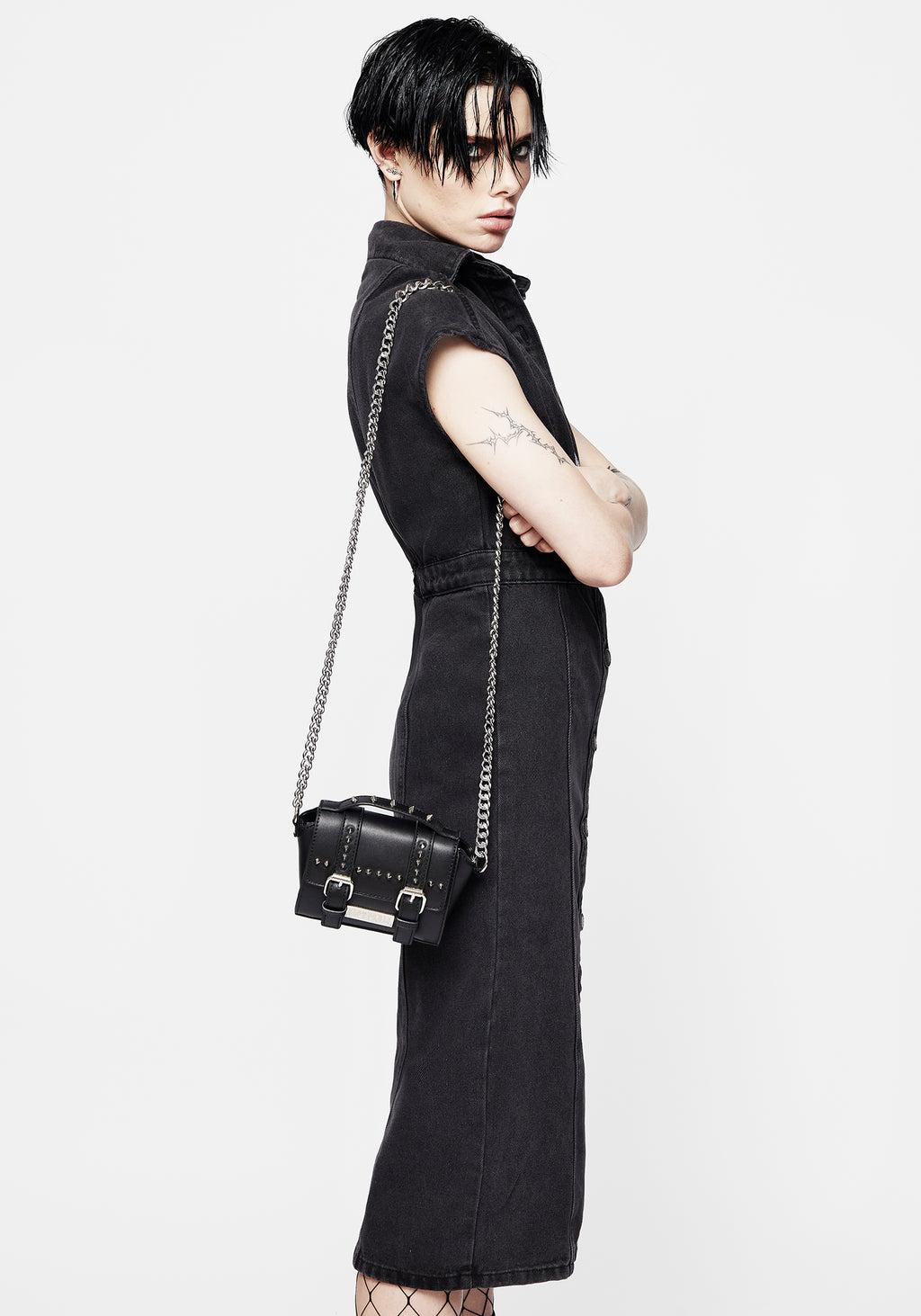- Mini black faux leather shoulder bag with spike studs - Dainty size is surprisingly spacious (holds a phone + card holder + keys + small essentials easily) - Satchel-style opening fastens easily with magnetic clasps on faux buckled flaps - One internal pouch & one internal zipped pocket for a lil’ organisational moment - Silver conical studs on straps, flap & handle (may or may not ward of nefarious folk) - Silver chain shoulder strap for comfortably carrying (or tuck it into the bag to make a clutch) - Silver branded nameplate on front so they know who sent ya Main: 100% PU leather Lining: 100% cotton Dimensions: 12cm x 20cm x 6cm