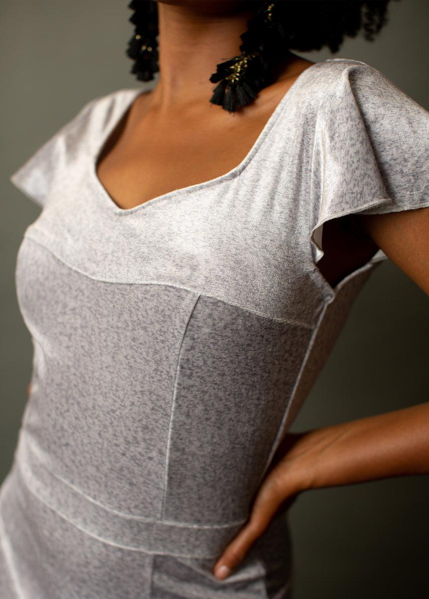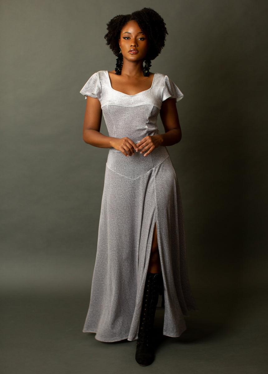 This luxurious dress features a soft velvet that will give your wardrobe a unique upgrade. Princess seams Inset waist belt High hip paneling Flutter Sleeves Sweetheart neckline Scooped back neckline Full maxi length 95% Polyester, 5% Spandex Hand wash (inside out), line dry //FINAL SALE//