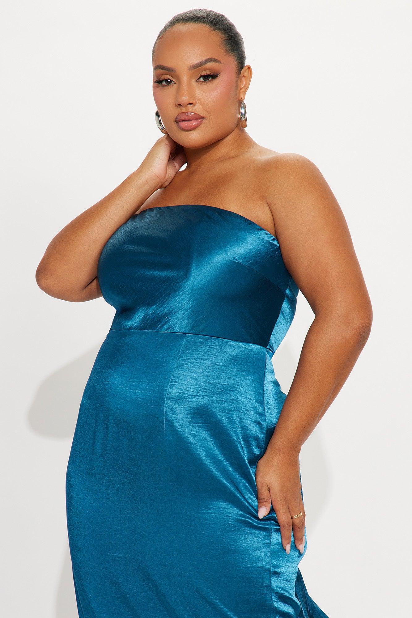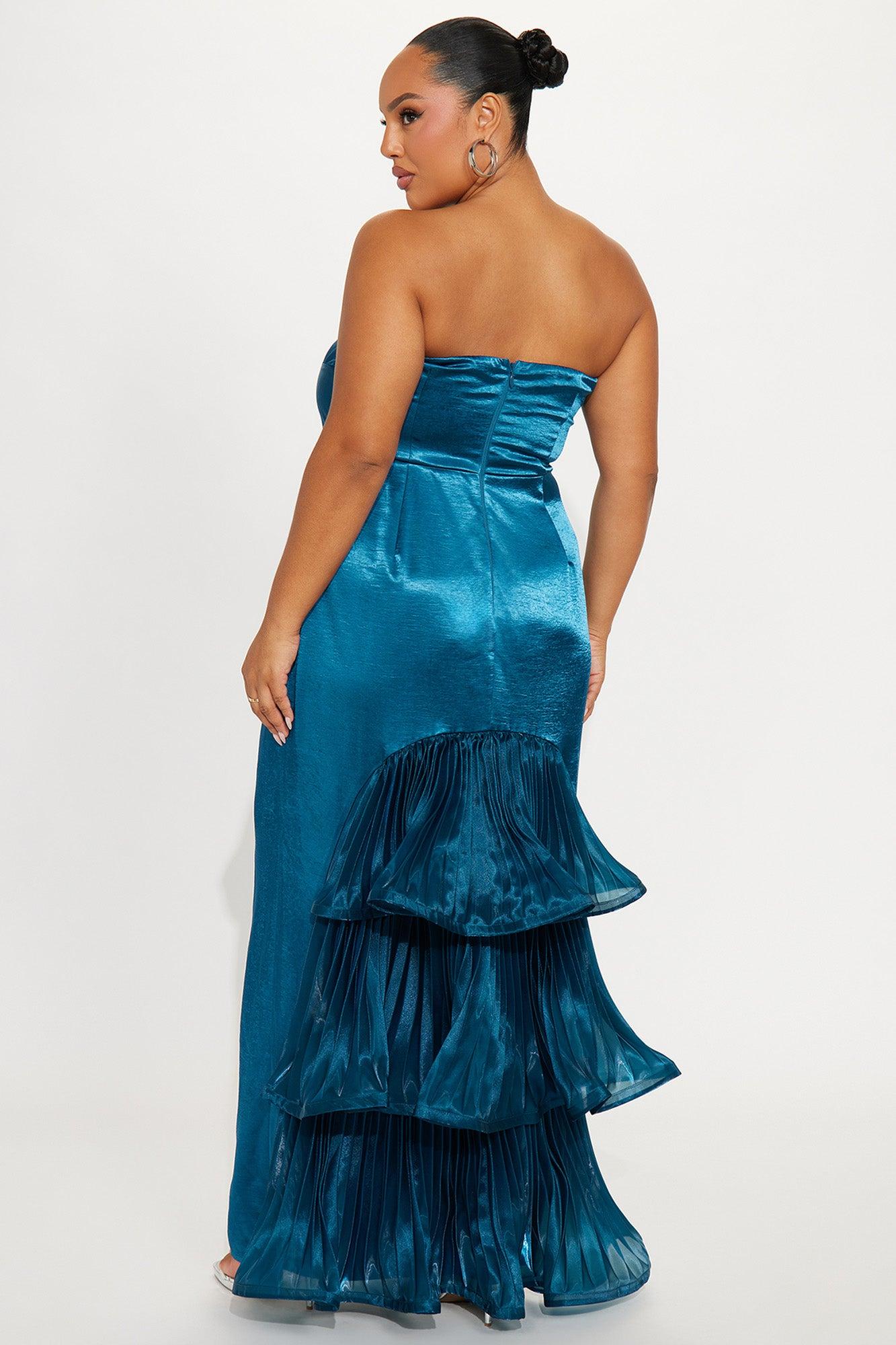 Available In Blue. Satin Gown Straight Neckline Strapless Ruffle Train Detail Back Zipper Closure Non Stretch Self: 100% Polyester Contrast: 100% Polyester Lining: 100% Polyester Imported