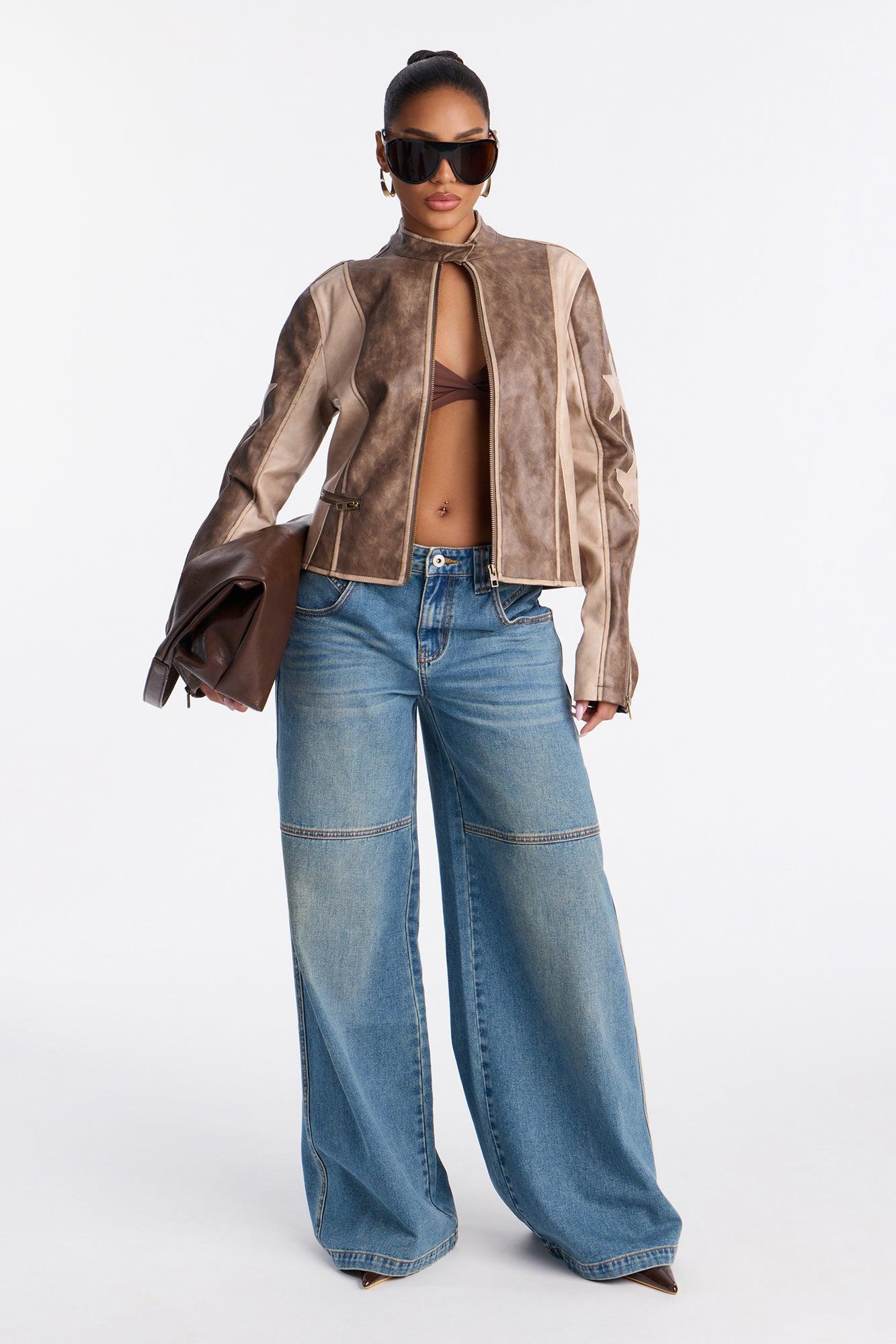 Anaya Star Washed Faux Leather Bomber Jacket - Mocha Female