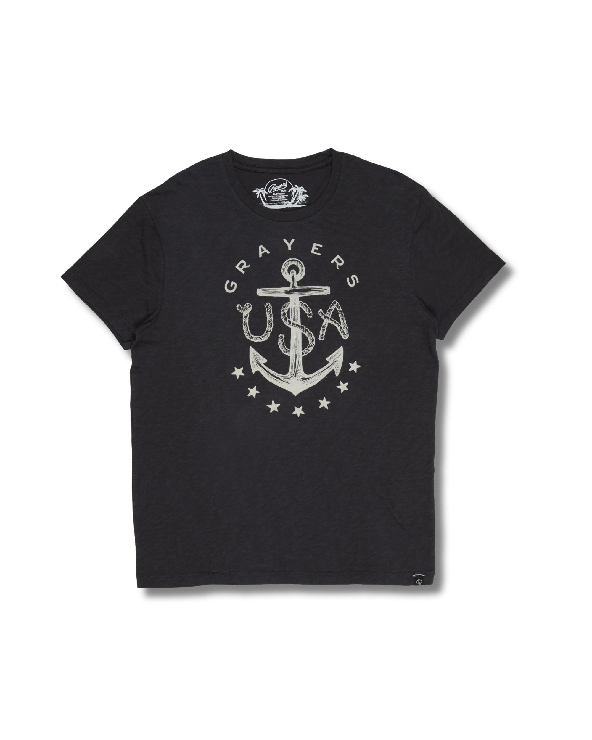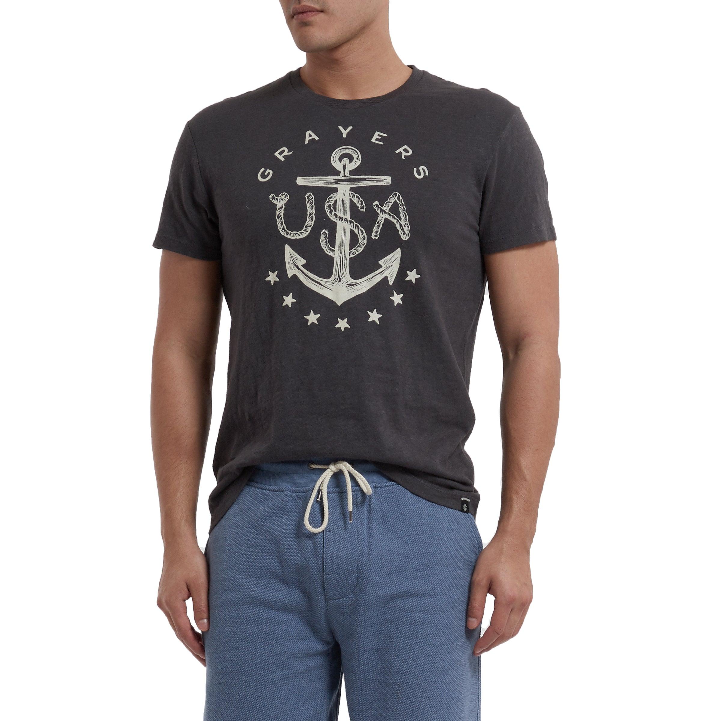 We've used traditional "discharge" printing techniques to bring our iconic images of Grayers to a soft and weathered slub jersey tee shirt. Just in time for summer. Rib collar Sand washed 100% Cotton (slub yarn) Imported Style with Montague Terry Twill Drawcord Shorts 8" - Blue Heather; SeaVees Legend Sneaker Standard - Granite Grey Canvas