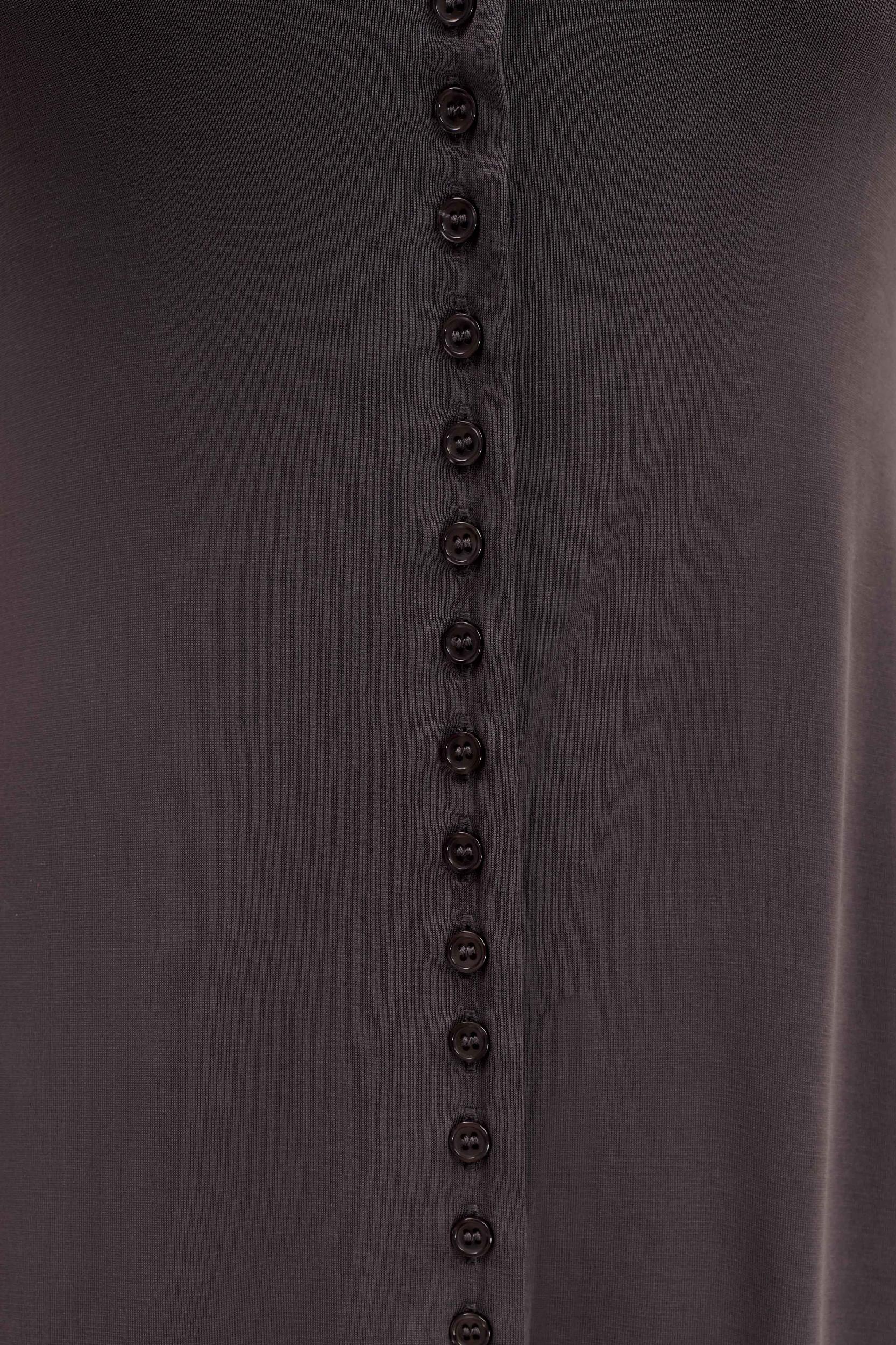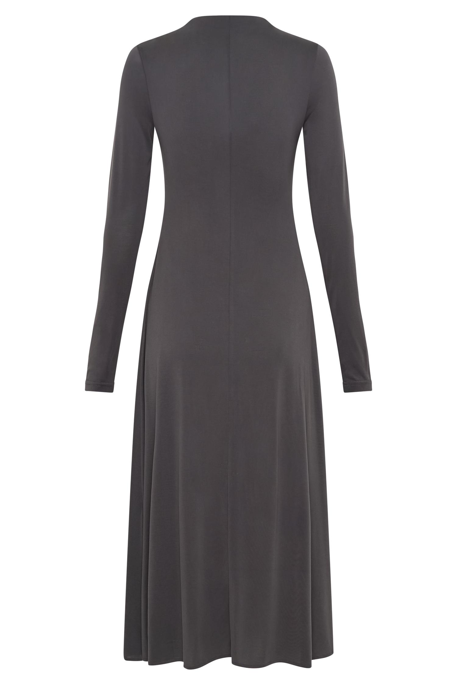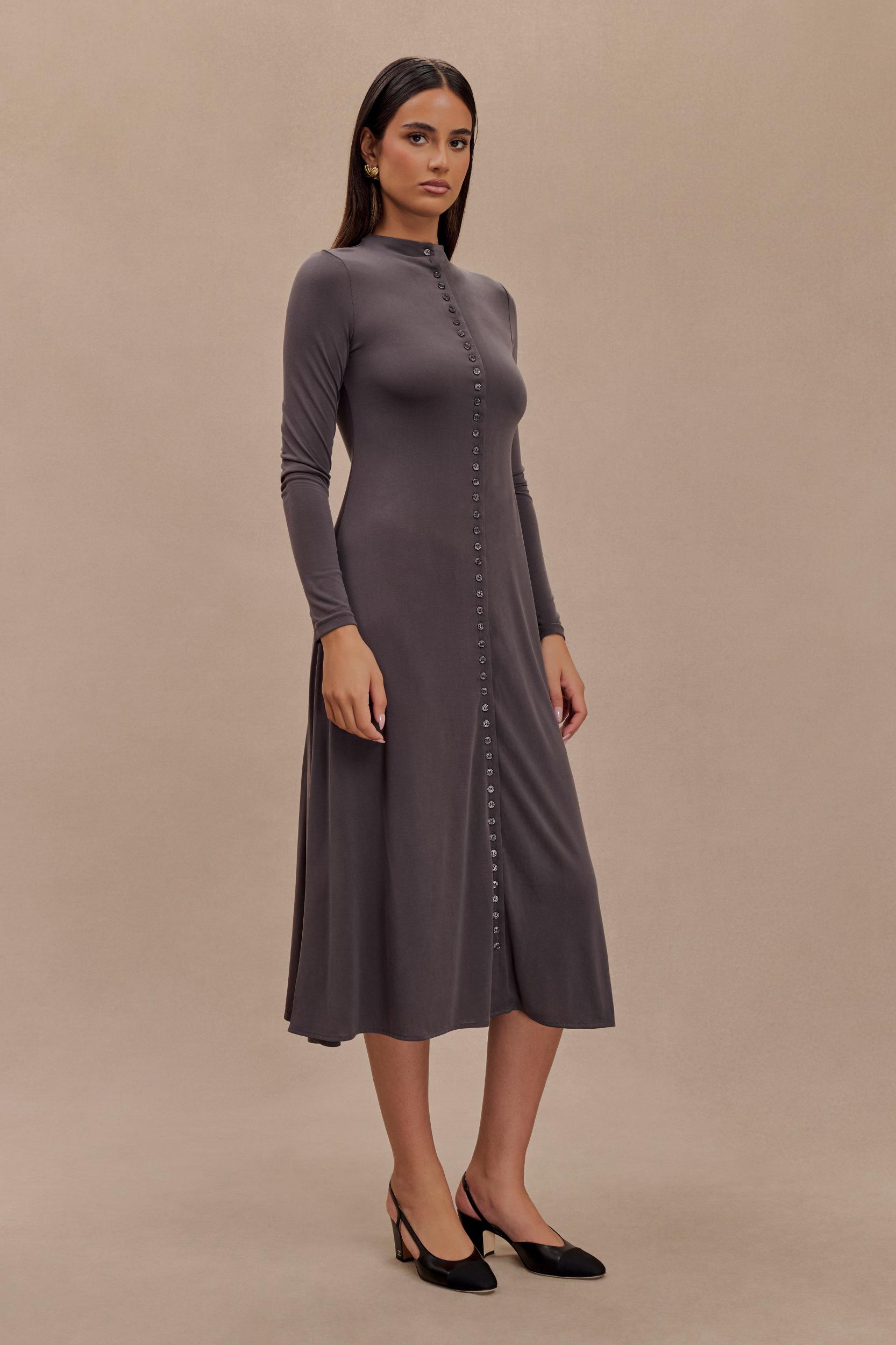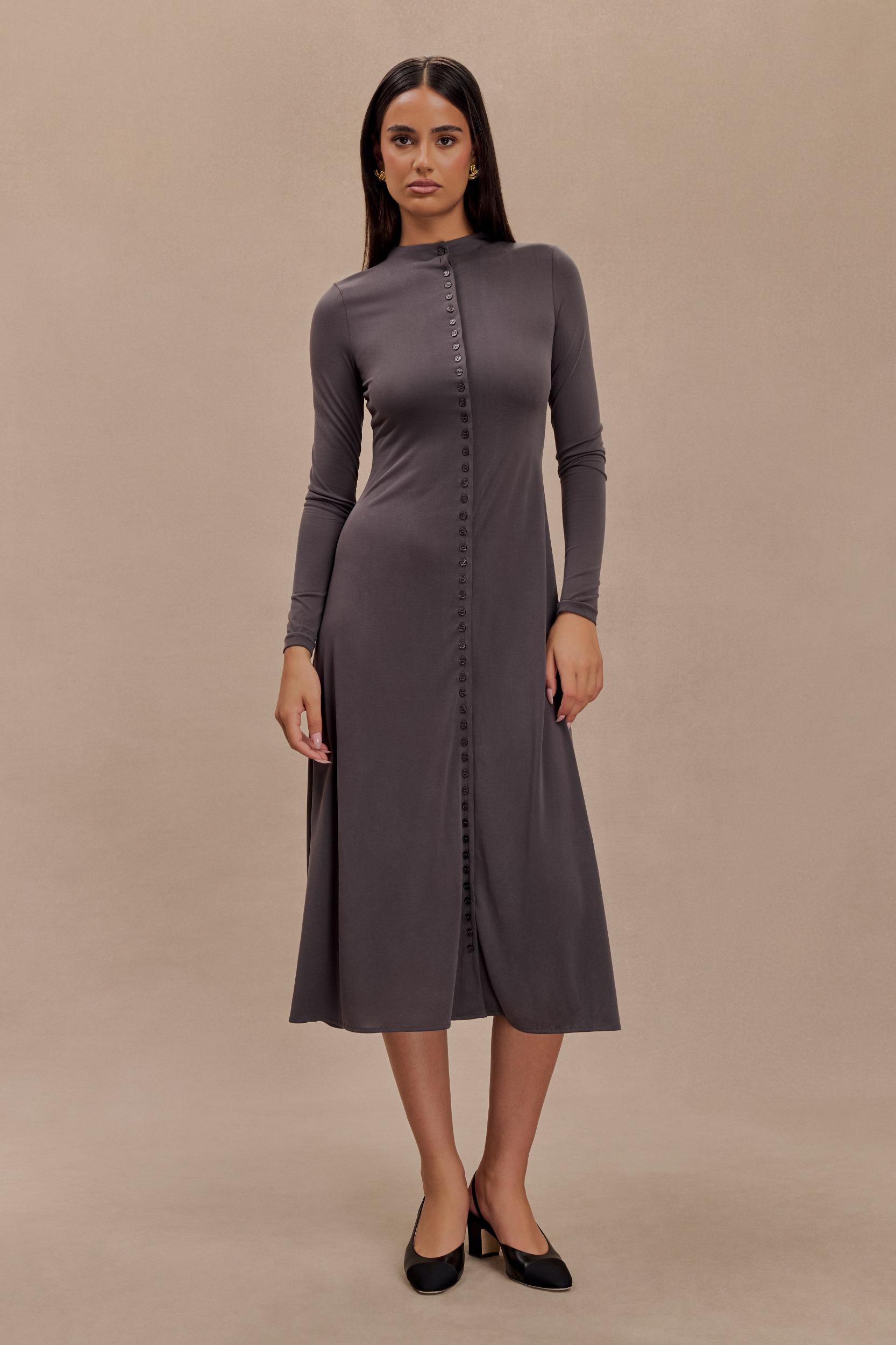 Comfortably chic. The ANDERS Peached Jersey Midi Dress combines comfort with sophistication. Featuring a grown-on neckline and long sleeves, this dress provides a sleek and fitted silhouette that flatters your figure. The maxi length and flared hem create an elegant flow, while the functional centre front button closure adds a classic touch. Crafted from soft peached jersey, this dress offers a cozy yet refined look, perfect for both casual and semi-formal occasions.