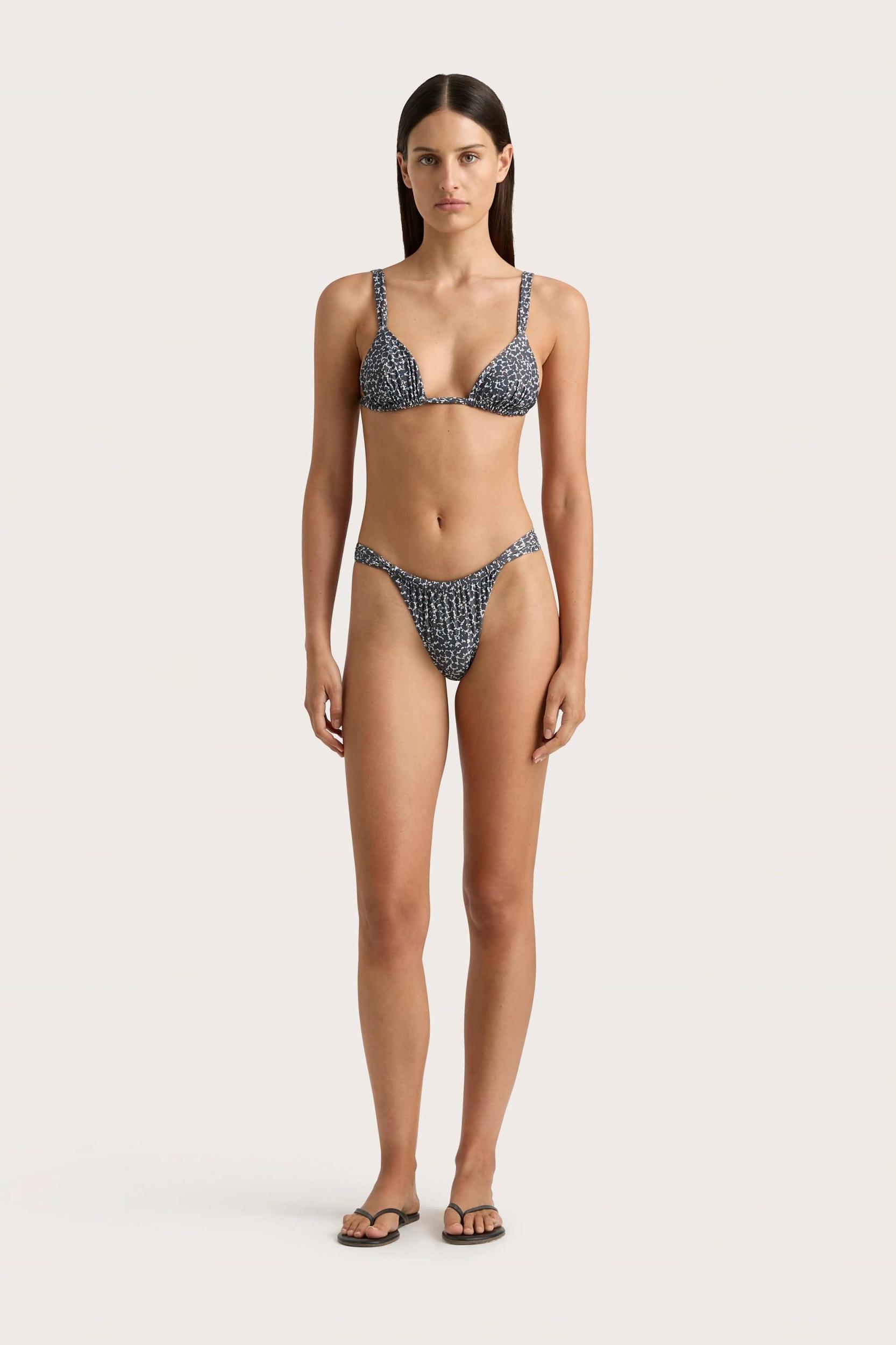 A triangle bikini bottom in a Charred Navy micro floral, designed to sit high on the hips. A silhouette signature to FAITHFULL, style with the Mary Bikini Top for a matching set.