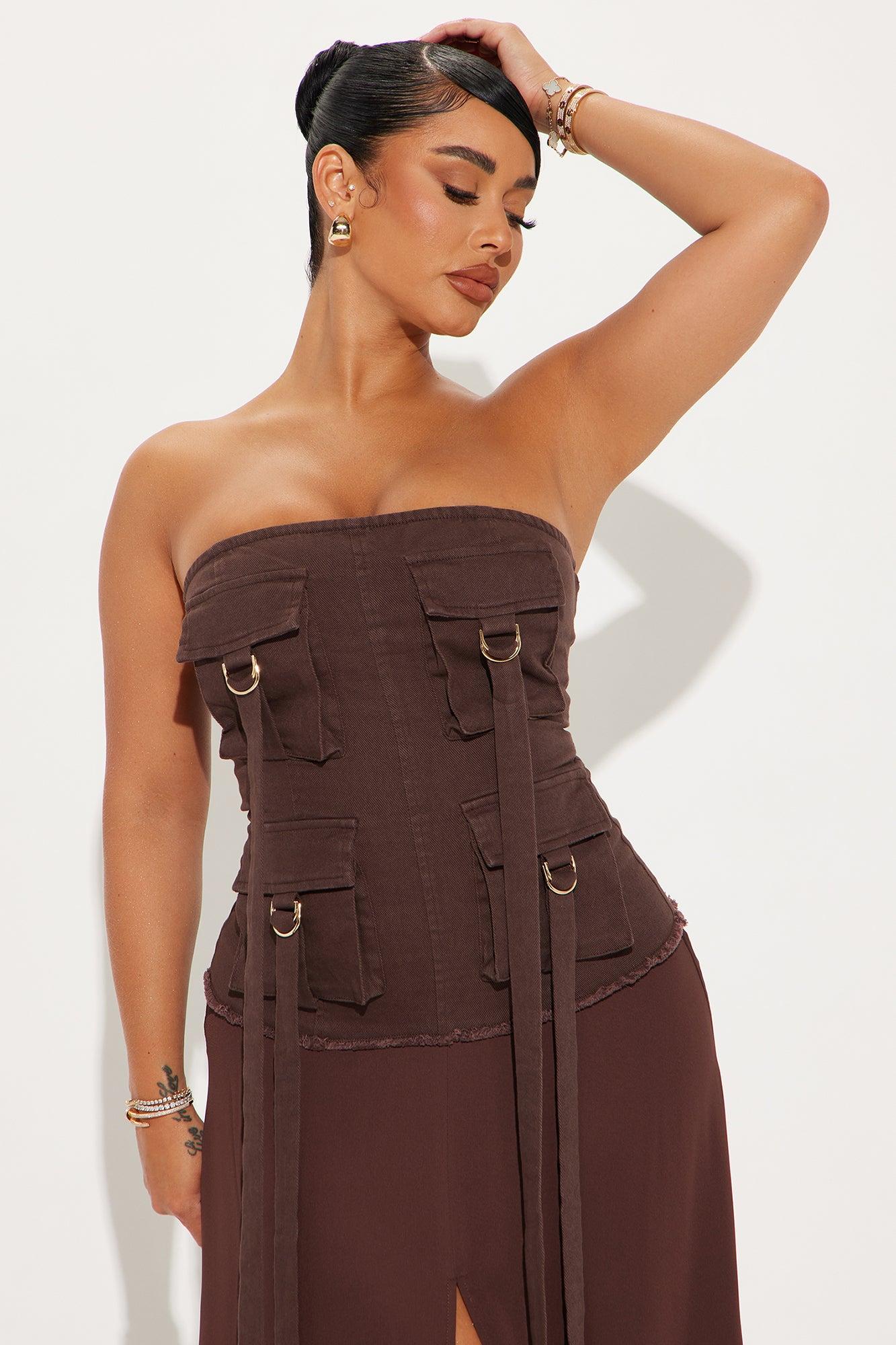 Available In Chocolate. Maxi Dress Denim Top With Cargo Pockets High Slit Back Zipper Stretch Self: 97% Polyester 3% Spandex Contrast: 100% Polyester Imported