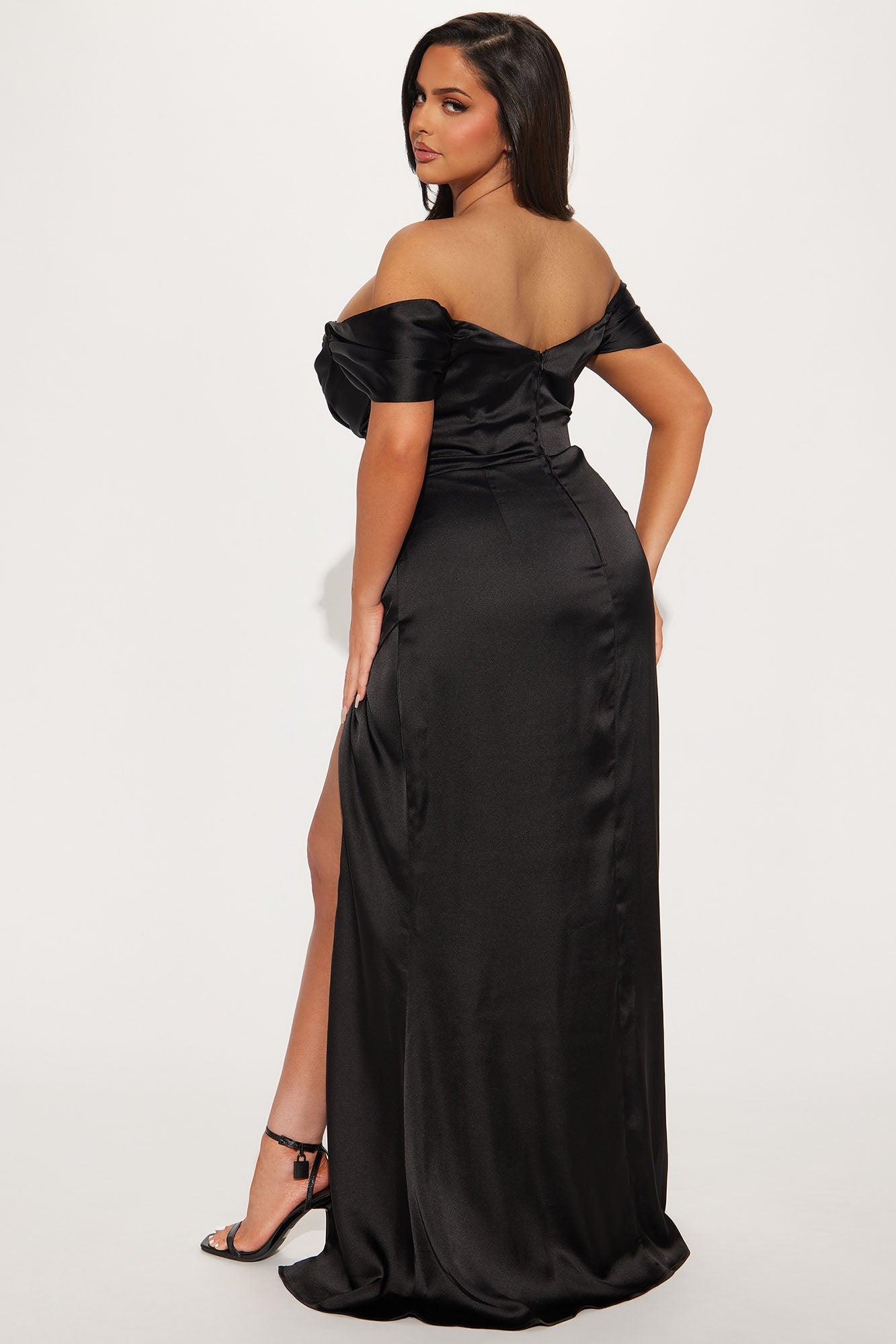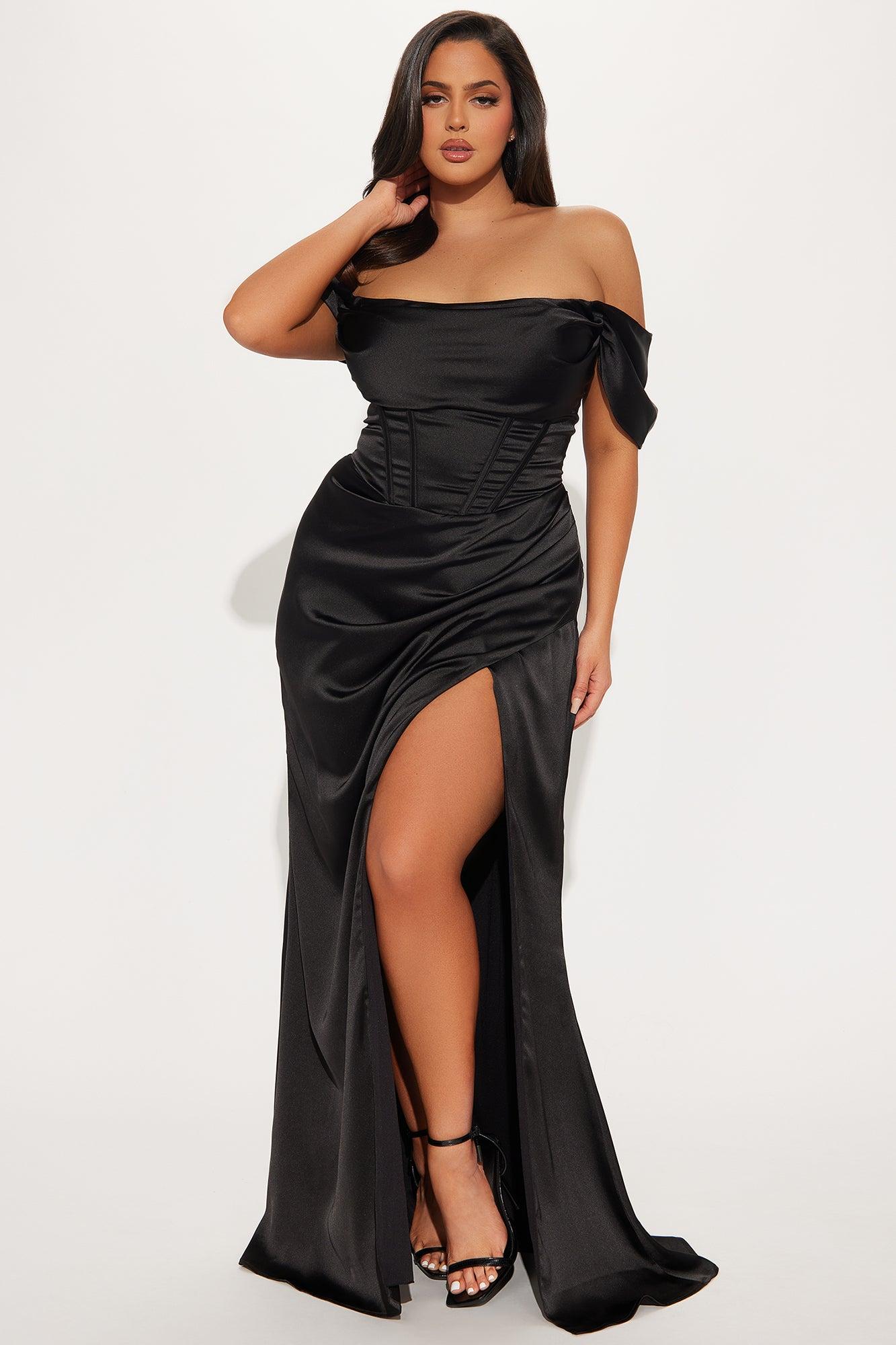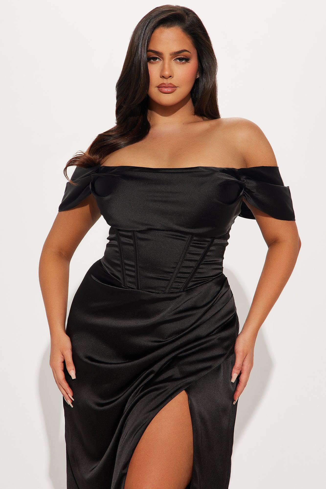 Available In Black. Gown Off Shoulder Short Sleeves Corset Waist w/ Boning Padded Bra Cups Ruched High Side Slit Hidden Back Zipper Small Back Center Slit Lined Stretch Shell: 97% Polyester 3% Spandex Lining: 100% Polyester