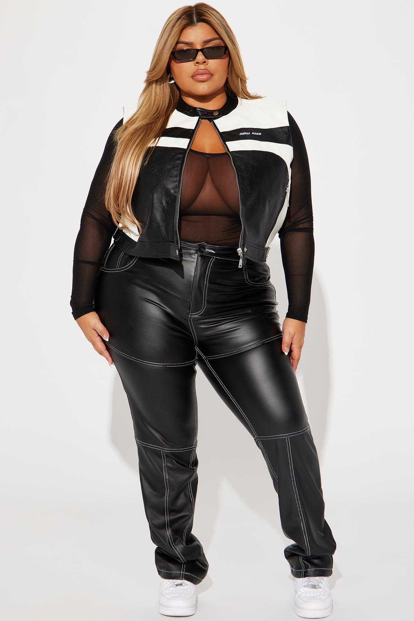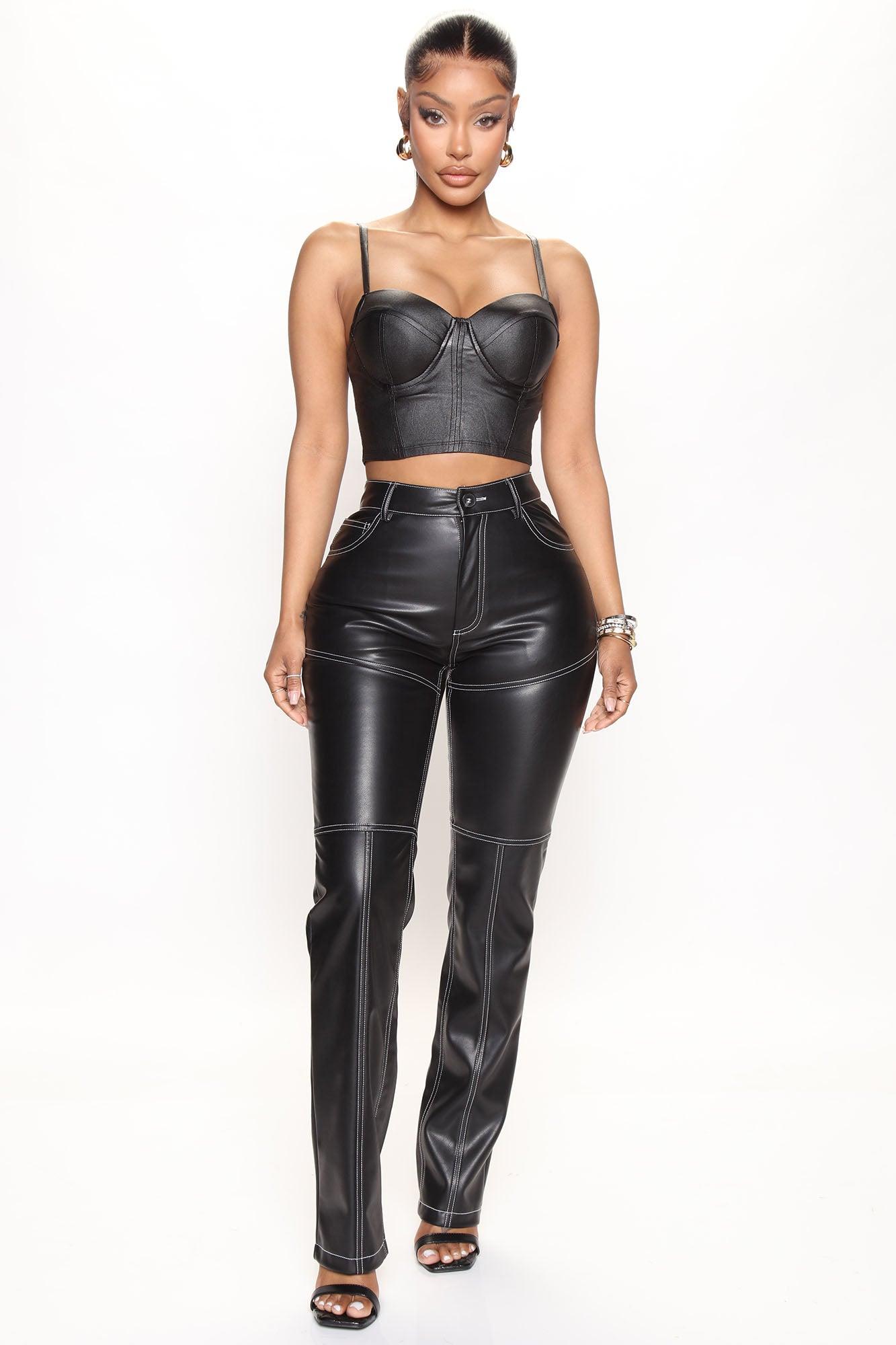 Available In Black And Cognac. Faux Leather Pant Straight Leg Belt Loops Zipper And Button Closure Pockets Contrast Stitching Coating: 100% Polyester Base Fabric: 95% Polyester 5% Spandex Imported