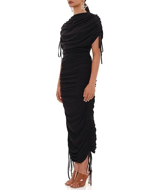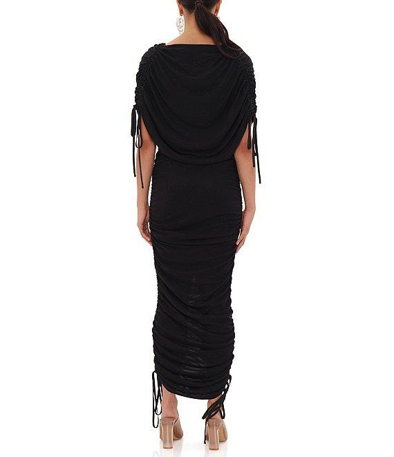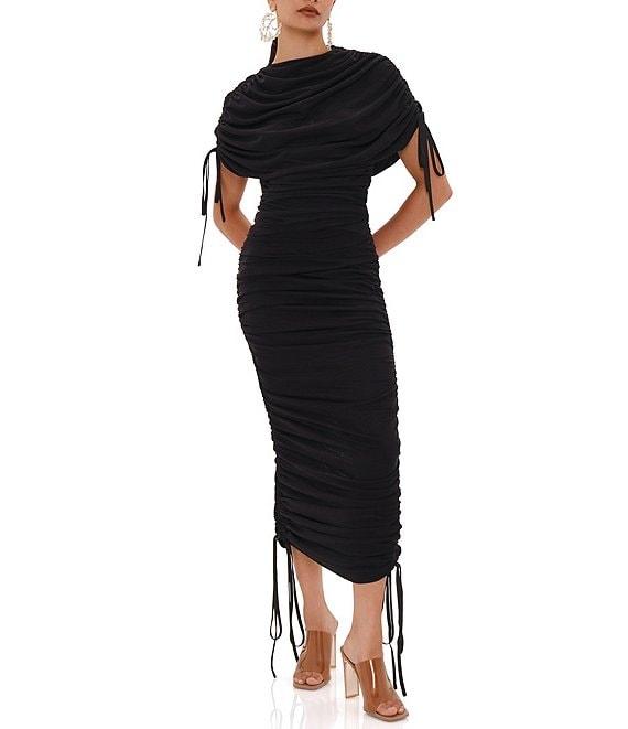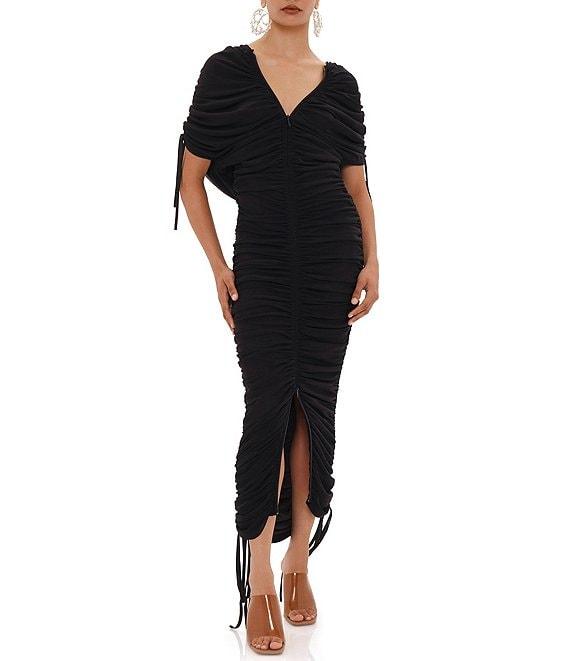 From Andrea Iyamah, this dress features: Layered mesh fabrication Boat neckline Can be worn as a v-neckline with zip front Short sleeves with ties Ruched throughout body Side tie details Tapered hem Full zip construction can be worn front or back Approx. 48" length Polyamide/spandex Hand wash Imported.