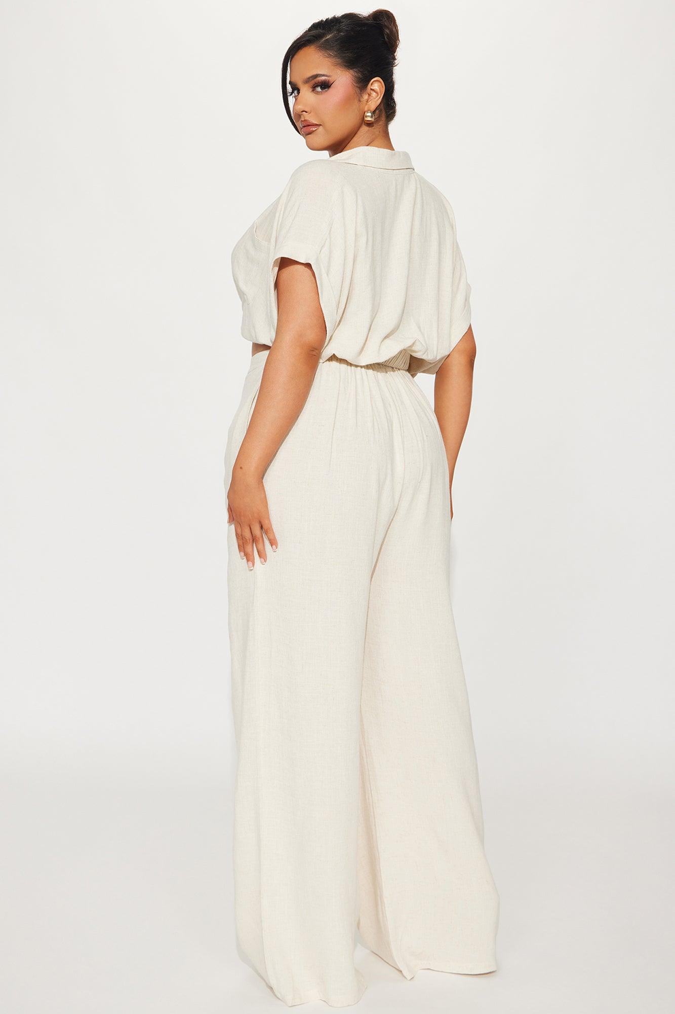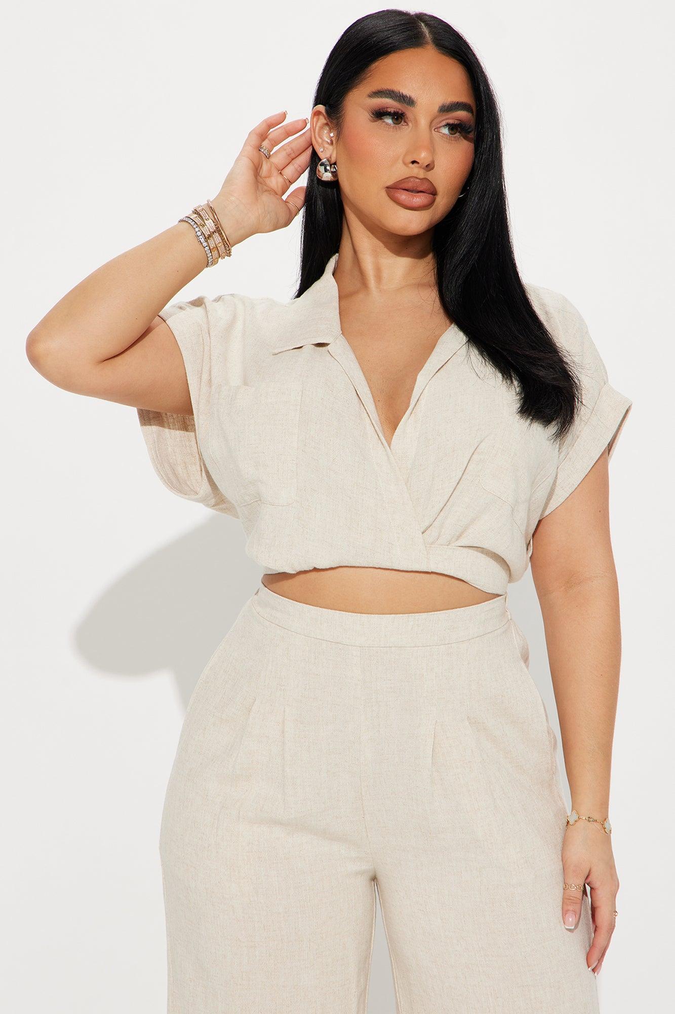 Available In Black, Chartreuse And Oatmeal. Linen Pant Set Crop Top Collar Surplice Short Sleeve Wide Leg Pant Pockets Partial Elastic Waistband 33" Inseam 70% Rayon 30% Linen Imported