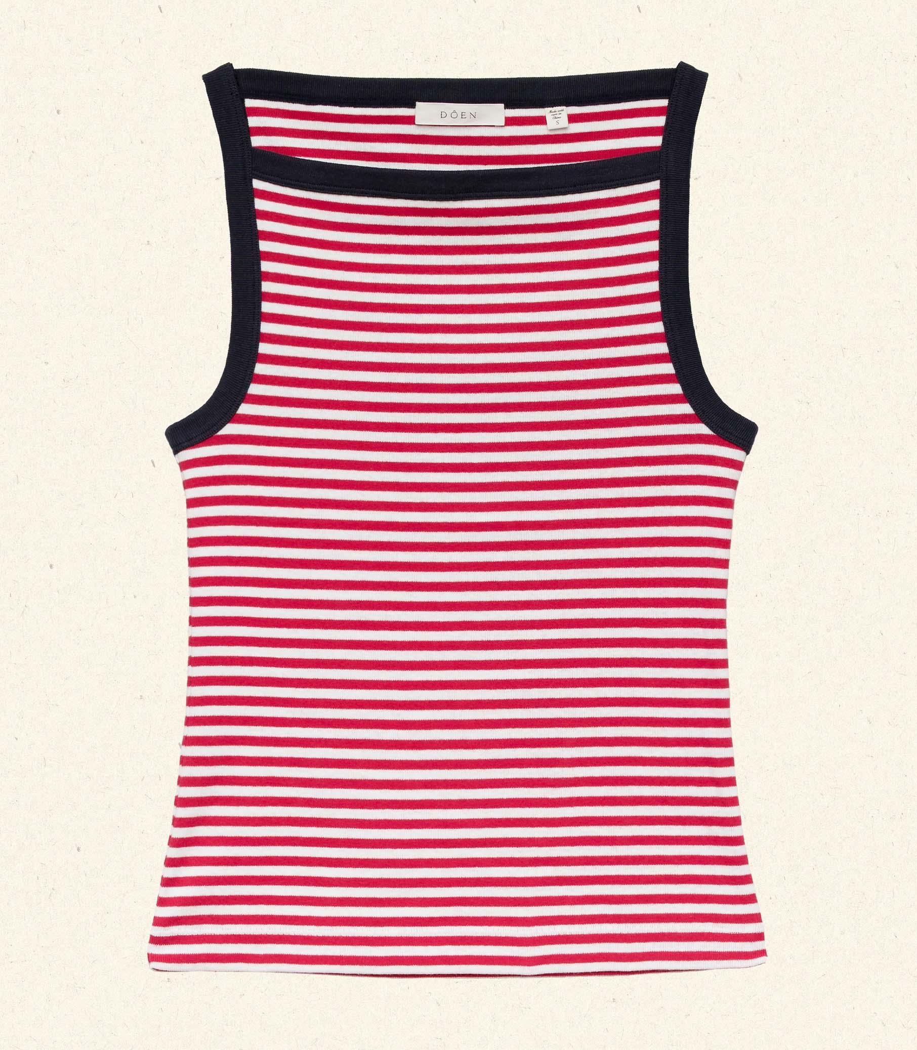 Rendered in our yarn-dyed Nantucket Stripe, the Andrea Tank is crafted from a soft blend of regenerative and recycled cotton, featuring a fitted silhouette, square neckline, and skinny straps. Navy contrast trims at the neckline and straps lend a playful touch.