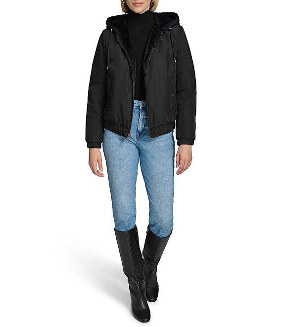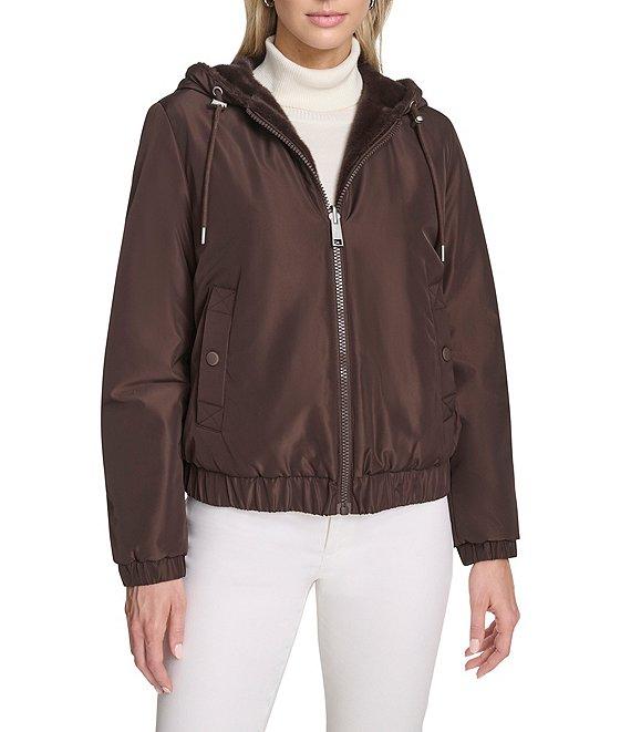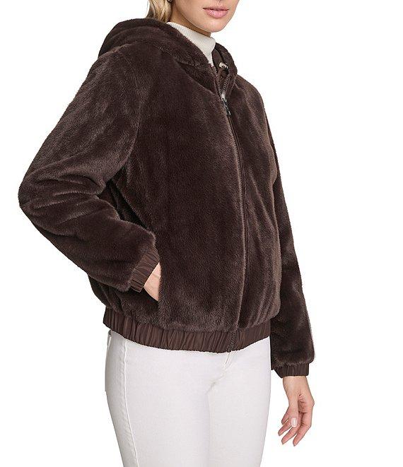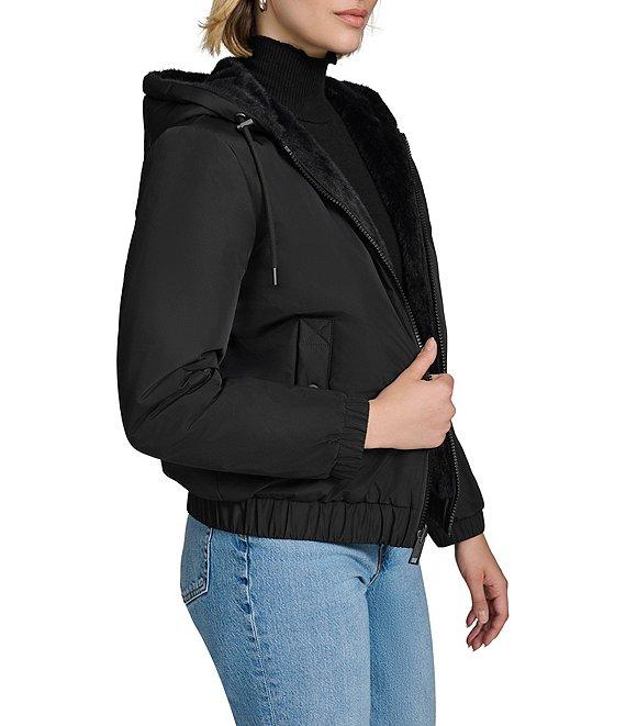 From Andrew Marc Sport, this jacket features: Micro sheen shell fabrication Reverses to faux fur Hooded neckline Long sleeves 2 body welt pockets/inseam pockets Elastic detail at sweep Attached hood Center front zip closure Approx. 23.5" length Polyester Lined Polyfill Dry clean only Imported.