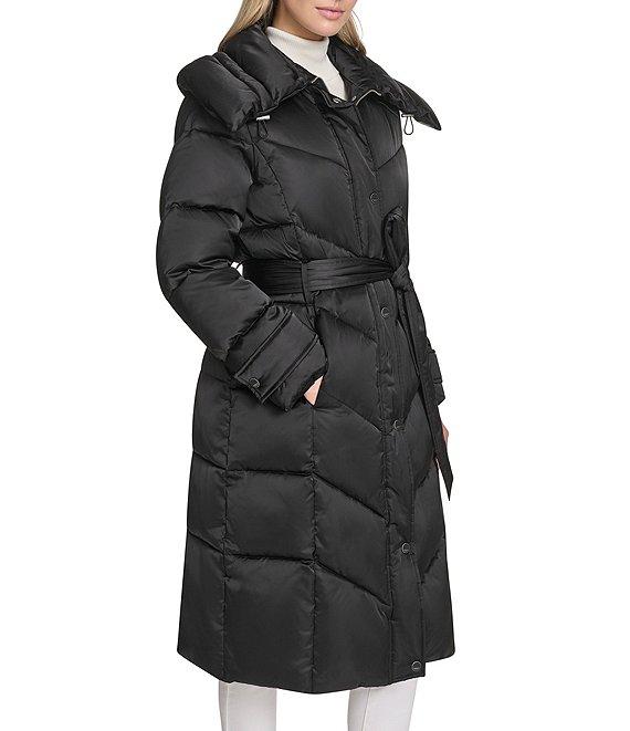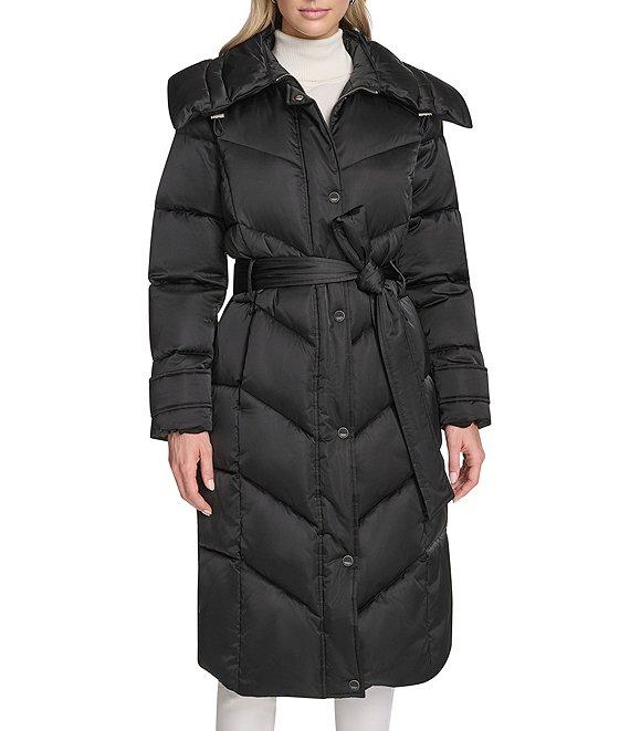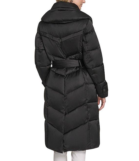 From Andrew Marc Sport, this coat features: High shine satin fabrication Puffer silhouette Mix chevron horizontal rail quilt pattern Oversized collar neckline with bungee drawcord detail Long sleeves with cuff tab with snap detail Two inseam pockets with snap closure Interior pocket Belted Faux flange at back Faux down fill Water resistant Regular fit Straight hemline Zip front closure Approx. 39.5" length Polyester Dry clean Imported.