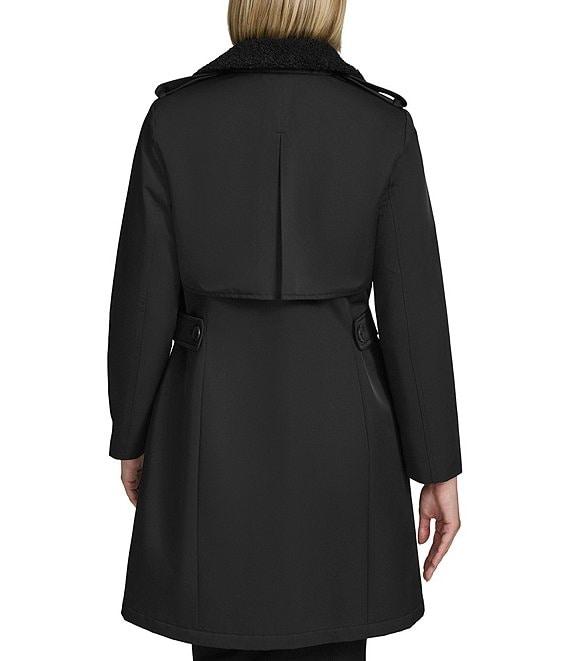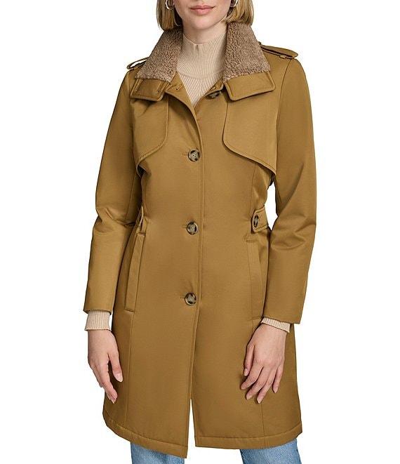 From Andrew Marc Sport, this coat features: Twill sateen fabrication Trench coat silhouette Funnel collar neckline Long sleeves Epaulettes at shoulder Functional welt pockets Attached faux sherpa at the inner collar Upper back flange detail Waist tab and button detail Vertical rail quilt with light at the inner body and sleeve Quilt lining with lightweight Water resistant Straight hemline Button front closure Approx. 37.50" length Polyester; lining: polyester Dry clean Imported.