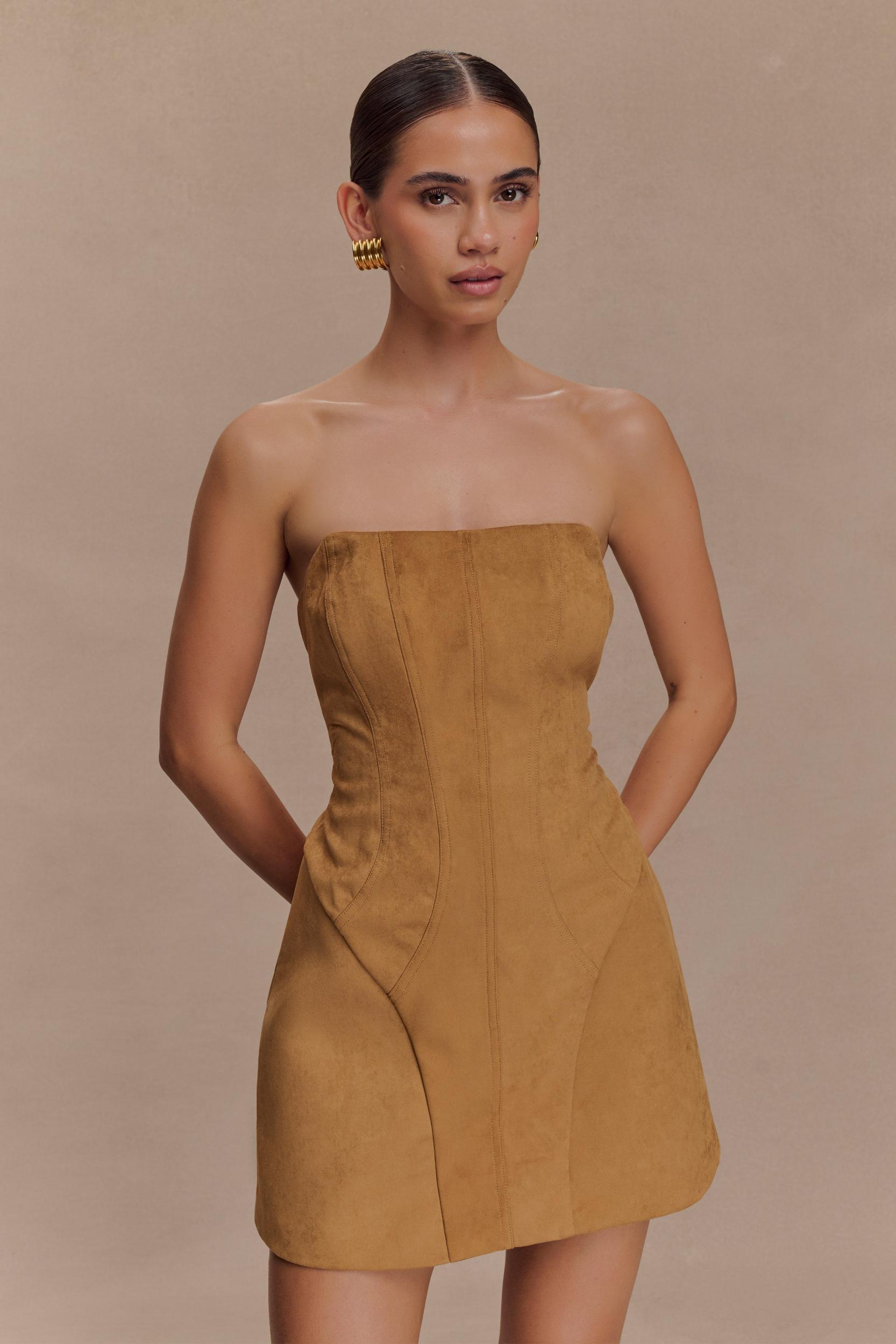 A soft take on strong style. The ANDY Faux Suede Mini Dress delivers sleek structure with a soft touch. Designed in a luxe faux suede, this strapless mini features curved topstitched lines and waist seams to enhance and define your shape. An internal grip tape keeps the neckline secure, while the invisible zip offers a smooth finish. Fully lined for comfort and cut in a bodycon silhouette, this dress is your go-to for effortless sophistication—day or night.