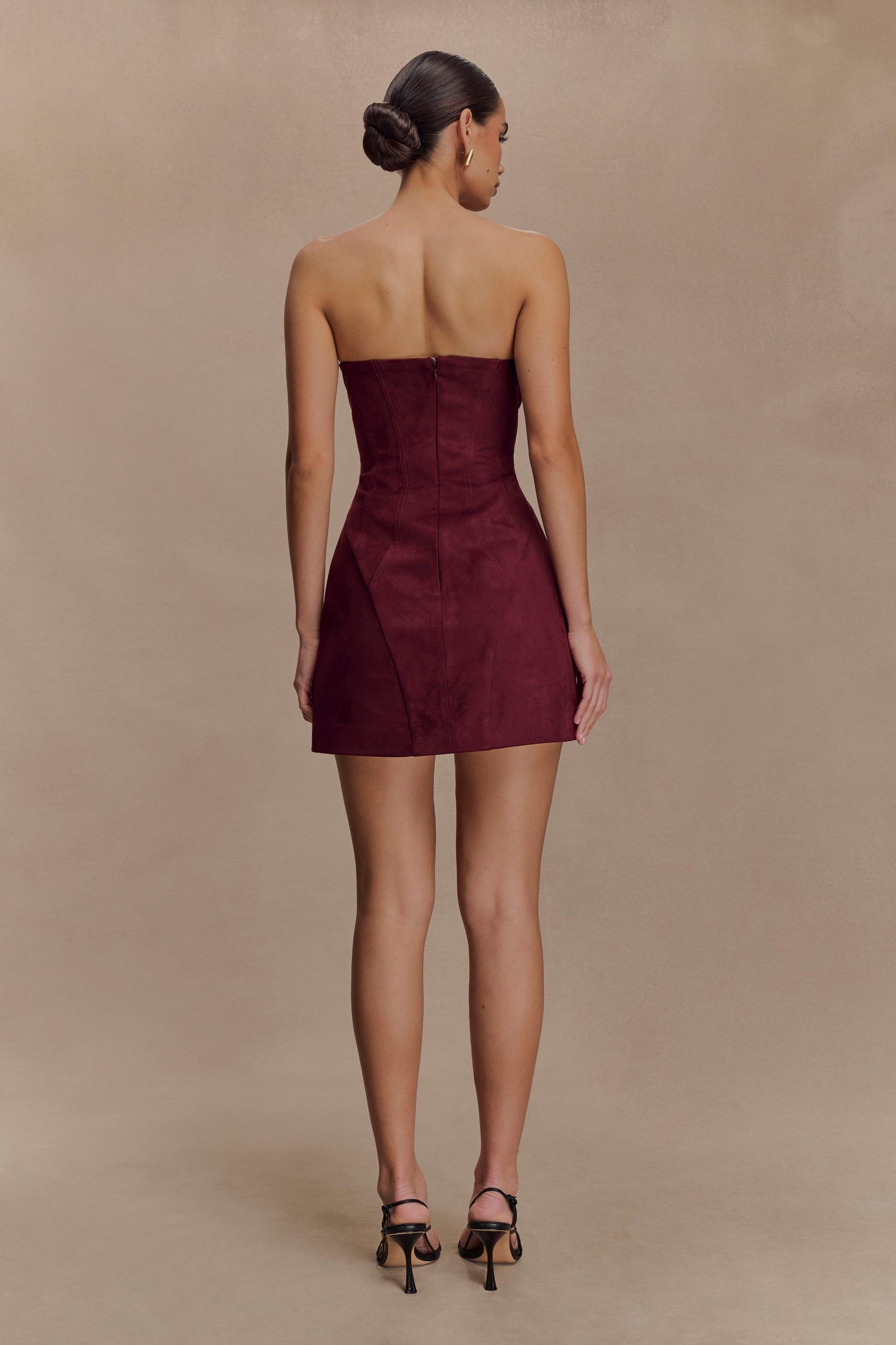 A soft take on strong style. The ANDY Faux Suede Mini Dress delivers sleek structure with a soft touch. Designed in a luxe faux suede, this strapless mini features curved topstitched lines and waist seams to enhance and define your shape. An internal grip tape keeps the neckline secure, while the invisible zip offers a smooth finish. Fully lined for comfort and cut in a bodycon silhouette, this dress is your go-to for effortless sophistication—day or night.