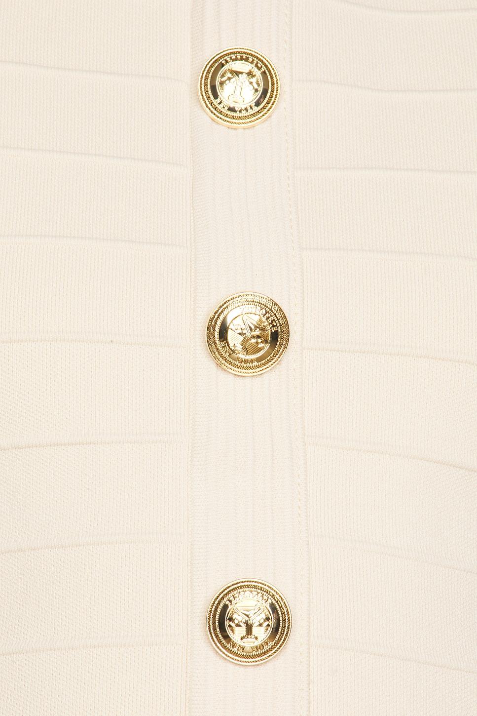 63% rayon, 34% nylon, 3% spandex. Hand wash cold. Unlined. Hook and eye clasp at halterneck and back zipper closure. Decorative front buttons. Midweight knit fabric with godet hem design. Made in China. Revolve Style No. ROFR-WD971. Manufacturer Style No. R-SS25-11298-17.