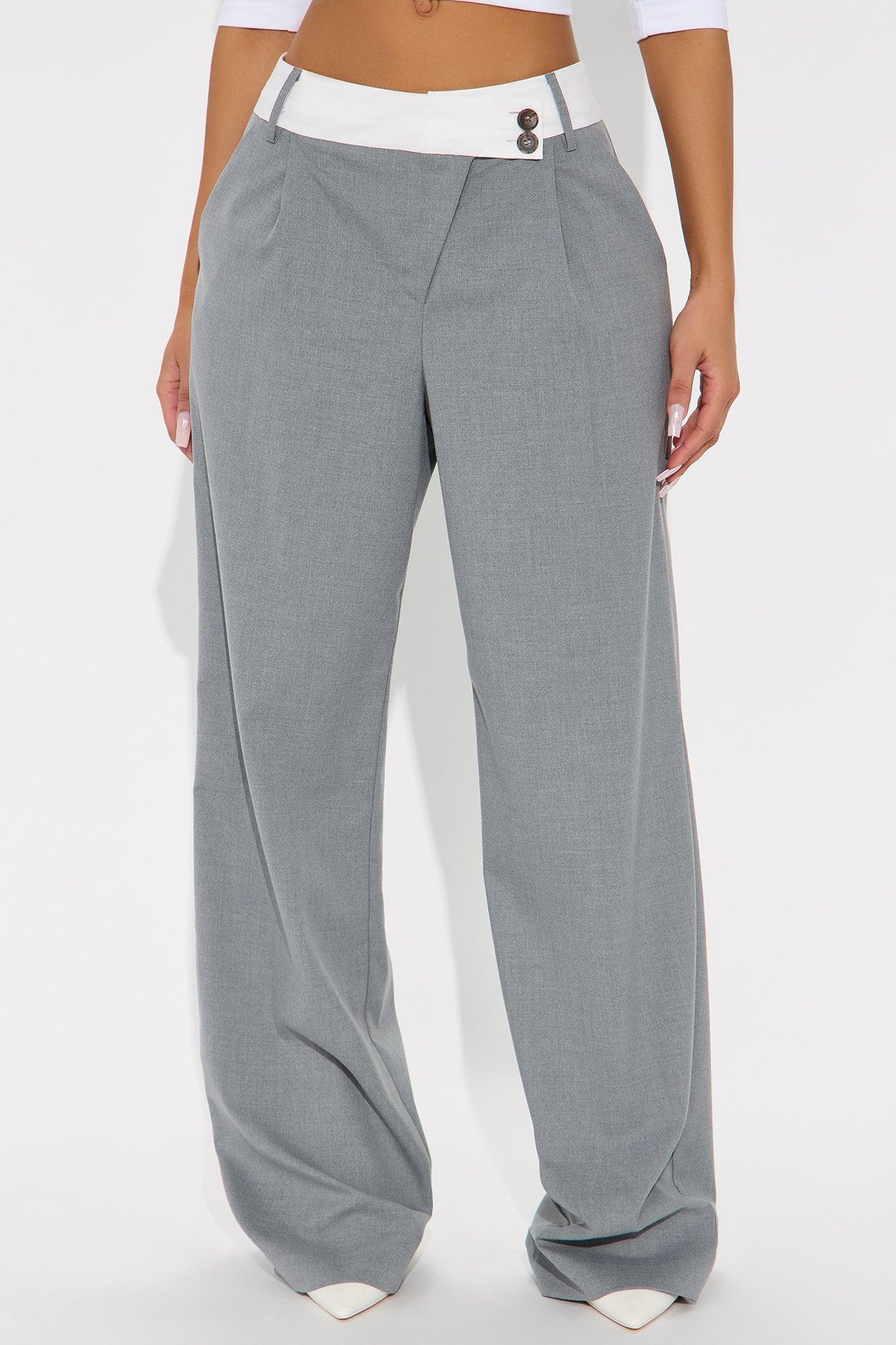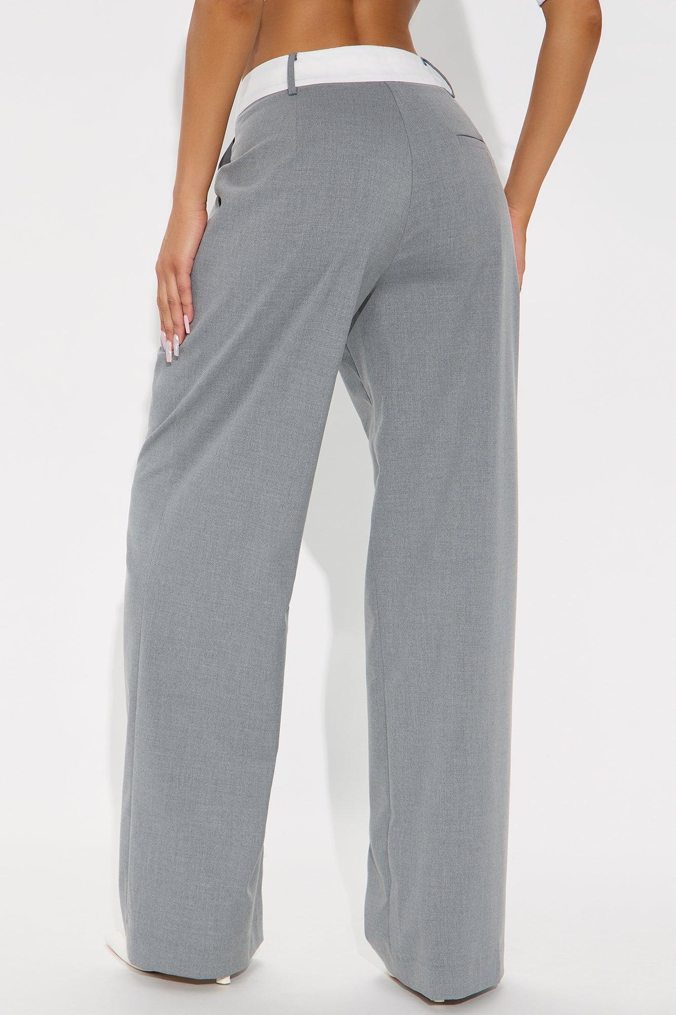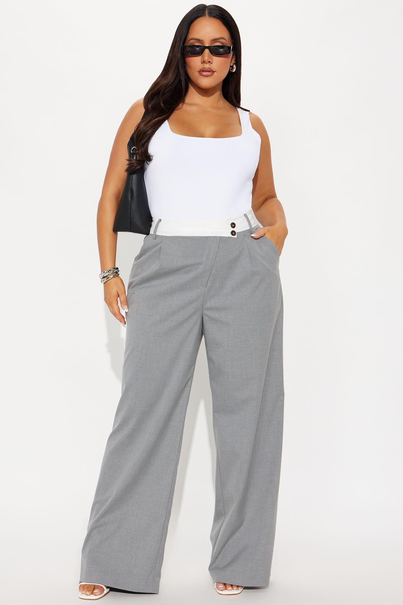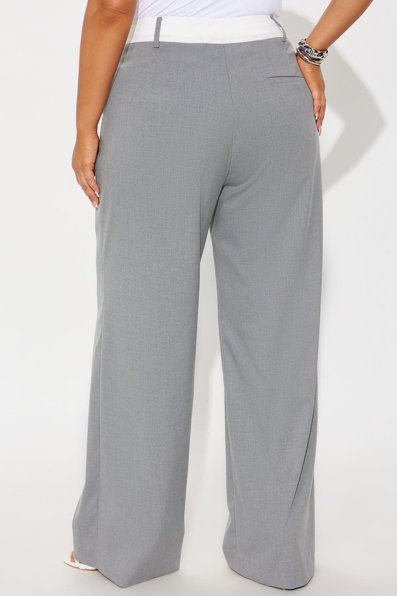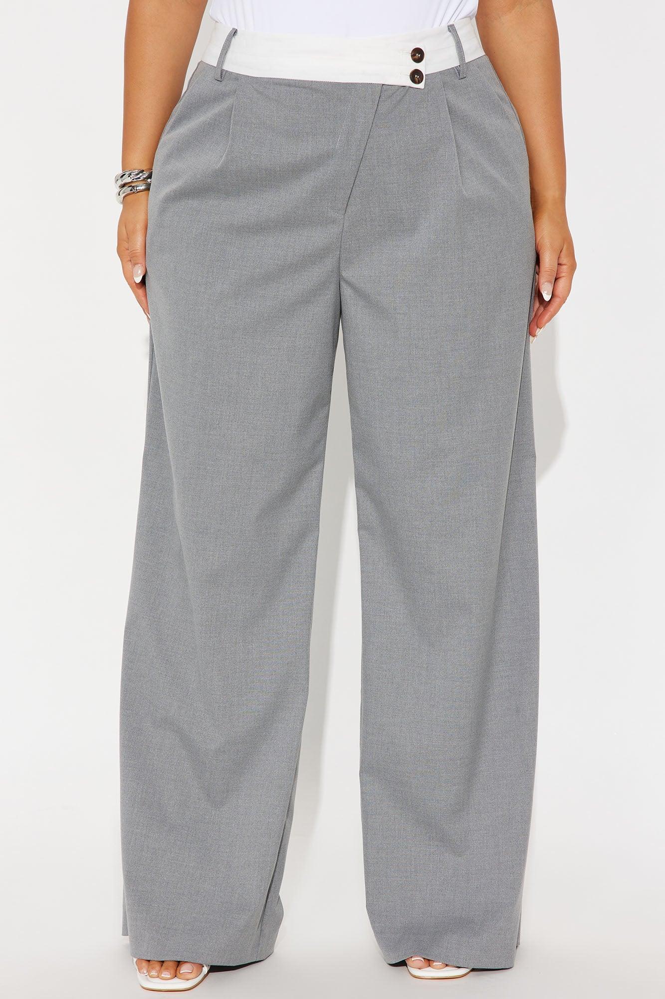 Available In Grey. Wide Leg Trouser Non Stretch Regular 33" Inseam High Rise Crossover Contrast Waistband Button And Zipper Closure Hand Pockets Back Pocket Self: 69% Polyester 29% Viscose 2% Spandex Contrast: 65% Polyester 35% Rayon Lining: 97% Polyester 3% Spandex Imported