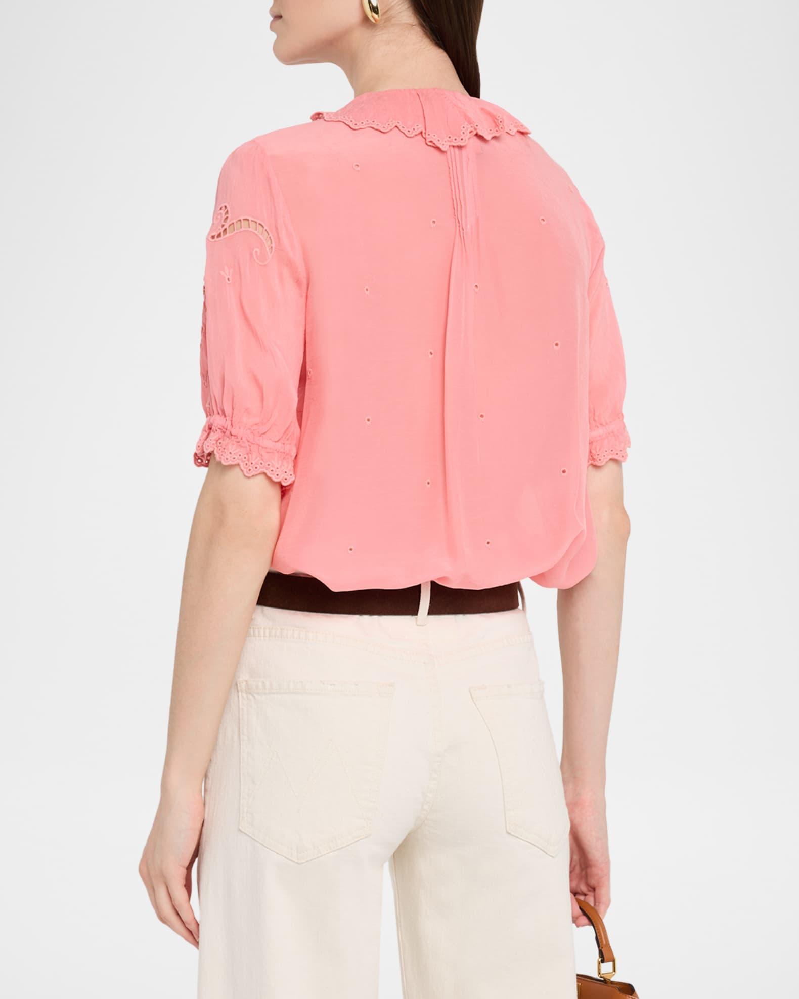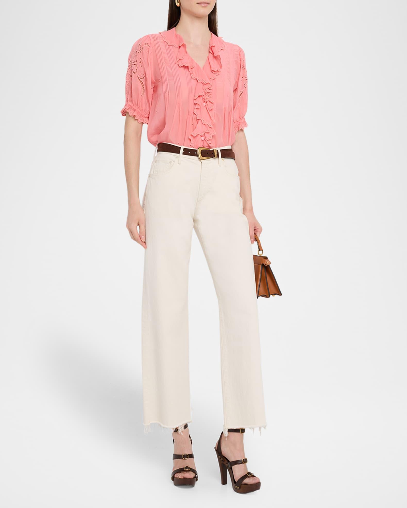 Johnny Was "Anette" puntuck blouse detailed with ruffles and eyelet embroidery V neckline; button front Elbow sleeves Elasticized ruffle cuffs Scalloped hem Relaxed fit Cupro Machine wash Imported Please note: This merchandise may have a distressed effect. It is a unique feature that enhances the product and is not considered a defect.