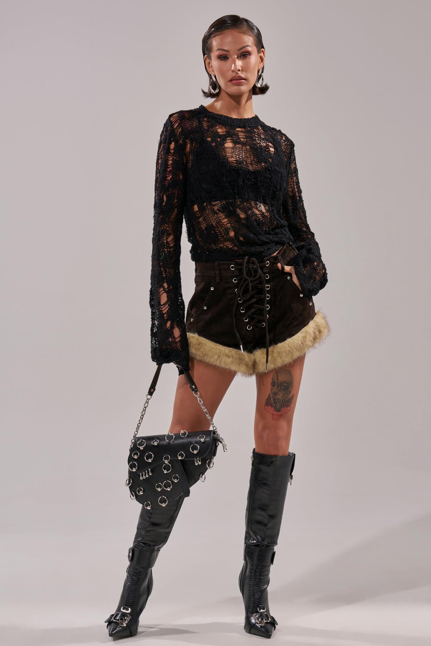 Look absolutely heavenly in The AKIRA Label Angel Of Mine Denim Lace Up Short. Crafted from a semi-stretchy denim with a velvety finish, these bottoms feature a high-rise fit, functional belt loops, dual side pockets lined with silver-stud detailing, fluffy faux fur trim lining the hemlines, and a lace-up front closure. Complete with a mini-length fit. Pair with a corset and moto boots for anything but an angelic finish. - 70% Cotton 28% Polyester 2% Spandex- Spot Clean Only- Slight Stretch- Imported (all measurements approximate from size small)- 11” Rise- 3” Inseam- Model is 5’7” and is wearing size smallProduct ID: 1072097 (all measurements approximate from size 1X)- 13” Rise- 3” InseamProduct ID: 1072101