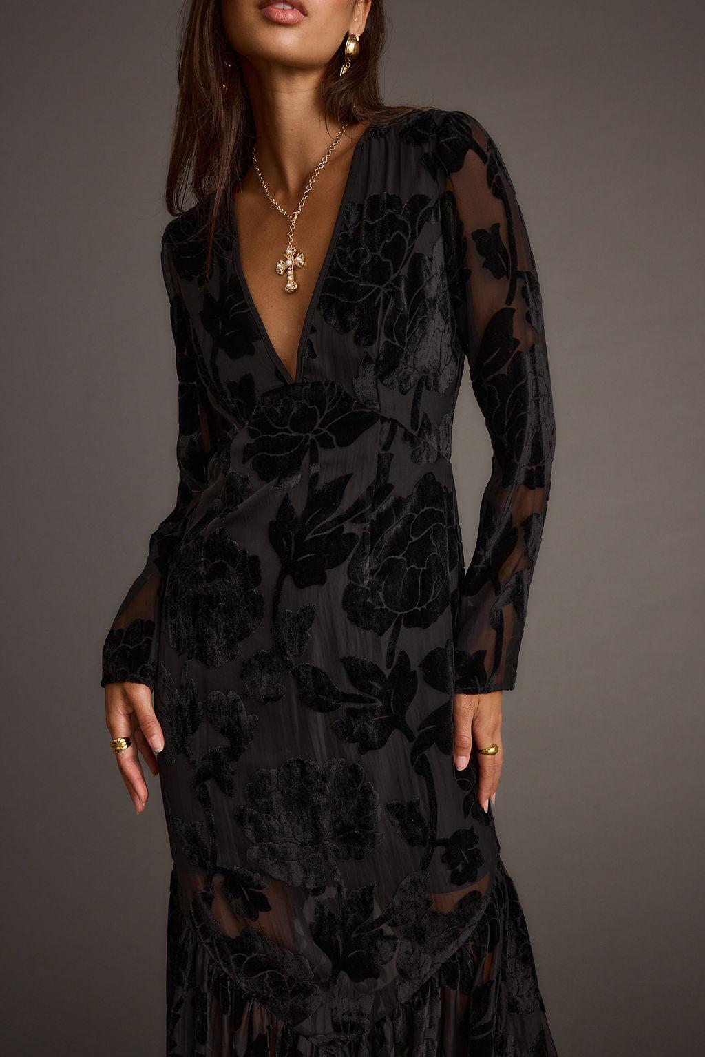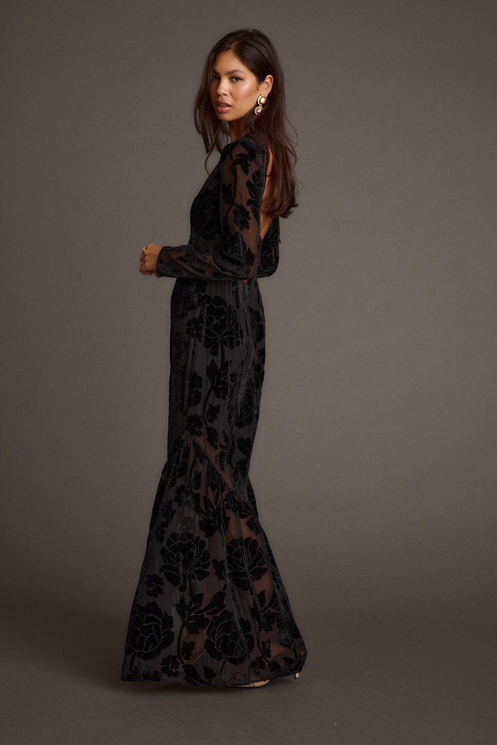 Cold weather, hot looks - the Angela Black Velvet Burnout Long Sleeve Maxi is the subtly sexy number perfect for your next holiday party. This maxi features a sheer burnout velvet drop skirt, plunge v-neckline and open back that’s giving us dark romance and elegance. Add your favorite heels and we already know is going to look gorgeous on you.