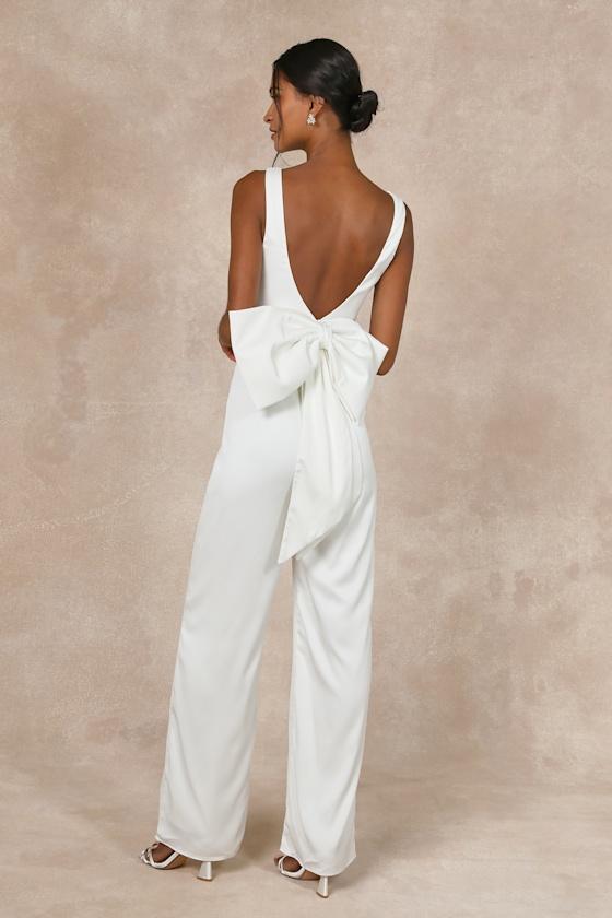 The Lulus Angelic Aesthetic Ivory Satin Bow Back Sleeveless Jumpsuit will have you looking absolutely heavenly! Sleek woven satin shapes this stunning jumpsuit that features a V-neckline (and back), a princess-seamed bodice, and wide straps. High, banded waist tops flowy straight-leg pants that fall to ankle-length hems. An oversized removable bow at the back secures with snaps to create an ultra-chic finish. Hidden back zipper/clasp.